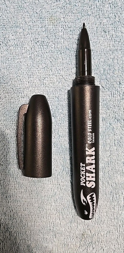 The Cold Steel Pocket Shark 6.6 Permanent Marker is a self-defense tool made of high-impact plastic. It is designed to be easily carried and can be clipped to a purse for convenience. The marker is black and features the Cold Steel brand name. It is an original product made in Taiwan and is not a handmade or vintage item. The marker is not personalized and is not a modified or collectible pen.