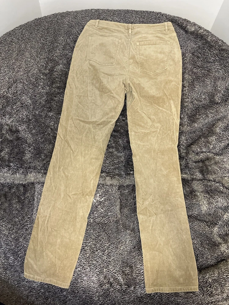 Elevate your wardrobe with these stylish and comfortable Coldwater Creek Whisper Corduroy Trouser Pants. These pants feature a flat front and a bootcut leg opening, with a high rise of greater than 10.5 inches. The pants are made of a spandex and cotton blend fabric, which provides a comfortable and stretchy fit. The pants come in a beautiful beige color and have five-pocket accents with button and zipper closures. The pants are perfect for any occasion, whether it be for travel, workwear, or a casual day out. The pants also have belt loops for easy styling. Add these pants to your collection for a classic and preppy look.