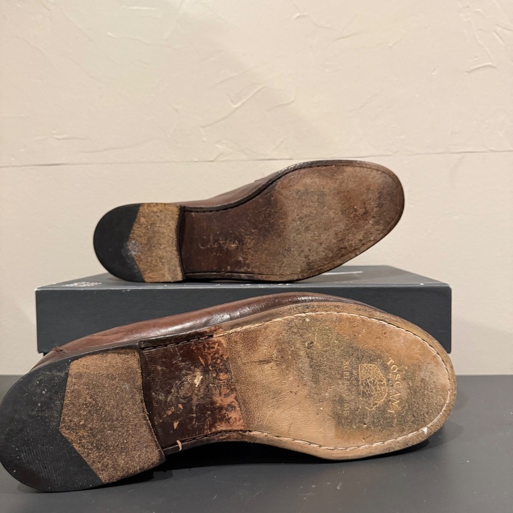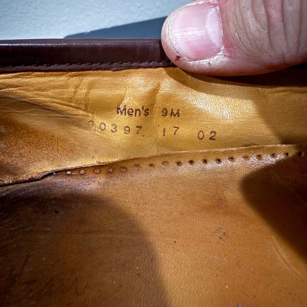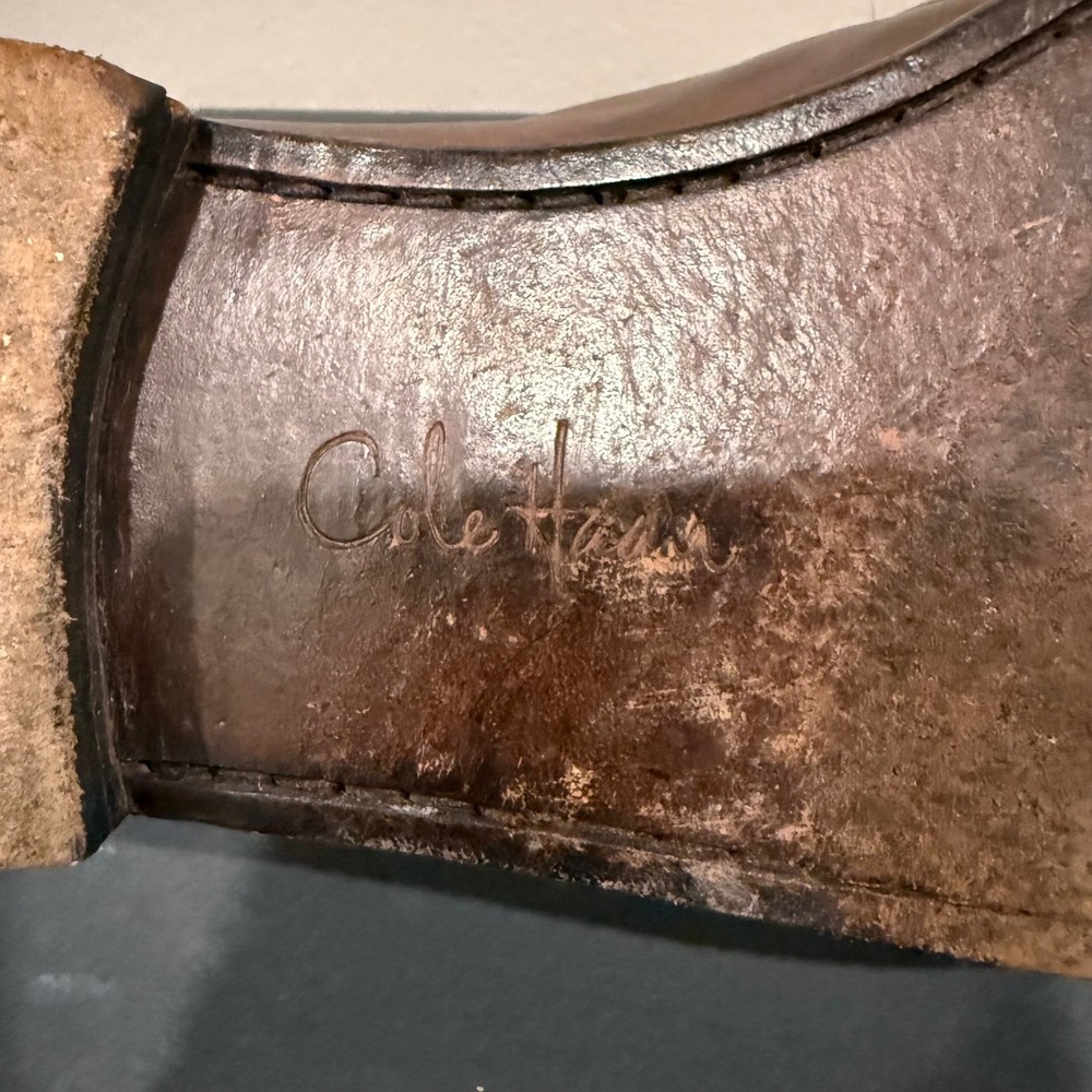 Elevate your style with these sophisticated Cole Haan loafers. A masterful blend of classic design and enduring comfort, these loafers showcase a rich brown leather upper, accented with a striking gold-tone horsebit detail. These shoes are perfect for adding a touch of refinement to your business-casual attire, a touch of elegance for a dinner date, or completing a polished look for a weekend brunch. Department: Men Upper Material: Leather Pattern: Solid Features: Comfort Shoe Width: M Outsole Material: Leather Insole Material: Leather Model: Cole Haan Type: Dress Keywords: Cole Haan loafers, men's loafers, brown leather loafers, horsebit loafers, men's dress shoes, size 9M, classic loafers, vintage loafers, leather shoes, slip on shoes, designer loafers, pre owned loafers, Cole Haan men's shoes, Brown shoes