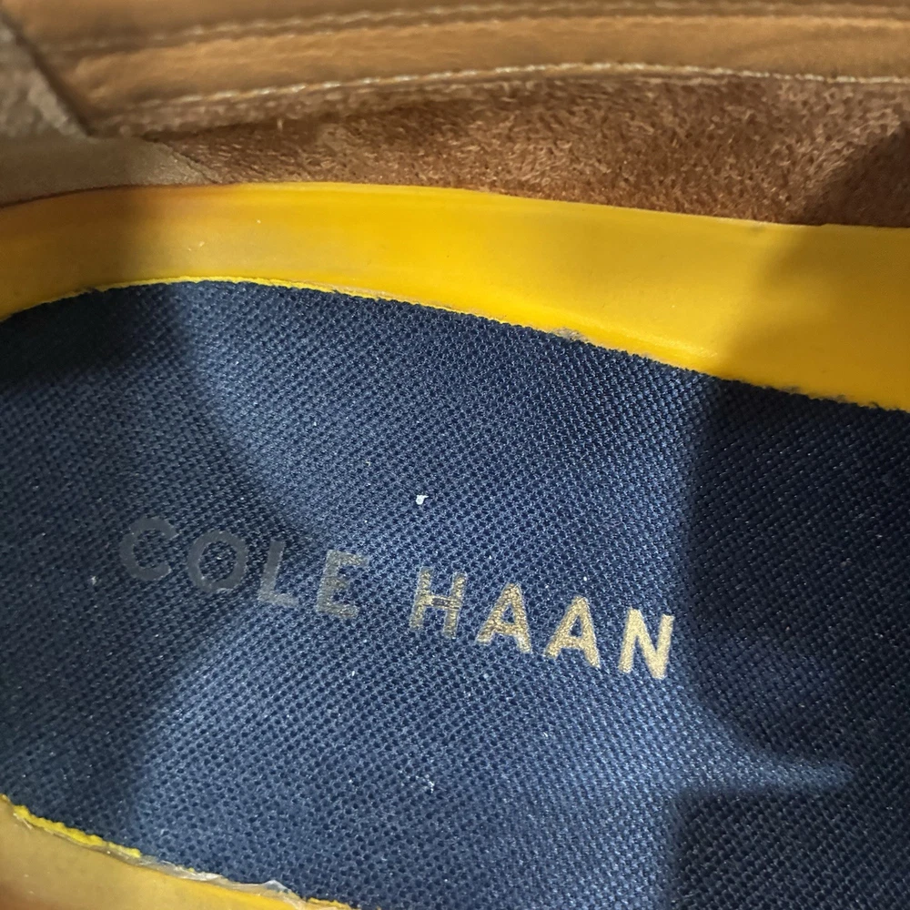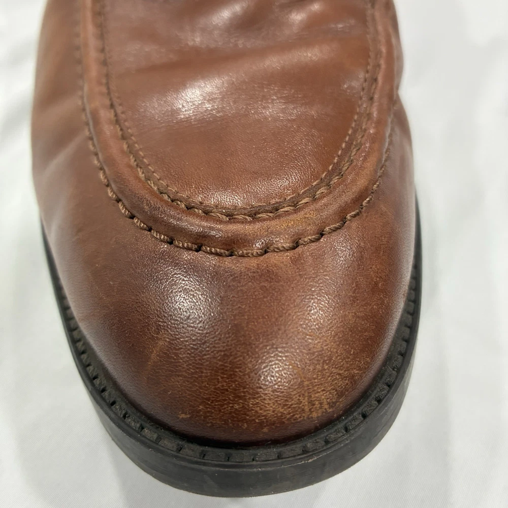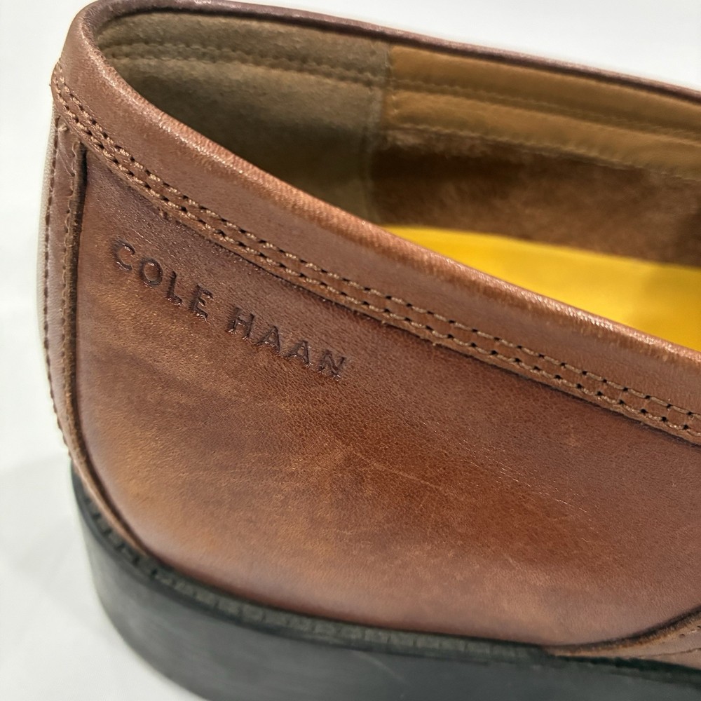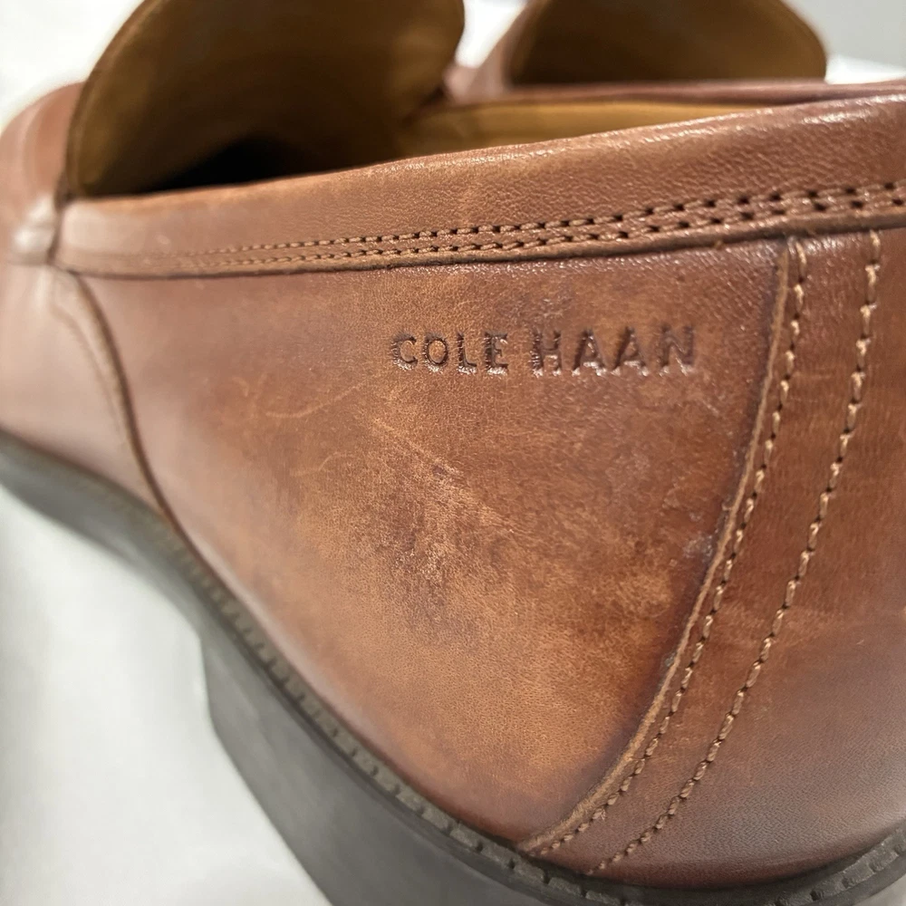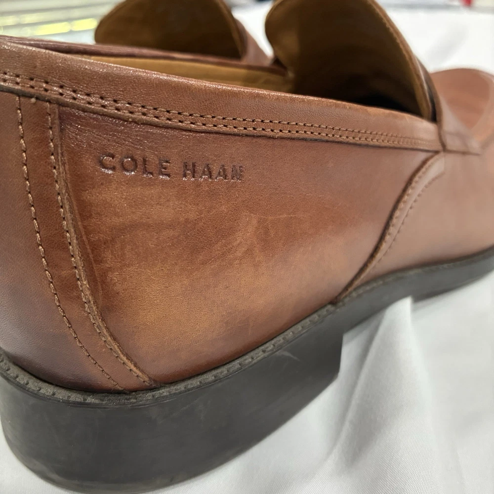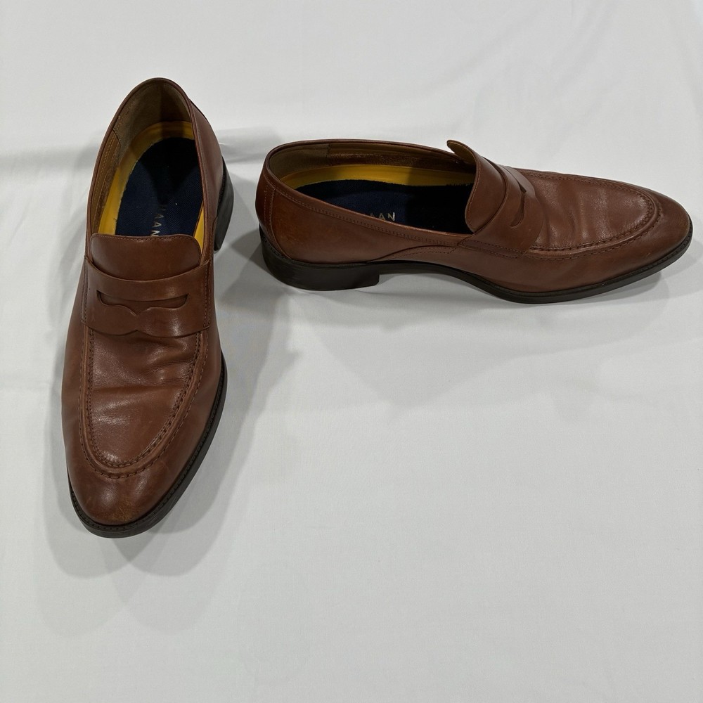 The Cole Haan Classic Hawthorne Brown Penny Loafers in size 11 for men are a stylish and versatile choice for dressy occasions. Made from 100% leather, these solid brown loafers feature a cushioned insole for added comfort. The timeless penny loafer style is perfect for the seasons of summer, fall, and spring, making them a classic addition to any man's wardrobe.