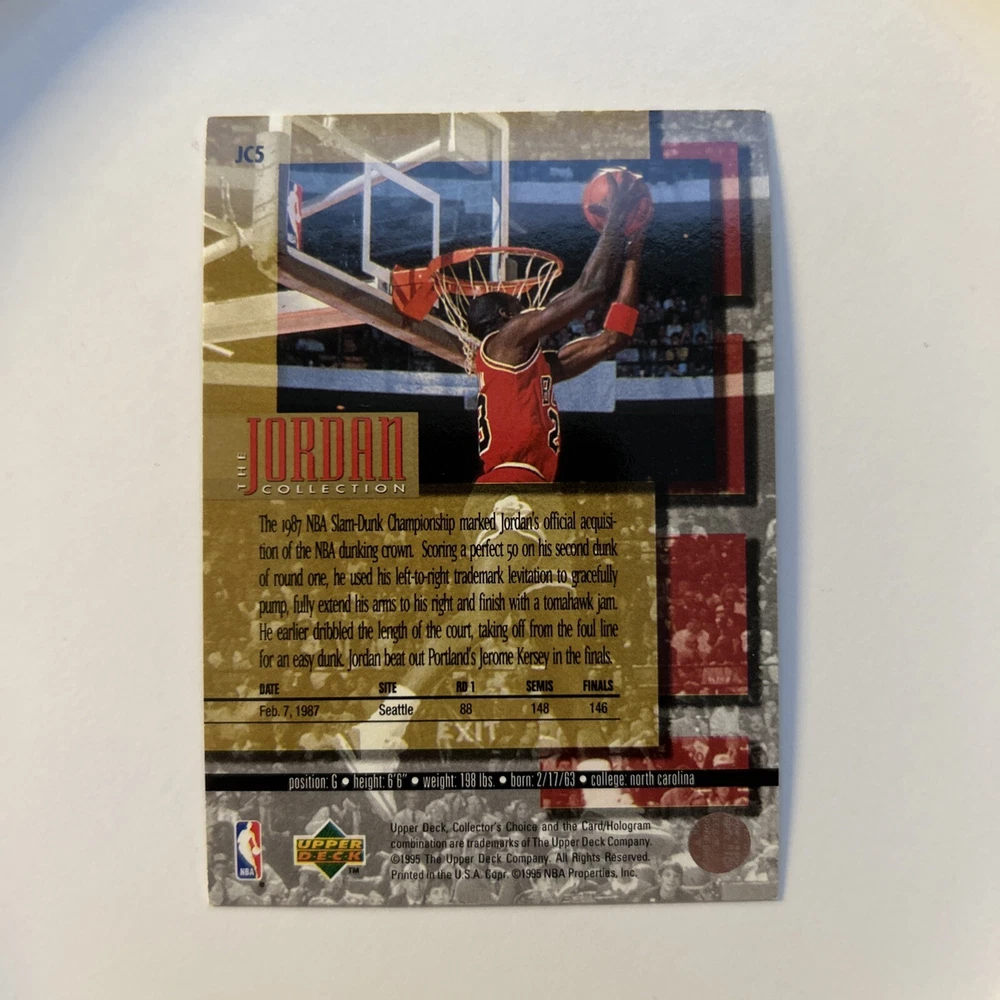 This card is in mint condition! Would be graded as a 10. This 1995 Upper Deck trading card is a must-have for any Michael Jordan fan or collector. The card features a stunning image of Jordan in his Chicago Bulls uniform, with the words "Slam Dunk Champion" and "1987" prominently displayed. This card is a near mint or better quality, and is an original, licensed reprint. The card is part of the Jordan Collection set and is a collectors edition insert. It is made of high-quality card stock and has a standard size. This card is perfect for displaying or adding to your sports trading card collection. Don't miss out on the opportunity to own a piece of basketball history with this 1995 Upper Deck Michael Jordan trading card.
