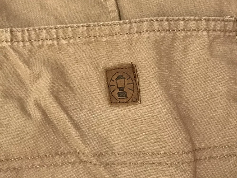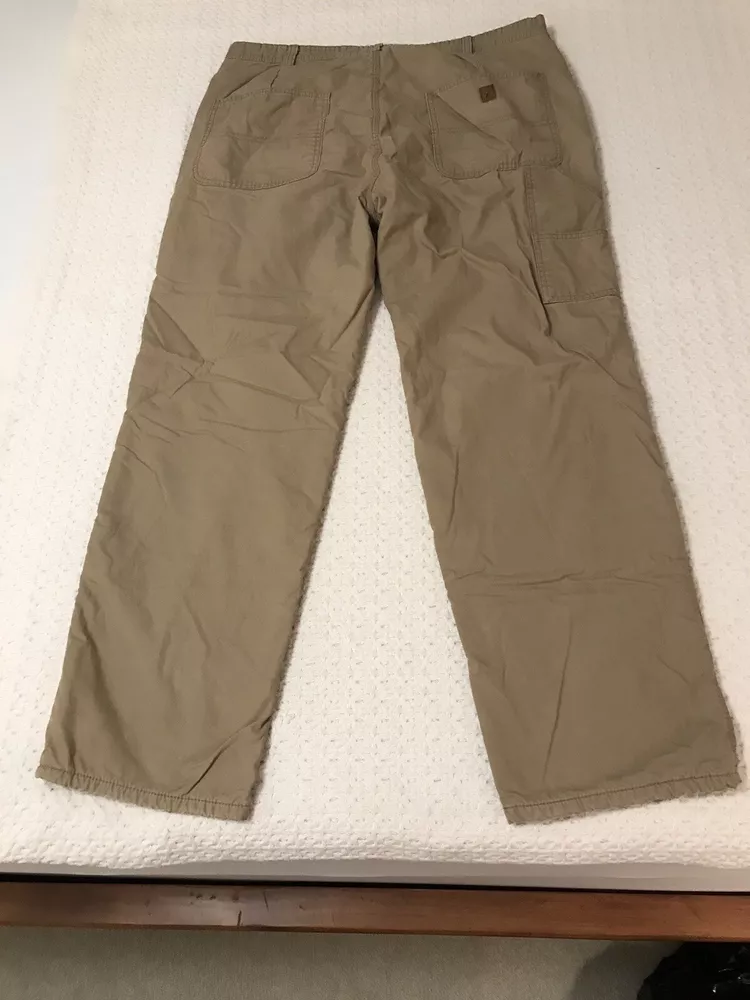 These Coleman work pants are perfect for any outdoor adventure, whether it be hiking, trekking, camping or just enjoying nature. The pants are made of a comfortable and durable polyester-cotton blend with a solid pattern and a fleece lining to keep you warm during the colder seasons. The 5-pocket design provides ample storage for all your belongings and the flat front and straight leg style offer a classic and versatile look. The pants have a zip closure and a waist size of 38 inches, with an inseam of 30 inches. Garment tag shows an inseam of 32 inches, but the measurements show an actual inseam of 30 inches. Rise is 12 inches. They come in a khaki tan color and feature easy care and comfort, making them suitable for travel, casual wear and workwear occasions. This is a great addition to any outdoor enthusiast's wardrobe. In a smoke free home. No tears or holes.