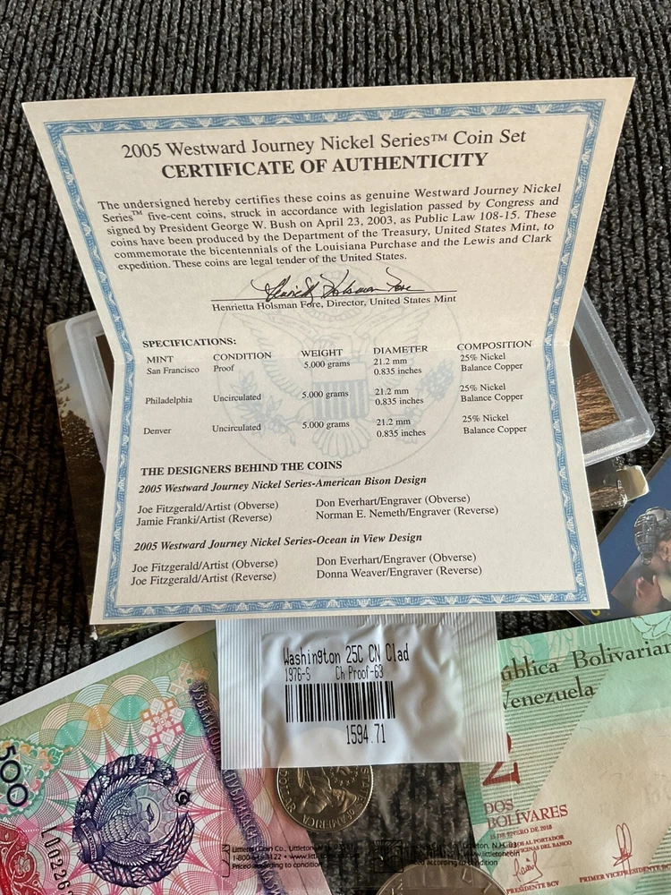 Great lot 2005 US mint Westward Journey nickel series P,D,S. IT’S A BEAUTIFUL COLLECTIBLE. 1976S proof Washington quarter in cello. Currency coins and stamps great for any collector.