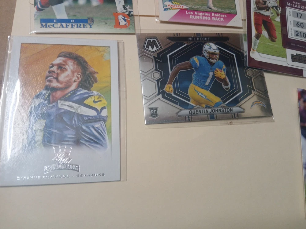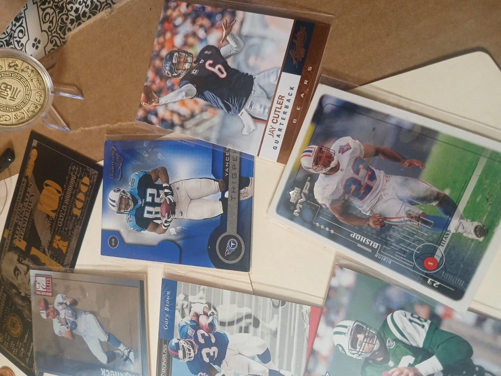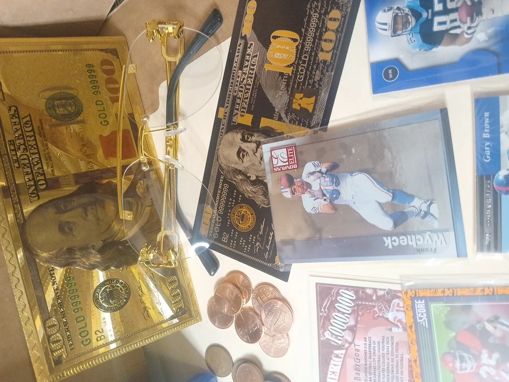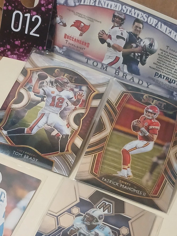 Lot#12 is a football Lot with 21 cards different players and teams like Tim Brady Patrick Mahomes Barry Sanders Jevon Kearse and more 2023p JFK 1978 Eisenhower and other coins