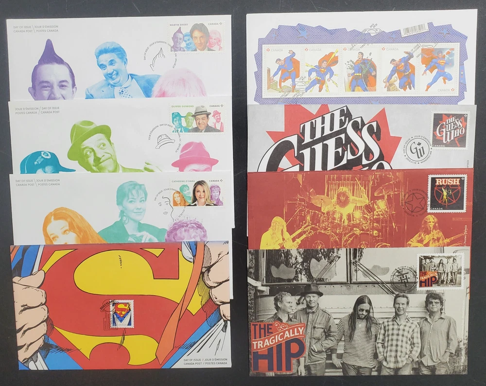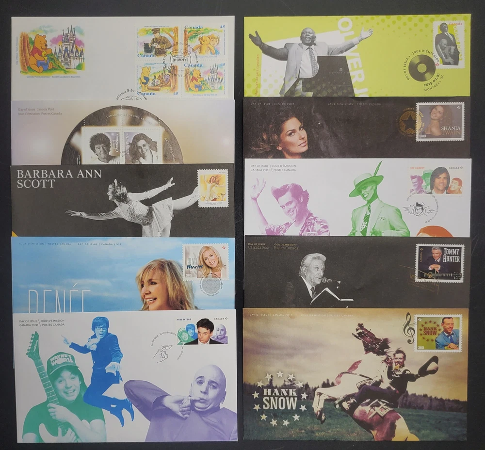 Collection of 28 Canada Modern Famous People FDCs. This collection includes 28 different First Day Covers themed around Canadian stars of Music, TV, Movies, Sports, and Astronauts. Most of these covers are dated 2011-2014 with a few being from the 2000s and late 90s. These beautiful, colorful covers are way below original cost! ***** Email us about signing up for our mailing list******* Exciting new items every day Philately - The Quiet Excitement Shipping We try to Ship Within 5 Business Days of Cleared Payment Will calculate international shipping PLEASE READ International Buyer's Shipping Instructions International shipping "" First Class Registered ENVELOPE " NO EXCEPTIONS ! ** Insurance, Registered mail or Confirmation/Signature Guarantee is included in the price of shipping for the USA only ** Our goal is to please our customers, provide quality and unique items, have successful transactions and earn positive feedback with a 5 star rating. We strive for accurate descriptions, quick turnaround, detailed communication, and reasonable shipping charges on every lot. Your feedback is important to us. If you feel anything about the transaction was less than 5 star, please give us the opportunity to rectify the situation Thank you The Staff at Henry Gitner Philatelists, Inc.