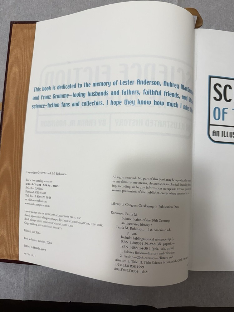 Dive into the expansive world of science fiction with the "Collectors Press Science Fiction of the 20th Century" edited by Frank M. Robinson. This leather-bound collector's item, is a must-have for enthusiasts seeking a comprehensive journey through the genre's Golden Age. Each page is adorned with stunning illustrations that bring the tales to life, complementing the rich tapestry of storytelling. Oversized and meticulously crafted, this reference book is not just a collection of stories; it's a celebration of science fiction literature, making it a prized addition to any bibliophile's shelf.