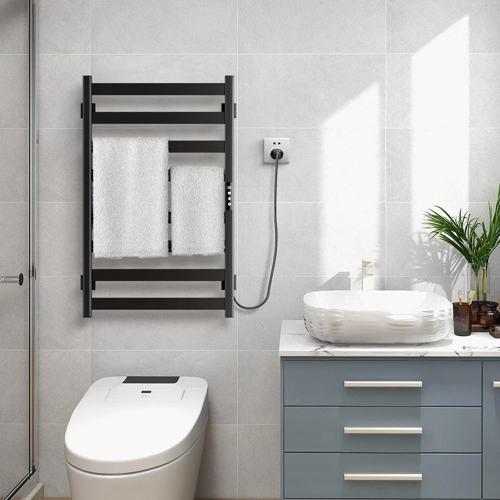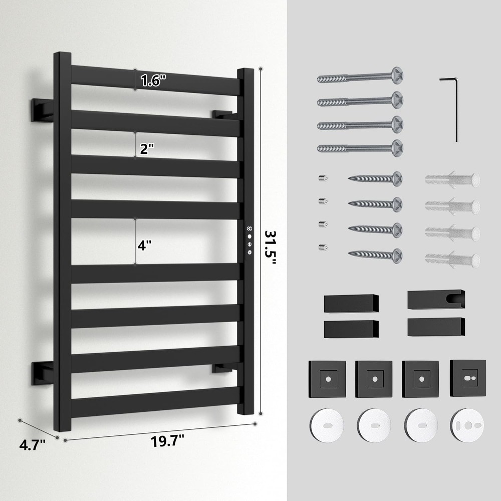 Product Parameters Outlet: 110-120 V/60 Hz Power consumption: 110 Watts Material: High quality 201 stainless steel Size: 31.5*19.7*4.7 inches Finish: Matte black coating Heating Temperature: 122-131 ℉ Water Protection Rating: IPX5 Net Weight: 8.3 pounds Usage: Home Bathroom,Hotel,and Spa etc 【Function Upgrade】The heated towel rack is made of 201 stainless steel, and has an electrostatic black coating on the surface, which has excellent rust and corrosion resistance, high-quality waterproof electric heating elements, and the waterproof level reaches IPX5. Built-in visual timer and temperature control switch. The time can be set from 1 hour to 9 hours or always on (0H). 【Fast Heating】After turning on the heated towel rack, it will heat up in 5 minutes and reach the optimal temperature of 122-131℉ within 20 minutes. The towel rack has a built-in overheating protection function, which will not overheat the heating rod and burn you or cause the towel to be scalded. You and your family will get comfortable towels after showering. 【Energy & Space Saving】 The towel heater has a very low consumption rate, so you don't have to worry about paying too much electricity. This is a wall-mounted, hard-wired and plug-in(60in. power cord) towel heater that you can install on the wall. Its design maximizes your floor space. Its modern style makes it suitable for your home, hotel, spa and pool etc. 【Easy to Instal】Hardwired and plug-in two wiring methods. All necessary hardware and tools are included in the package and it is very easy to assemble using our manual. The towel heater is powered by a standard power socket (rated voltage: AC 120V/60Hz). All of our towel heaters have ETL certification, which provides the highest level of guarantee for your safe use. 【After-sales service】If you have any questions, please feel free to contact us, and we will be happy to assist you.