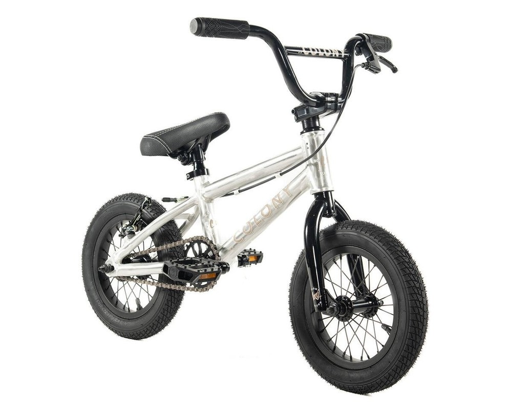 Colony Horizon 12" Built around a light weight alloy frame, coupled with appropriately sized geometry, makes these the perfect bike for the younger, smaller BMXers starting out. Progression & having fun with BMX with come naturally with the Colony Horizon series of BMX bikes. Frame: Colony Horizon 12” 11.9”TT 6061T6 Alloy, 9.4” rear, 75.0º HA, 71º ST, 7.7" Mid BB height, 1-1/8" Integrated Headset. Stand Over Height: 35cm (ground to top of top tube at seat tube) Forks: Colony Horizon 12” Chromoly tapered legs. Handlebars: Colony Horizon 5.0” rise 20.0” wide Chromoly. Grips: Colony Horizon Headset: 1-1/8” Integrated Stem: Colony Horizon Alloy Top Load short reach. Brakes (rear): V-Brake alloy with clear pads. Brake lever (right): Alloy short reach. Cables: Slick (rear). Sprocket: Colony Horizon 25T. Crankset: Colony Horizon Tubular Chromoly 3-pc 90mm. Bottom Bracket: MID sealed bearing. Chain: KMC. Pedals: Plastic. Rims: Alloy Single Wall 28 hole. Front Tire: Family F2128 12” x 2.25”. Rear Tire: Family F2128 12” x 2.25”. Spokes: Black steel. Front Hub: Colony Horizon Alloy, sealed bearing, 10mm axle. Rear Hub: Colony Horizon Alloy, Full sealed bearing cassette, 10mm axle with 9T driver. Seat: Colony Horizon Railed. Seatpost: Alloy 27.2mm diameter. Weight: 7.6 kgs (without training wheels) Note: Bike specification &/or colors subject to vary slightly About Us | View Store