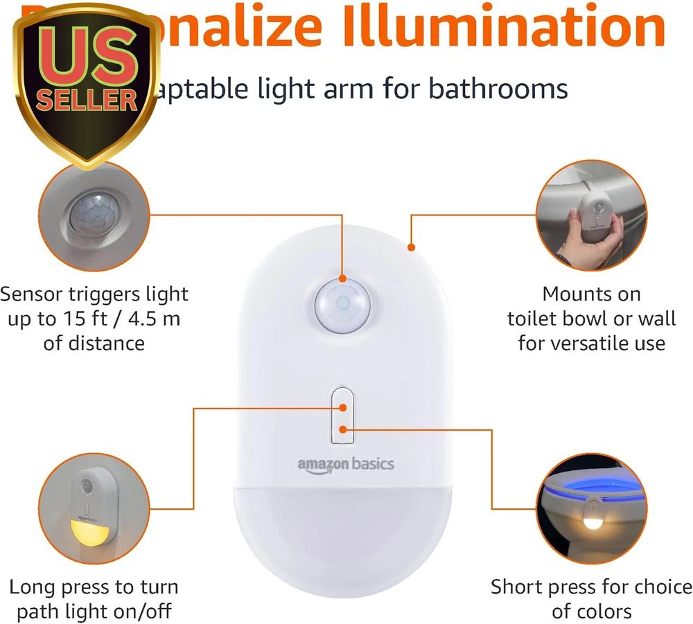 Store New Arrivals Add to Favorite View Feedback Contact Color Changing LED Toilet Bowl Motion Sensor Light, Battery Operated, 2 Pack, White Description Light Source Type LED Item model number 59397 Style Night Light Number of Items 2 Power Source Battery Powered Pattern Solid Control Method Touch Warranty Description 1-year limited. Batteries Included? No Lighting Method LED Lamp Type Night Light Number of Pieces 2 Room Type Bathroom Finish White Battery Cell Type Alkaline Product Dimensions 3.35 x 1.97 x 5.31 inches Material Plastic Controller Type Push Button Finish Type White Specific Uses For Product Night Light Included Components Mounting Hardware Item Package Quantity 2 Country of Origin China Water Resistance Level Not Water Resistant Batteries Required? Yes Item Weight 0.1 Pounds Connectivity Technology No Special Features Cordless, Motion Sensor Special Feature Cordless, Motion Sensor Part Number 59397 Shade Color Multicolor Mounting Type Wall Mount Color White Base Material Plastic Is Waterproof True Recommended Uses For Product Decoration Switch Type Push Button Size White, 2-pack An RGB LED adds a splash of color while the light on the base provides an amber glow; perfect for evening routines, potty training and ambience Automatically turns on when motion is detected within 15 feet and turns off 1 minute after movement stops Use the mode button to choose your favorite color or preset, and to operate the amber guide light Hook onto the bowl or mount the base to a wall; powered by 3 AAA batteries (not included) Product Dimensions: 1.97 x 5.3 x 3.35 inches (WxHxD) Upgrade the way you light your bathroom with the Amazon Basics Color-Changing LED Toilet Light! A low-profile RGB LED hooks under the toilet seat and fills the bowl with light, adding a splash of vibrant, stylish color. To change modes or find your favorite preset, use the push-button control on the base that rests outside of the bowl. The base also has a built-in night light that emits a soothing amber glow, perfect for guiding evening routines. Want to use the light in another location? Simply remove the arm and mount the base on the wall to use it as a motion-sensing night light! Designed for convenience, especially during late-night visits, the light will automatically turn on when motion is detected within 15 feet. It will also turn off 1 minute after you leave, or after motion is no longer detected. Wire free and hassle free, the toilet light is powered by 3 AAA batteries (not included). The Amazon Basics Color-Changing LED Toilet Light is a fantastic lighting solution for any bathroom; convenient, colorful and fun! ABOUT US We offer the best prices around on high quality products. Our E-store includes media such as books, movies, music and games while offering electronics, toys, sporting apparel, clothing, tools, general home, garden items and more. SHIPPING We are always working hard to ensure your package arrives as soon as possible. Please understand that some factors like weather, high postal traffic, and the performance of shipping companies are outside of our control. We offer free shipping to the lower 48 states and ship within 2 business days of payment, usually sooner. We do not accept P.O. Boxes. Please provide a physical address. For shipping outside of the continental USA, we only use eBay's Global Shipping Program.The item is shipped to KY and then sent to the rest of the world. International customers are responsible for all duties and taxes. Continue to check out in order to calculate costs for shipping the item to your country. Messages regarding eBay's Global Shipping Program MUST be directed at eBay EXCLUSIVELY. RETURNS We offer a 30-Day Return Policy on items which you are not completely satisfied with. You have the option for a full-refund or an exchange of the item. No returns are available on items shipped outside of the USA. PAYMENT We accept PayPal. CONTACT US This page content is yet to come Please ad us to your favorite seller and visit again later Thank You CUSTOMER SATISFACTION We try our very best to make sure every customer is completely satisfied. If there's a problem, message us! We're happy to help. WE ACCEPT Copyright © 2021 AutoDS. | All Rights Reserved