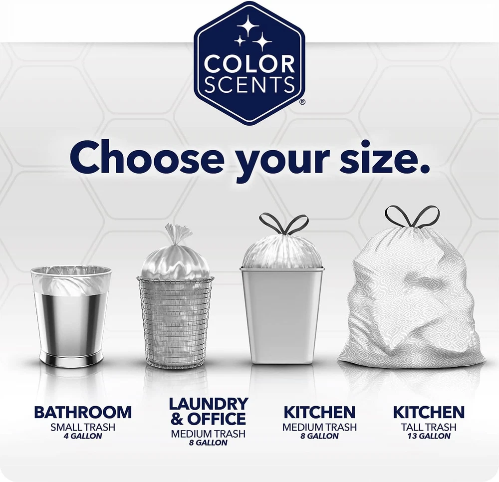 Color Scents Small Trash Bags - 4 Gallon, 80 80 Count (Pack of 1), Purple Product Details Brand: Color Scents Capacity: 4 Gallons Unit Count: 80.0 Count Recommended Uses For Product: Bathroom Trash, Kitchen Waste Material Feature: Toxin Free Color: Purple Material: Plastic Item Form: Bag Scent: Lavender Number of Items: 1 Item dimensions L x W x H: 3.25 x 3.25 x 6 inches Manufacturer: Color Scents Part Number: 1945175 Item Weight: 8.8 ounces Product Dimensions: 3.25 x 3.25 x 6 inches Country of Origin: USA Item model number: 1945175 Size: 80 Count (Pack of 1) Style: Waste Bag Item Package Quantity: 1 Included Components: Can Liner Batteries Included?: No Batteries Required?: No Brand: Color Scents Capacity: 4 Gallons Unit Count: 80.0 Count Recommended Uses For Product: Bathroom Trash, Kitchen Waste Material Feature: Toxin Free Color: Purple Material: Plastic Item Form: Bag Scent: Lavender Number of Items: 1 4 GALLON LAVENDER SCENTED WASTE BAG: 80 count, lavender plastic, twist tie trash bags in lavender scent NEW! TREATED WITH MICROBAN: Antimicrobial product protection, neutralizes odor-causing bacteria on the bag TWIST TIE CLOSURE: The quick and easy twist tie closure secures the bag and makes for simple removal, keeping all trash inside LAVENDER COLOR WASTE BAG WITH A LAVENDER SCENT: Add a pop of color with our lavender liner. Reminiscent of fresh lavender fields kissed by early morning rain. Inhale calmness of lavender. GARBAGE CAN LINER: Ideal for collection of lightweight trash such as shredded paper, tissue and other light weight, non-sharp waste. Also great for pet waste clean-up and a helpful addition to your diaper bag SMALL GARABAGE BAGS: Perfectly sized to manage life's small messes in your bathroom, bedroom, and car. They're also the perfect size to help keep you organized while on-the-go. Color Scents 4-gallon small trash bags are perfectly sized to handle life's small messes. For use in the bathroom, bedroom, or any room around the house where a small bin is used. Our lavender scent is delicate and delivers subtle bursts of fragrance to help maintain an inviting smell while combating unwanted odors. Add in a pop of color with our home decor complementing colors and voila, your house is a home!