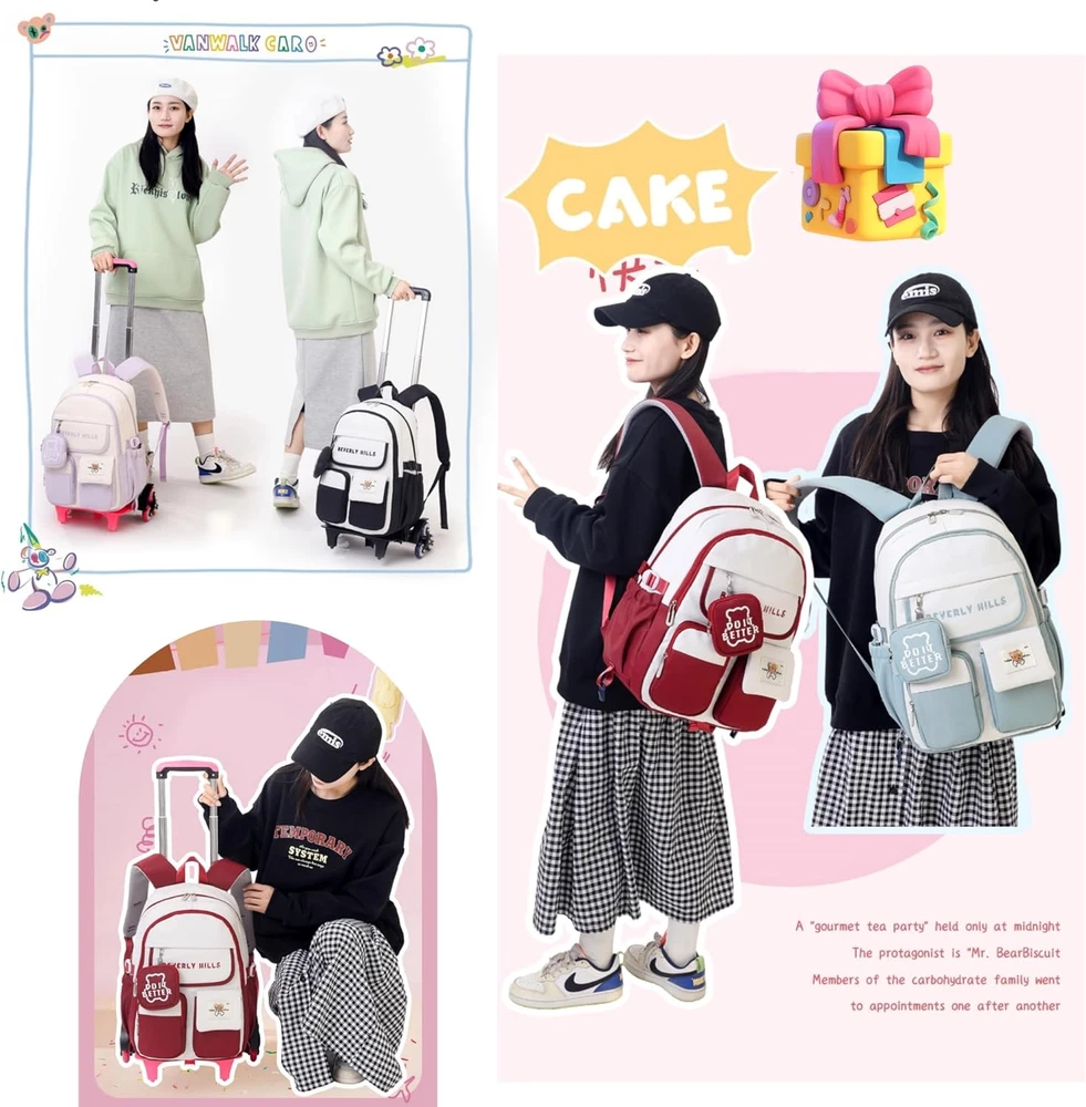 Color-blocking Girls Rolling backpack size:29(L)*18(W)*45cm(H); 11.41(L)*7.08(W)*17.71(H) inches,Package includes:1 * Backpack, 1 * trolley only Trolley Bookbag Large Capacity:1 large main pocket, 1 secondary pocket,3 front pockets can hold small items,1 velcro front pocket,2 Side pockets with adjustable buckle.Your child will definitely love the scientifically reasonable pocket and compartment design. Removable Roller Backpack Set:The Trolley School Bag can be a trolley or just an ordinary backpack. If your child doesn't want a trolley, just remove the rolling platform and it becomes an ordinary school bag.Two wheels Suitable for flat roads, six wheels can climb stairs,Aluminum alloy trolley has three layers of height can be adjusted according to the height of the child. Perfect Comfortable Backpack: This school bags boys made of water-resistant,tear-resistant nylon fabrics,helping to protecting your kid's belongings against rain drops in rainy days. The rolling bookbag has double zippers, smooth and non-snagging. The rolling backpack is ergonomically designed,Padded back panel much closer to body,very comfortable, Backpack is your best choice. Suitable for various occasions:The large capacity girls rolling backpack with wheels, easy to transport and carry.The bookbag has multiple colors to choose, and suitable for a wide range of people. The school backpack is a "must-have" for back-to-school season and good Christmas Day, New Years Day,Halloween or Birthday gift.If you have any questions, please feel free to contact us. Product Description rolling school bag for kids The video showcases the product in use. The video guides you through product setup. The video compares multiple products. The video shows the product being unpacked. Girls rolling backpack 2 Wheels &6 Wheels Rolling Backpack Large Capacity Rolling Backpack for Girls School Bag with Wheels Perfect Gift More Rolling Backpacks to Choose Add to Cart Add to Cart Add to Cart Add to Cart Add to Cart Add to Cart Customer Reviews 4.2 out of 5 stars 213 4.3 out of 5 stars 54 4.9 out of 5 stars 19 4.7 out of 5 stars 65 4.9 out of 5 stars 19 4.3 out of 5 stars 127 4.3 out of 5 stars 54 Price $39.99 $ 39 . 99 $39.99 $ 39 . 99 $42.99 $ 42 . 99 $20.77 $ 20 . 77 $42.99 $ 42 . 99 — $39.99 $ 39 . 99 Backpack Size 12.6(L)*9.4(W)*18.1(H) inches 12.2(L)*7.4(W)*18.89(H) inches 11.4(L)*7.08(W)*17.7(H) inches 12.99 L*7.48 W*18.5 H inches 11.4(L)*7.08(W)*17.7(H) inches 17.71H*12.59L*7.87W inches 17.71H*13.77L*5.11W inches For the crowd Girls & Boys Girls & Boys Girls & Boys Boys Girls & Boys Girls & Boys Girls & Boys Reflective strip ✘ ✘ ✘ ✘ ✘ ✘ ✘ Elementary ✔ ✔ ✔ ✔ ✔ ✔ ✔ Backpack set ✘ ✘ ✘ ✘ ✘ ✔ ✘