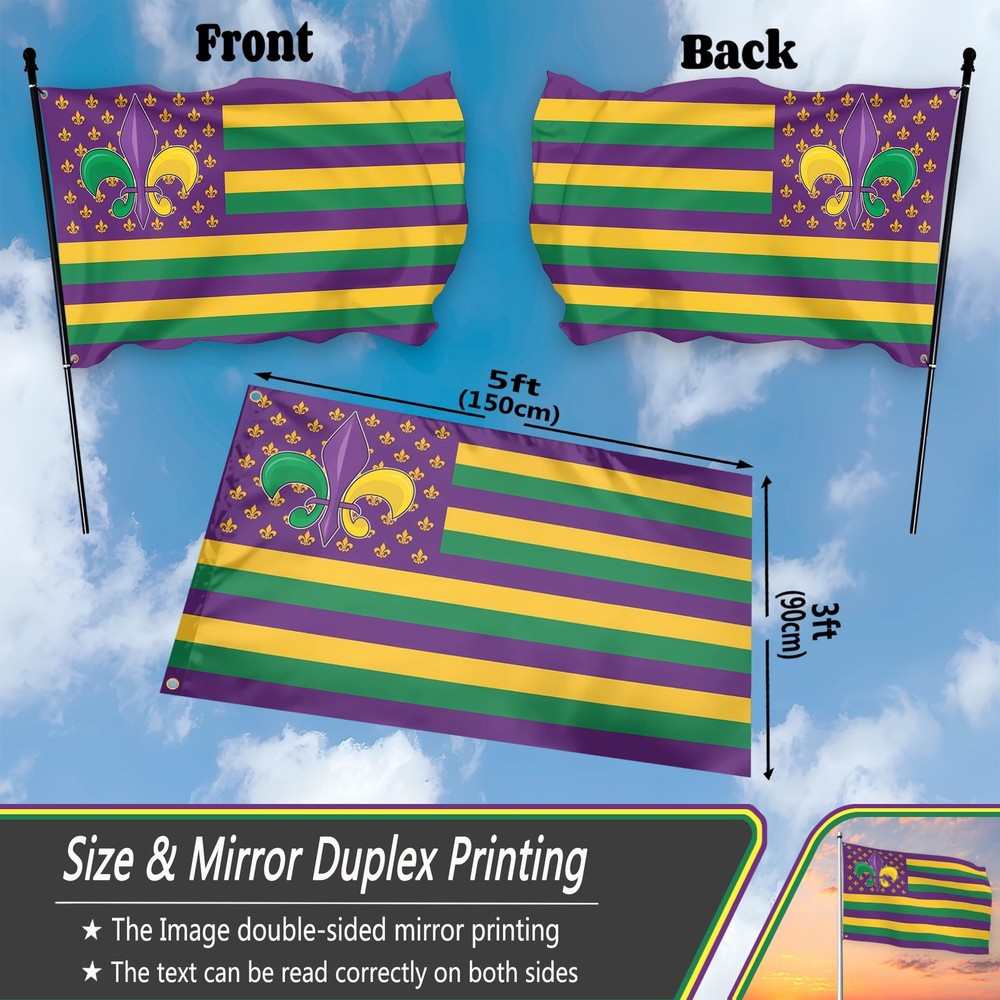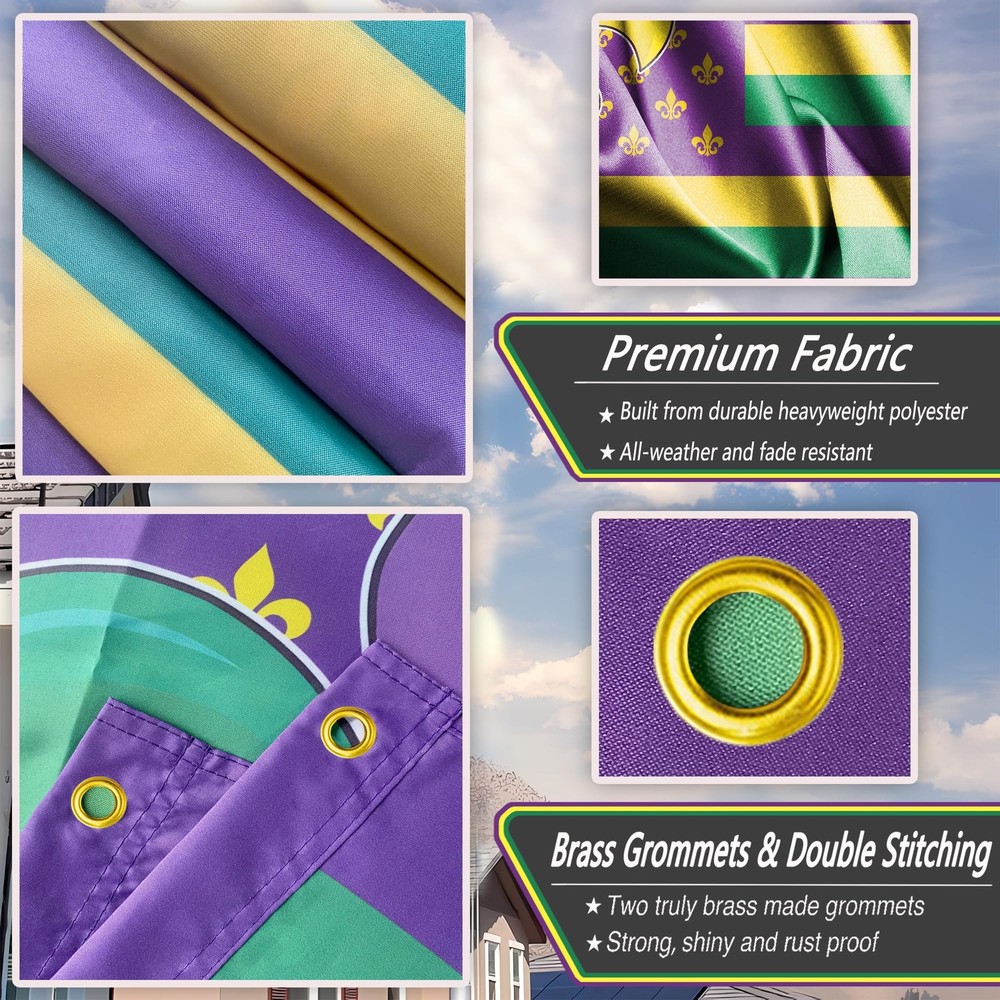 1 Show: Express the joyful atmosphere of masquerade carnival of the with this stunning mardi gras flag With On It with an eye-catching design. Durable: This mardi gras banner decor flag 3x5ft outdoor use polyester flag stands out because of its double-sided mirror printing, strong material and waterproof and UV-resistant coating, long-term use will not cause the flag to fade, and its ability to withstand strong wind and rain. Multi-Functional: Whether you are hanging the mardi gras house flag 3x5 outdoor is double sided on your wall, waving it during a parade, displaying it in your house/yard, or using the mardi gras flag as a unique holiday gift, this masquerade carnival fat tuesday party decor is perfect for anyone occasion. Symbolic And Inspirational: The combination of the mardi gras banner and the American flag creates a powerful visual statement. Also a for mardi gras garden flag is the best choice for outdoor garden decoration on mardi gras party, dance party, party or any other day you want to celebrate American. Easy To Install: With brass grommets, you can set up this mardi gras banner flag for home on any flagpole in seconds, and its vibrant colors stay vibrant for a long time. (Please Note: Flagpole not included).