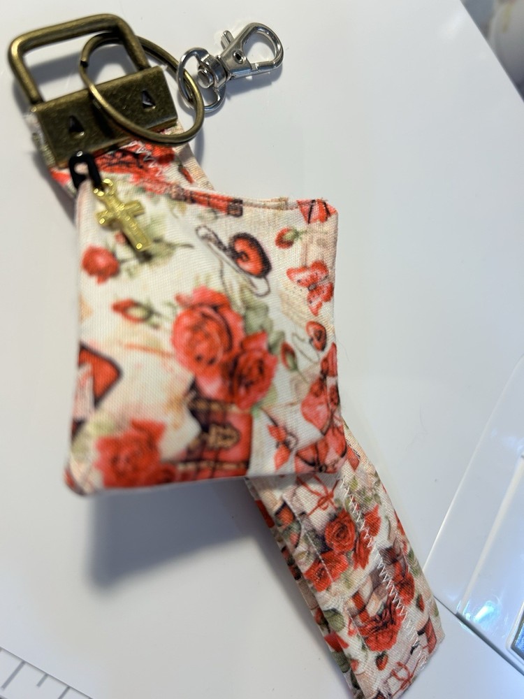 This colorful fabric wristlet lanyard key fob features a heart pattern, perfect for adding a touch of charm to your keys. Made of cotton fabric with a 6" length, it is handmade in the mountains of North Carolina . Made with love, not perfection . The key chain also includes a mini pocket prayer, adding a sentimental and practical element to this accessory. Inside the prayer pocket as a wood cross, and a mini gold cross on the outside. It is attached to the lanyard and can be taken off if you chose to do so. Suitable for both men and women, this bracelet-style key fob is a unique and stylish addition to your everyday carry. Please look at my other handmade and quilted items. Thank you for looking and have a blessed day.