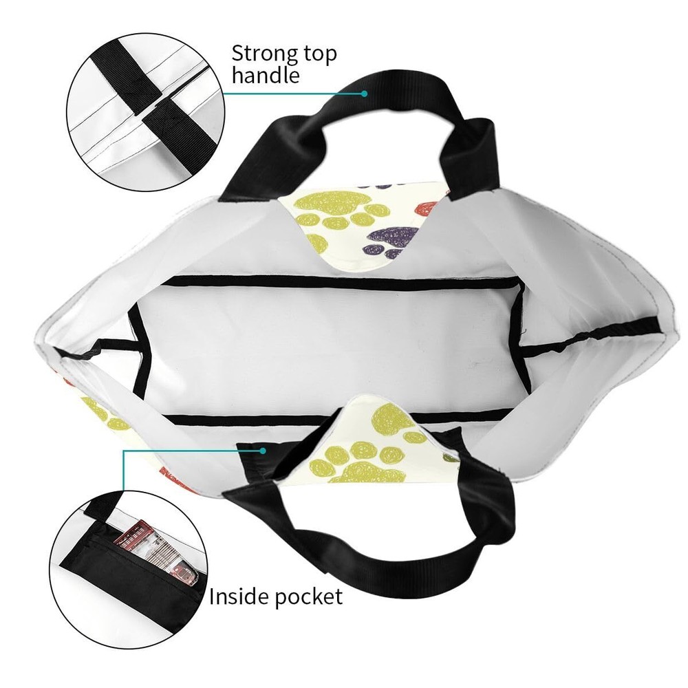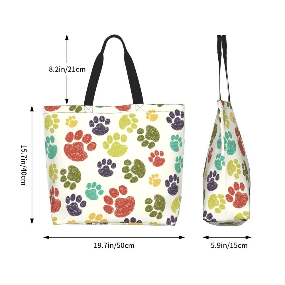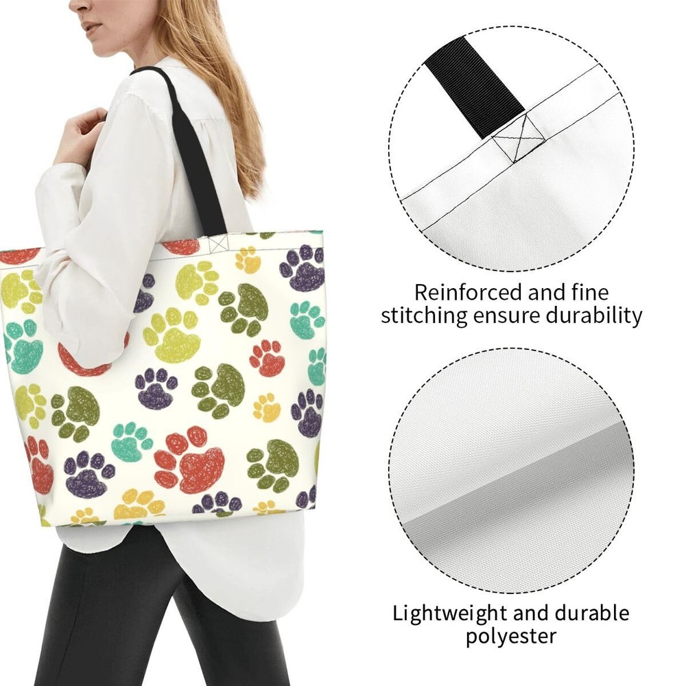 【High Quality】- This colorful paw print tote bag is made of polyester material, durable and super sturdy, washable and foldable 【Large Capacity】- 15.7in (H) X19.7in (L) X 5.9in (W). Our colorful paw print tote bag has a large main compartment that can hold more items, a small inside pocket that you can put small items any time 【Multi Purpose】- Our funny colorful paw print tote bags is big and durable enough to carry your purse, shoes, lunch, binders, or small laptop.these casual hobo bags for women can be used as a weekend bag, college handbags for girls, kitchen reusable grocery bags, beach bags, nurses bags and totes for work, teacher bags, travel bags, or gifts for your friend 【Washable & Reusable】- Our colorful paw print shopping bag can be machine or hand washed, but need to be washed in cold water. You can hang it to dry and iron it. Our cloth bag can be used many times and is very environmentally friendly 【Best Gift】- Our cute colorful paw print gift for dog cat lovers perfect for everyday, work, college, shopping, picnic, library, weekend, beach; suitable for women, girls, ladies, teachers; ideal gift for mother's day, birthday, valentine's day, sister, beloved, friends, parents, daughter, girl friend