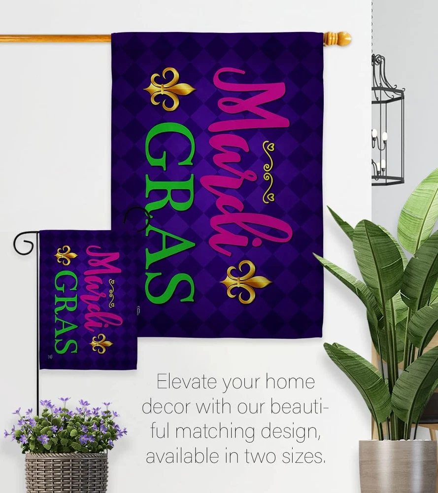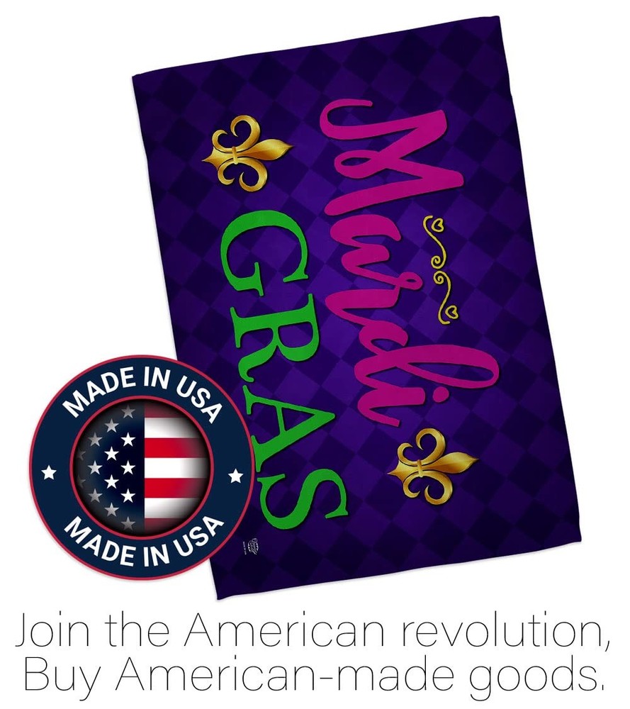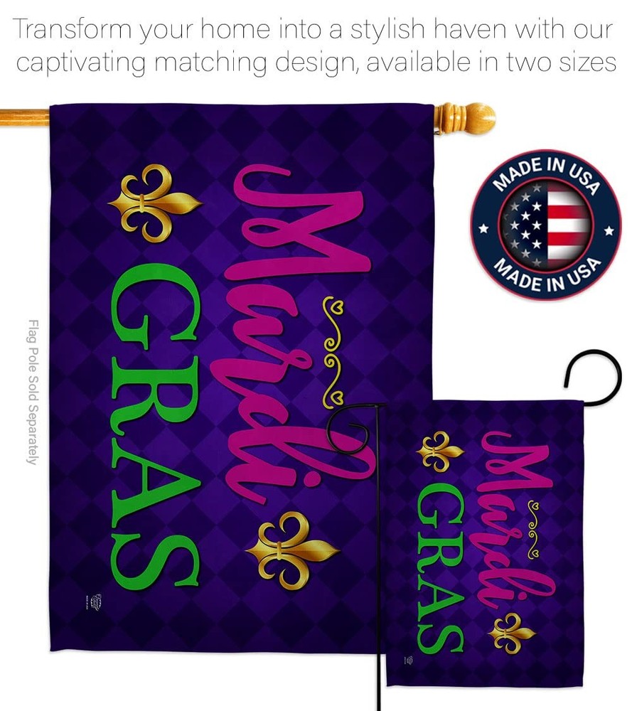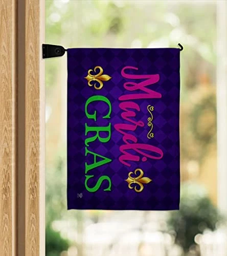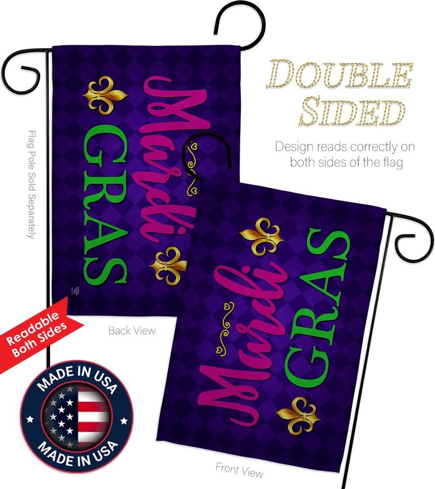 Mardi Gras Beautiful Mini Garden Decorative Flags Banner Pole - Complete Set with Wall Mailbox Hanger Power Coated Metal Flag Holder have variety of home decoration for all occasions. Uniquely design for hanging indoor or outdoor use. We are committed to offering you exceptional values. Our customers enjoy displaying our yard banner sign for longer periods. Specification: Theme: Mardi Gras Print: Double-Sided Readable: Readable Both Sides Material: Weather Resistant - Thick Fabric Stitching: Double Stitched Display: Horizontal Hang Type: Sleeve Artist: @ Olive Bell Origin: Made In USA Package Include: 1 pc x Mini Garden Flag 13" x 18.5" 1 pc x 1.5" x 15.5" Metal Yard Banner Hardware For more than a decade, we’ve been dedicated to manufacturing flags with no comparison in quality and beautiful designs. Our flags are made with our Guard material that is soft to the touch and designs can be read correctly on the flag. A feature that our customers will love. We are committed to using eco-friendly inks that won’t leave a foot print in our environment. MPN: OC-MG-IP-US22-OC PROUDLY Made In USA - Package And Product Designed In California PURCHASE WITH CONFIDENCE - From 's US Authorized Resellers DURABLE FLAG - Double stitching panels on multiple rows and high quality Sleeve to provide lasting strength VIBRANT COLORS - With UV-Resistant Maintains Its Colors All Season Long FEATURES - Sleeve Hanger fits standard Banner/Flagpole, Bracket, Arbors or stand Hardware Included!