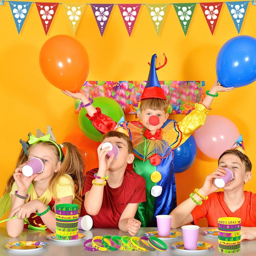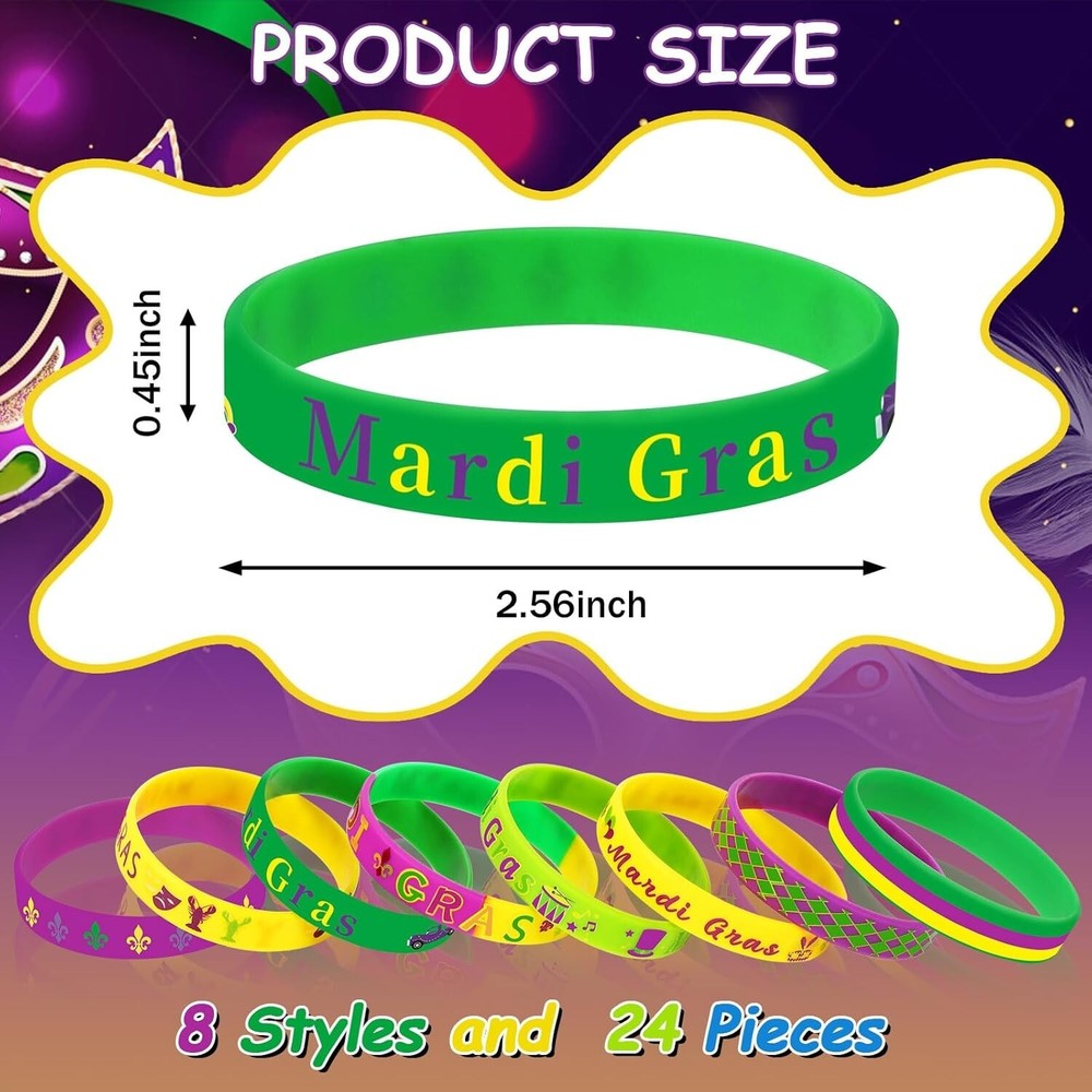 Color Multicolor Material Silicone Brand JUNEBRUSHS Unit Count 24.00 Count Theme Mardi Gras About this item Package Contents: You will receive a total of 24 Mardi Gras silicone bracelets. The mardi gras rubber wristbands have 8 designs, 3 for each design, enough to light up an entire city of carnival enthusiasm Reliable Material: Our Mardi Gras party favors are made of good quality silicone, soft and durable, strong support, not easy to deform. Mardi Gras rubber wristbands are flexible and can be stretched to fit different wrist sizes, making the Mardi Gras bracelets ideal for adults and children. The Mardi Gras party favors are design for Mardi Gras and will withstand the test of time, ensuring you shine through the festivities Size: Mardi Gras silicone bracelets are 8 inches long, 0.45 inches wide and 2.56 inches in diameter. The Mardi Gras rubber wristbands have good flexibility and durability. Whether you're engaged in outdoor activities or attending a Mardi Gras party, our Mardi Gras bracelets will protect and decorate you throughout the day. Regardless of the size of your wrist, these Mardi Gras rubber wristbands will fit tightly for comfortable wear Fun Design: Our mardi gras silicone bracelets feature 8 dazzling Mardi Gras themed designs, including masks, crowns, stars, drums, [Mardi Gras], etc. With the classic Mardi Gras color, yellow, purple and green. Ideally show the charm of carnival, making you the center of attention at any party Application Scenario: These Mardi Gras party favors are suitable for most kinds of party, music festivals, carnivals and raves. Whether dancing or partying on the city streets at night, the Mardi Gras silicone bracelets will be an ideal decoration for you. In addition, the mardi gras rubber wristbands are also wonderful gifts to give the essence of the carnival to your friends and family