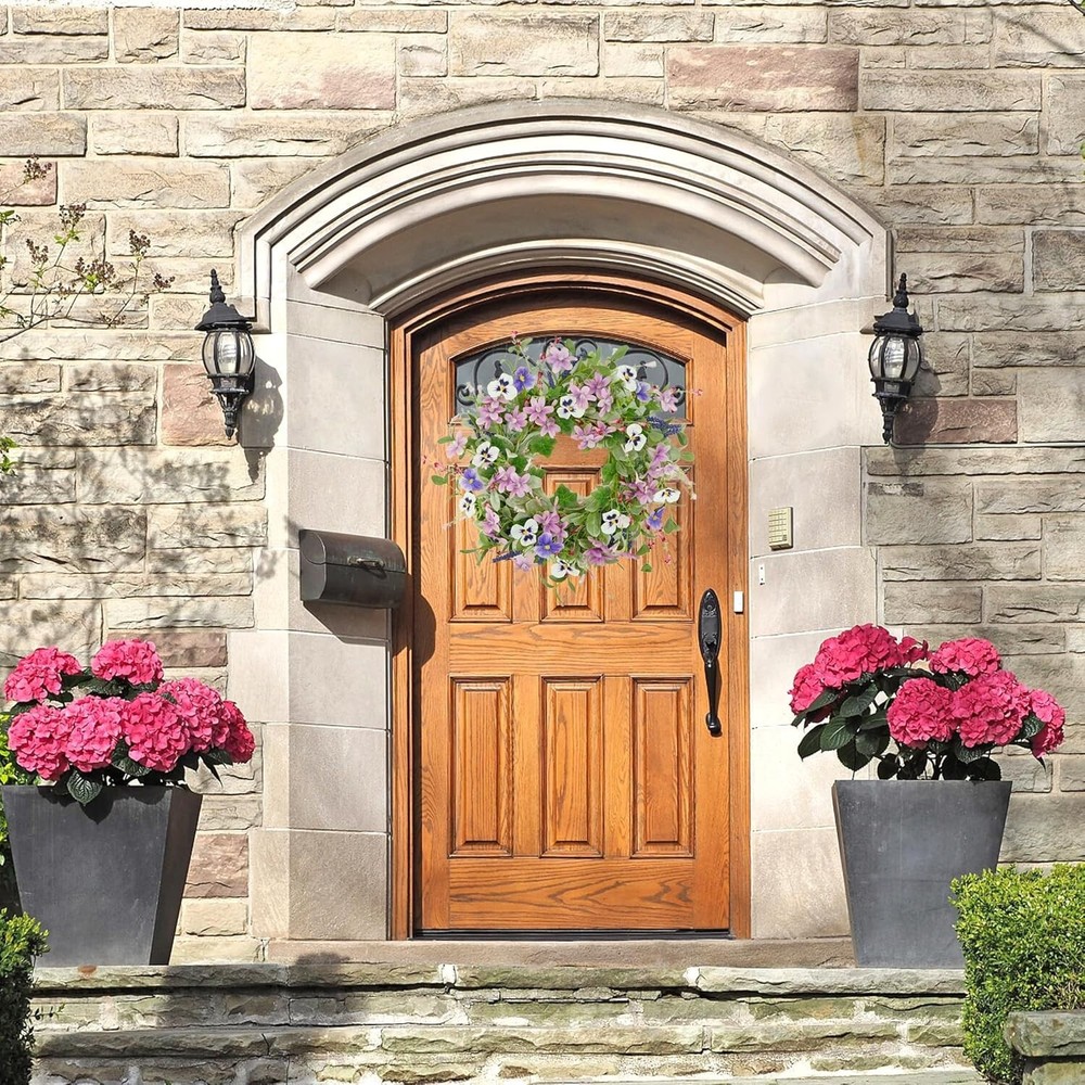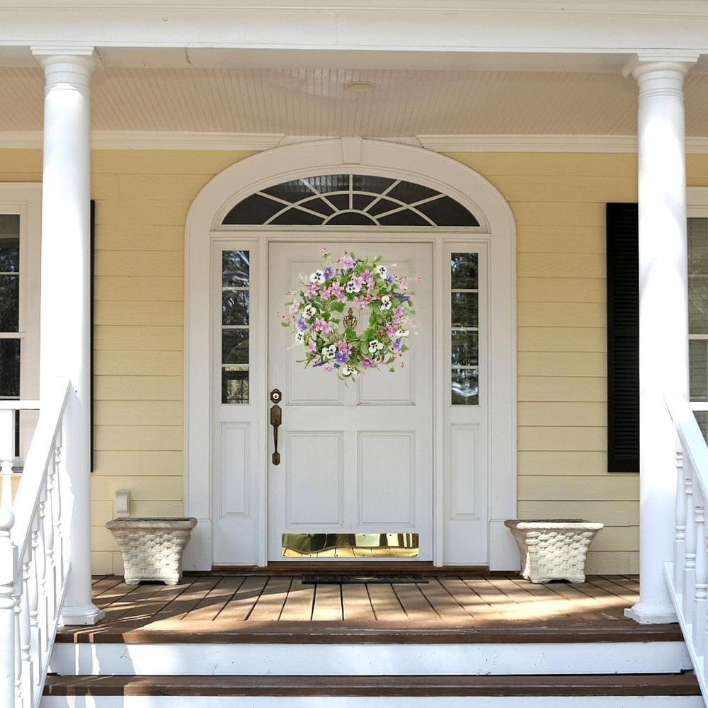 Spring Wreaths for Front Door Summer Wreath with Pansy Flower Lamb Ear Leaves Color: White Pansy and Lavender Flowers B Material: Silk Shape: Round" or "Oval Product Dimensions: 20"D x 20"W x 5"H Occasion: Multi-purpose ADJUST WREATH SHAPE : branches of the spring summer wreath are made of bendable wire, so you can shape things as you go, and keep monkeying with them until you make it look just as you want. Please adjust or bend the branches on the wreath and arrange the pansy flower heads upward for best display.,the maximum size of wreath can be 20". VERSATILE DECOR:This spring summer floral wreath is suitable for front door, wall, indoors,outdoors,window,fireplace,farmhouse, living room, porch, centerpiece party, wedding, holiday and festival celebration. It will provide your home a feeling of natural and vatality. BEST FRIENDS FOR spring summer wreath : Suitable for spring, wedding, home, wall, window, front door, fireplace, living room, bedroom, dining room, fireplace, porch, window and other indoor and outdoor decoration. Add glamour to your spring and summer season with this striking pansy and lavender wreath. EASY CLEAN: The handmade wreath is convenient to clean, just wipe it with a try towel to make the wreath like brand new. The green leaves and branches are not easily falling apart. This wreath can be used for a long time. PACKAGING DESIGN: we pack the wreath to gift box and we Tighten the wreath when packing so that the wreath can be protected when delivery,pls open and fluff the wreath and adjust the branches,flowers, the maximum size of wreath can be 20". Return Policy: We offer a 30 day return policy from the receiving date. Please contact us for a Free Return Label. Please use our return label so it will go back to our supplier and we can do a refund or replacement afterwards. Feedback: Your satisfaction is very important to us! If you have any problem with your order, please contact us and we will do our very best to make you satisfied. As long as you are happy with your purchase, please leave a positive feedback for us. We will always leave you a positive feedback in return. If you have any problem with your purchase, please do not leave a negative feedback. Please Contact us ... and your issue will be solved quickly and positively We are a small family-owned business trying to make a living, not a huge company that does not care ... We will ALWAYS do our best for you!
