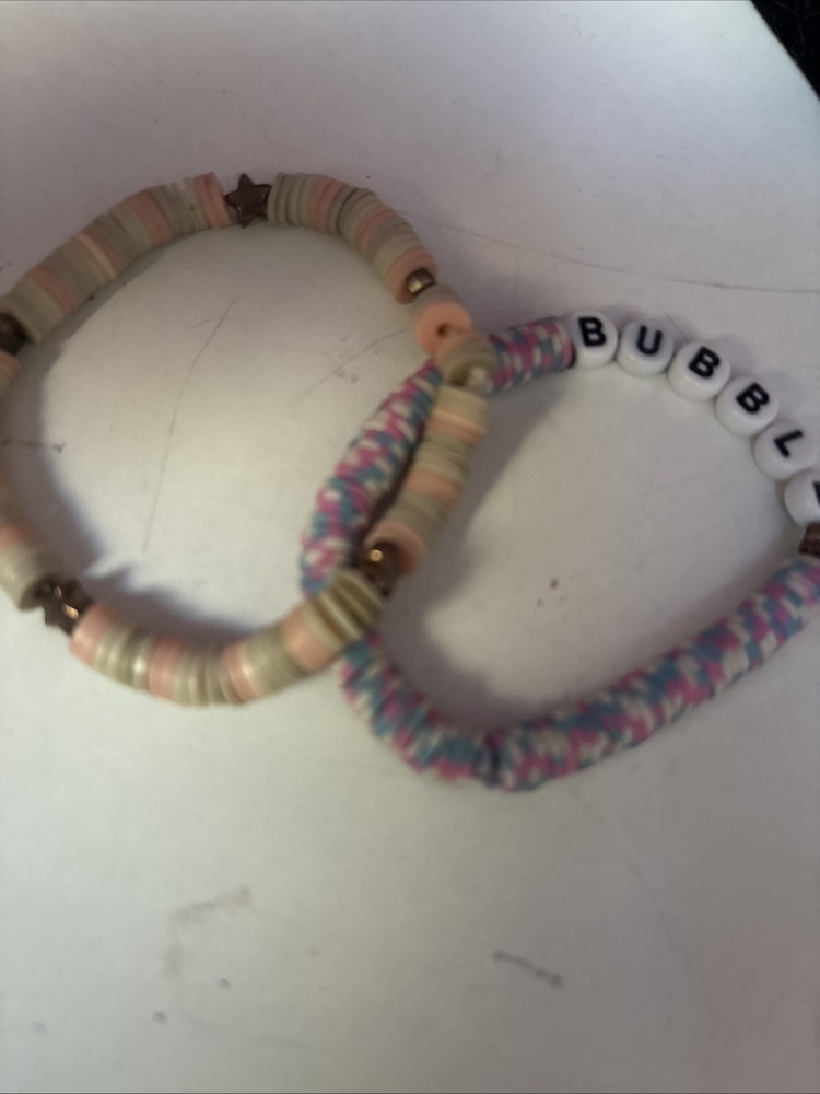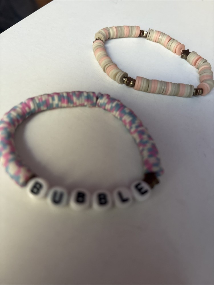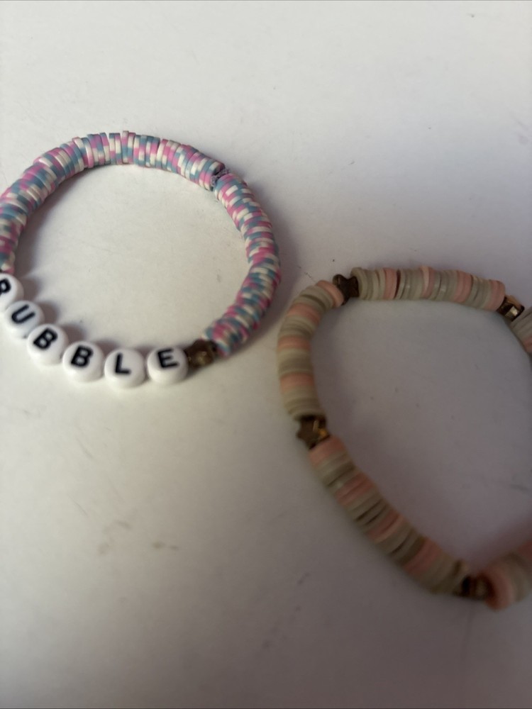 The Clay Bead Bracelet for Summer is a set of two bracelets made in the United States with blue, pink, and tan star beads. These beaded bracelets are perfect for adding a touch of summer style to your outfit. The clay beads give them a unique and trendy look, making them a great accessory for any summer occasion. Made with quality materials, these bracelets are a stylish addition to any jewelry collection.