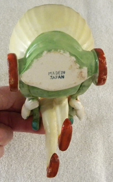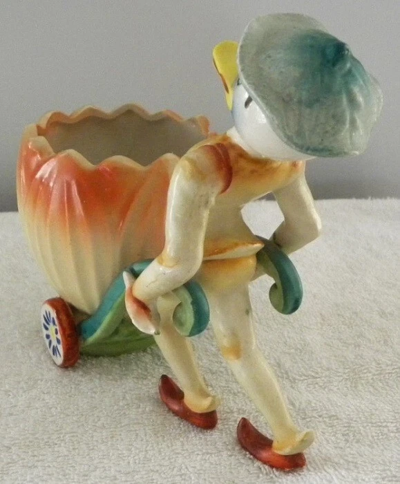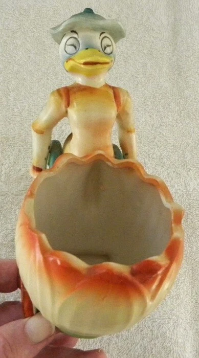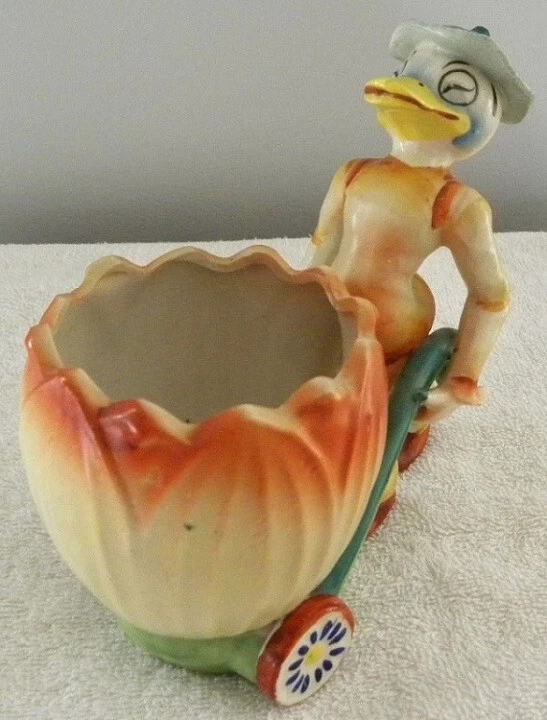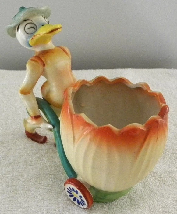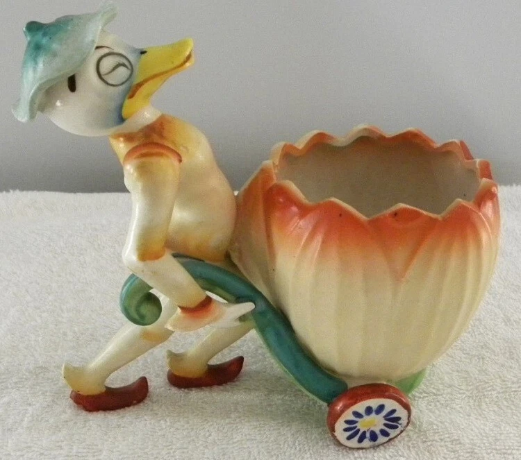 This is a colorful vintage ceramic duck pushing a cart, probably for Easter. On the bottom it has - Made in Japan. It measures about 3" x 5 3/4" and 5 1/2" tall. It is in very good condition. I see no chips or cracks. Buyer pays Shipping & Handling Items shipped: from same day - to 3 days maximum SATISFACTION GUARANTEED or MONEY BACK Save on shipping by combining with our other eBay store items or auctions ~Iowans please pay 7% Iowa State Sales Tax~ Thank You for Looking at Our Items Please email us with any questions