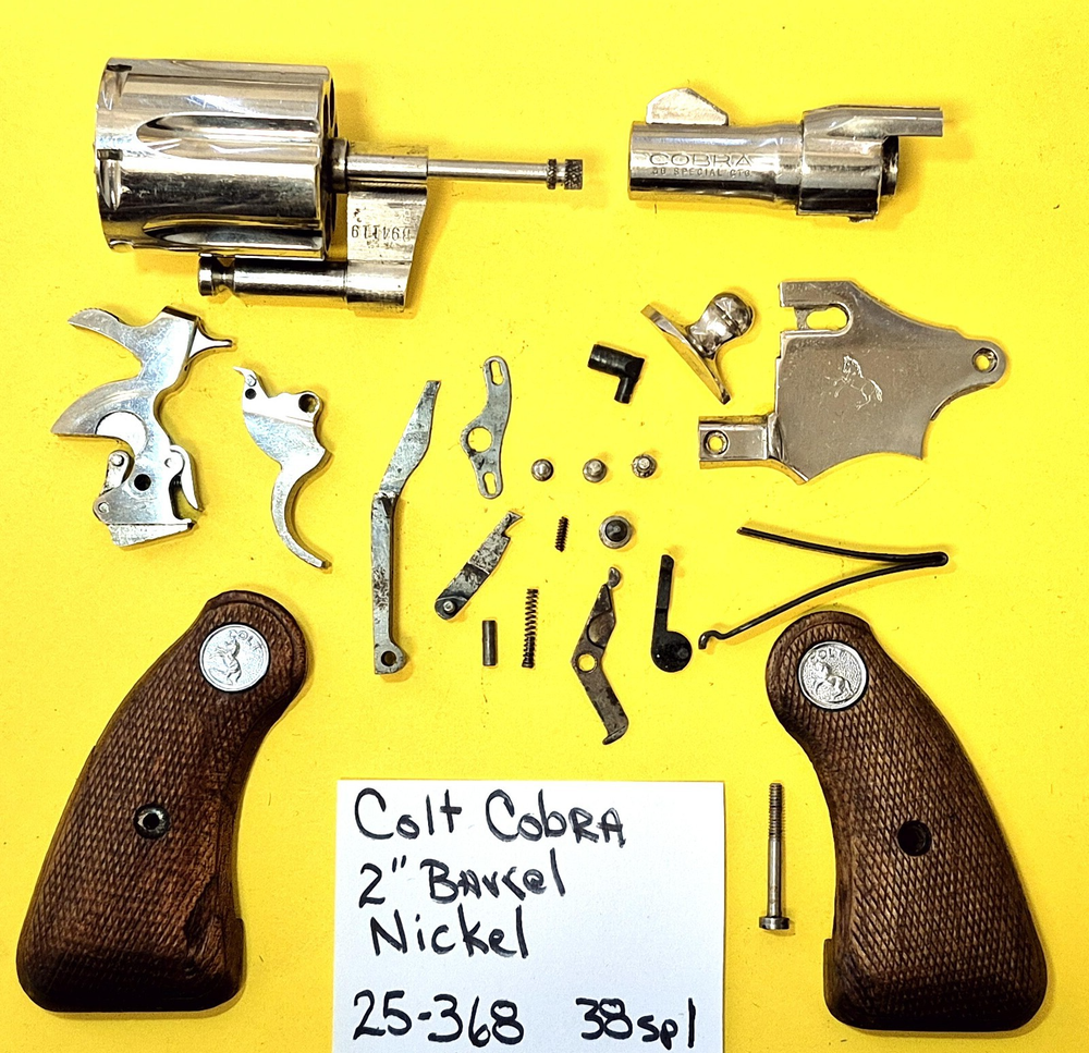 Colt Cobra D Frame .38 Sp Revolver Nickel ITEM # 25-368 These parts are made for the Colt Cobra D Frame Revolver: Complete Cylinder, Barrel, Checkered Grips w/ Screws, Side Plate w/Screws, Trigger, Hammer, Cylinder Latch, Latch Spring & guide, Latch Pin, Rebound Lever, Safety, Bolt, Mainspring, Pin, Springs, Screws.