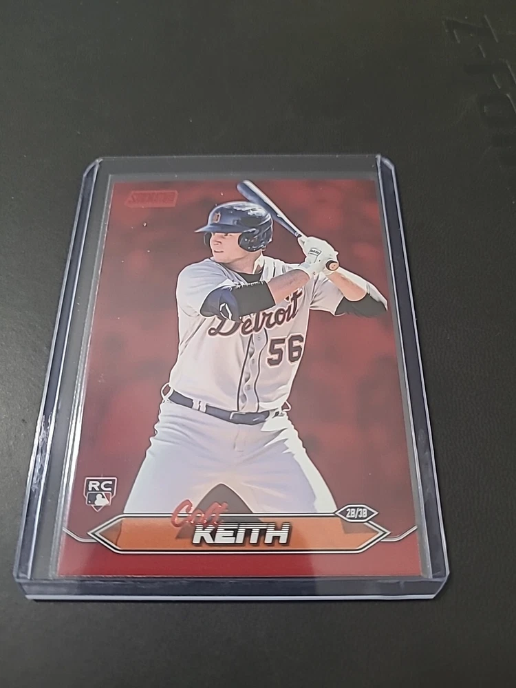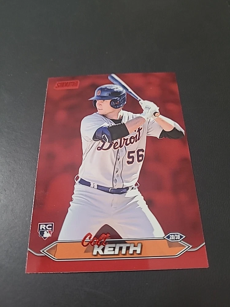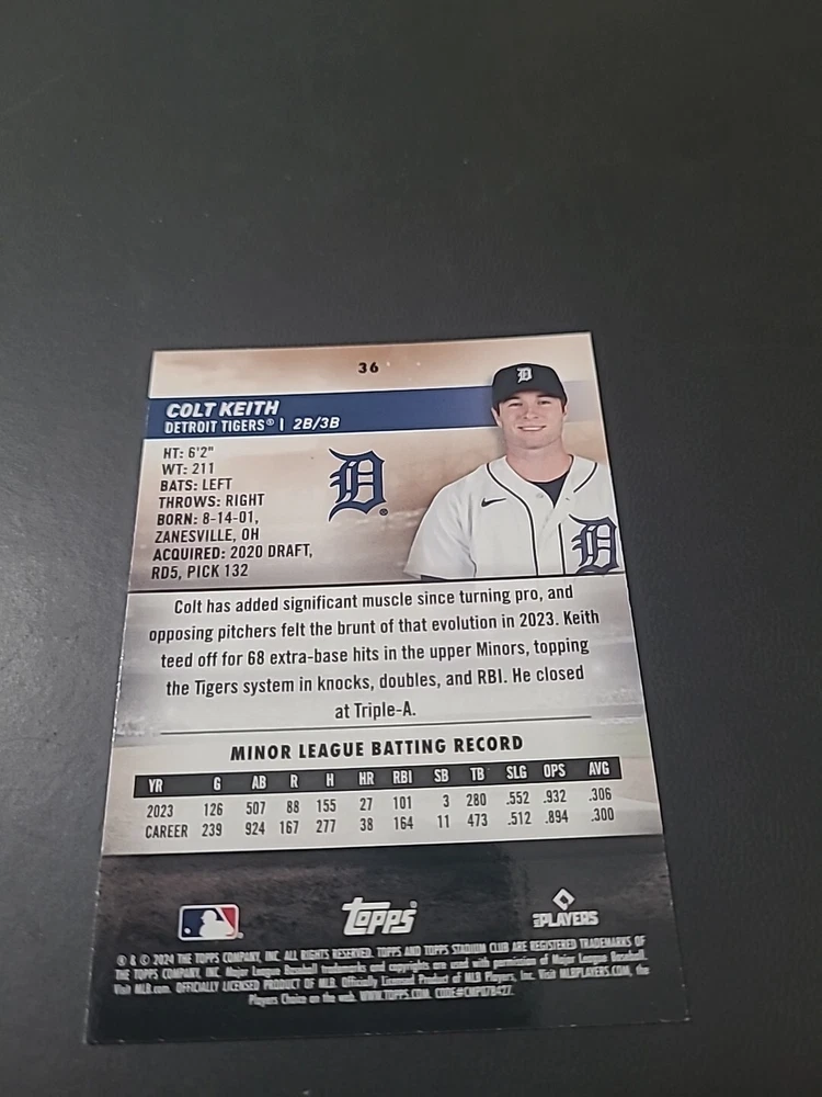 This is a 2024 Topps Stadium Club sports trading card featuring Colt Keith, a rookie player for the Detroit Tigers. The card is a red foil parallel/variety and has the card number 36. It is an original card manufactured by Topps in the United States. The card is perfect for baseball fans and collectors who are looking for a valuable addition to their collection. It is a great way to commemorate Colt Keith's debut season with the Detroit Tigers. This trading card is a must-have for any collector who wants to own a piece of baseball history.