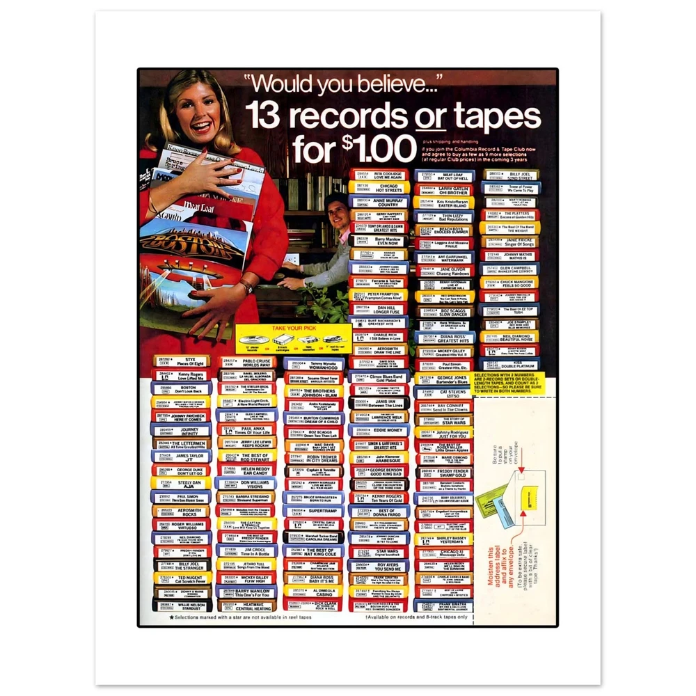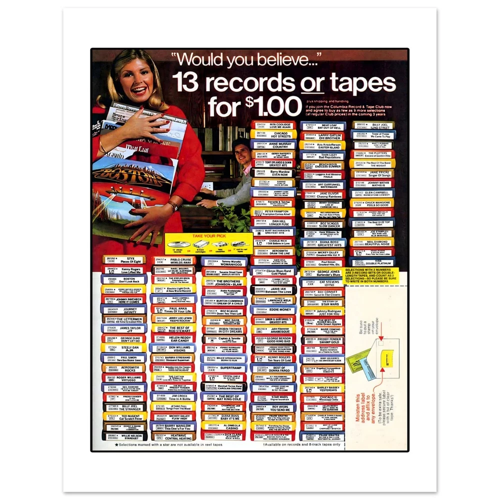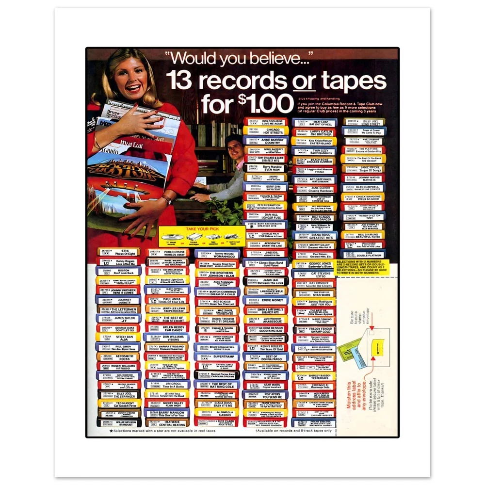 Columbia Record & Tape Club Seventies Retro Advertisement Art Print Poster All retro advertising prints are created using scans of the original ad. As a result, prints may show signs of age and/or wear or other imperfections.One of my favorite parts of growing up in the seventies and eighties was the Columbia Record & Tape club. I joined under every family member in my house and loved having those catalogs show up every month. I love this retro ad featuring 8-track tapes.• Digitally Printed.• Sizes available: 8x10, in. 11x14 in, 12x16 in, 16x20 in 18x24 in.• 16x20 in, 18x24 in• Printed with a matte finish on heavy duty archival paper.• 200 GSM heavy weight paper Columbia Record & Tape Club Seventies Retro Advertisement Art Print Poster All retro advertising prints are created using scans of the original ad. As a result, prints may show signs of age and/or wear or other imperfections. One of my favorite parts of growing up in the seventies and eighties was the Columbia Record & Tape club. I joined under every family member in my house and loved having those catalogs show up every month. I love this retro ad featuring 8-track tapes. • Digitally Printed. • Sizes available: 8x10, in. 11x14 in, 12x16 in, 16x20 in 18x24 in. • 16x20 in, 18x24 in • Printed with a matte finish on heavy duty archival paper. • 200 GSM heavy weight paper × Tell a friend Visit store Watch now Postage info Click the Postage tab above the listing description for more info FREE Postage See more... USPS First Class - $0.00 USPS Priority Mail - $9.95 Click the Postage tab above the listing description for more info! Additional delivery notes PICK UP OPTION Sorry, our items are NOT available for pick-up. PAYING VIA PAYPAL We accept PayPal on our all our items so you can shop with confidence. Simple choose the PayPal option when proceeding through the checkout. Additional Information No additional information at this time Ask seller a question You might also like Peaches Records & Tapes Est. 1975 Record Shop Music Store Men's Unisex T Shirt T Elmore Elmo James 78 RPM Mississippi Delta Blues Trumpet Record Label Men's T Sh Howlin' Wolf Chicago Blues Men's T Shirt Tee Opryland USA Amusement Park Nashville Retro Unisex T-Shirt Tee Contact To contact our Customer Service Team, simply click the button here and our Customer Service team will be happy to assist. Ask seller a question © Mad Apple Shop Postage Shipping is FREE for this item Payment Accepted Payment Methods PayPal Returns Returns are accepted Items must be returned within 30 days of the auction ending Buyer will pay for return shipping. eBay integration by