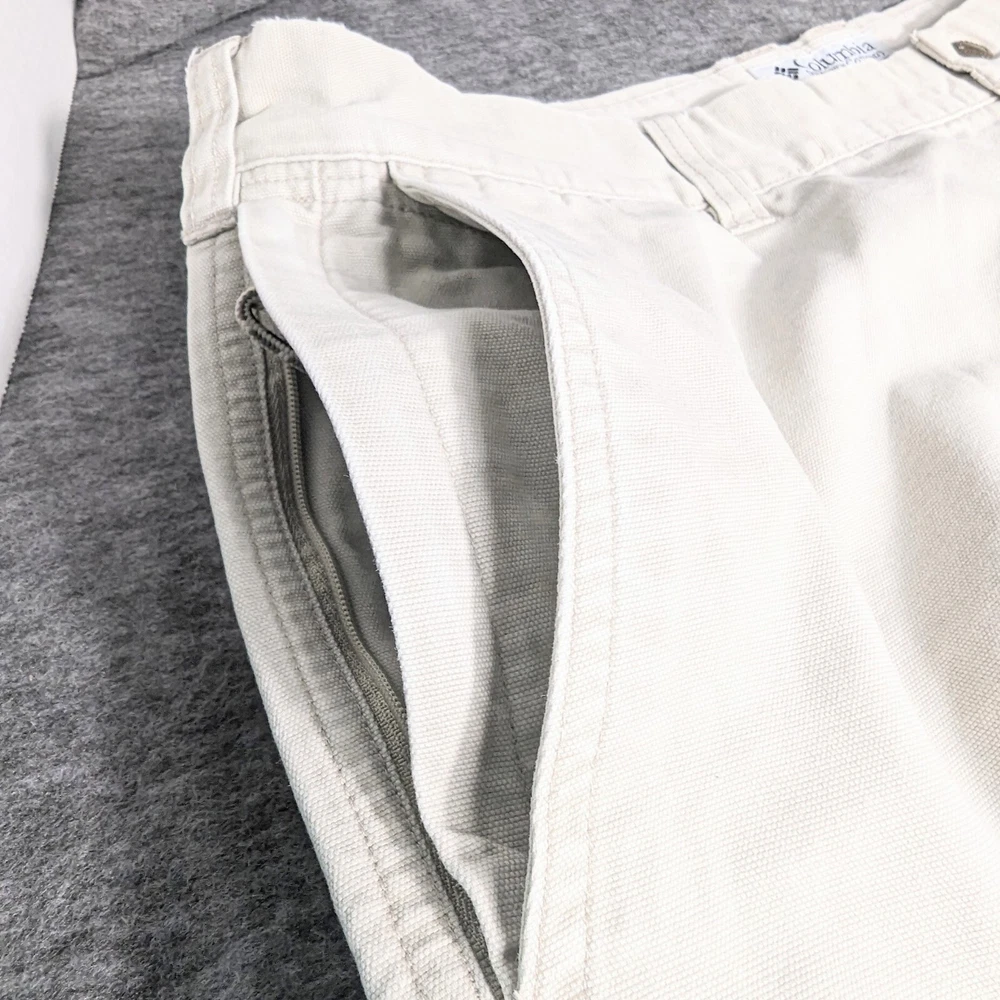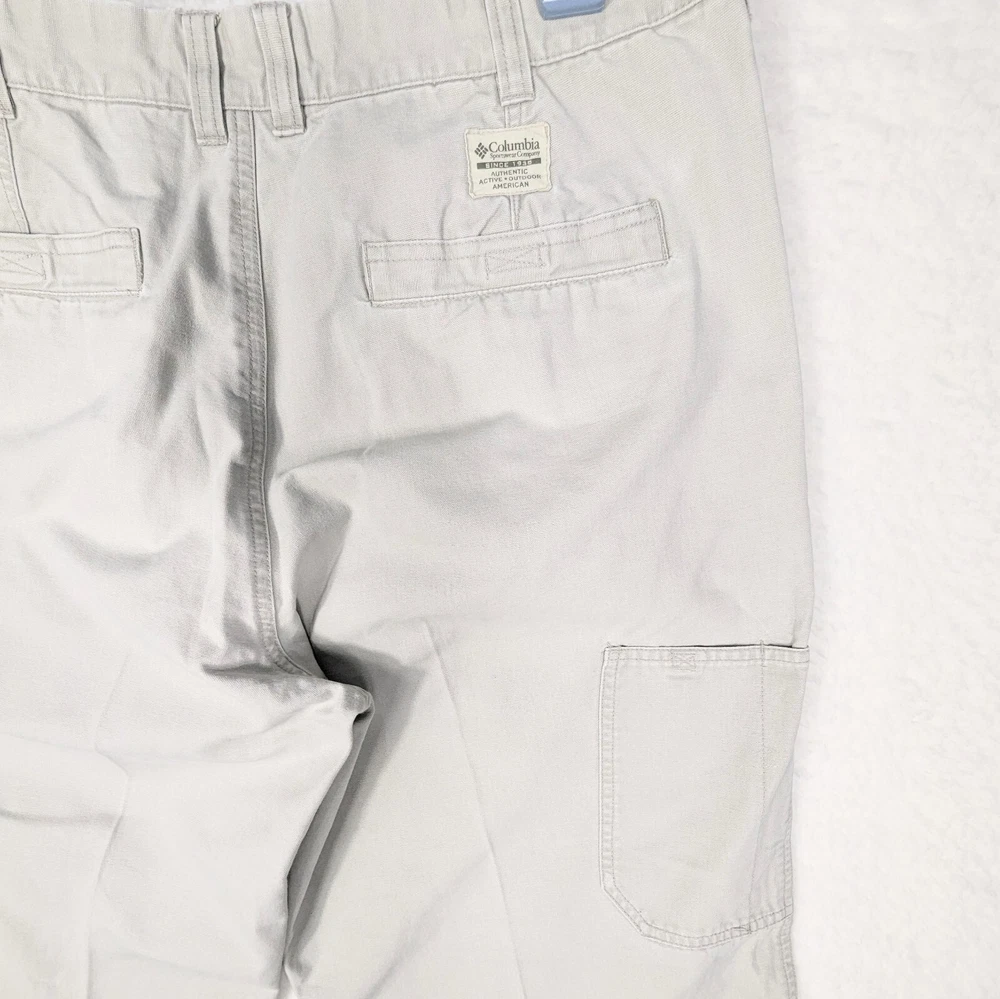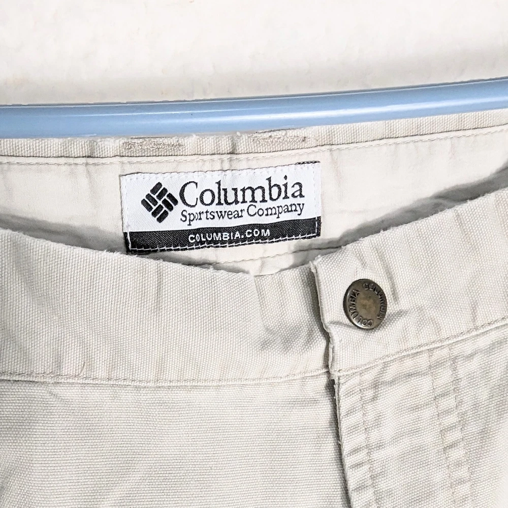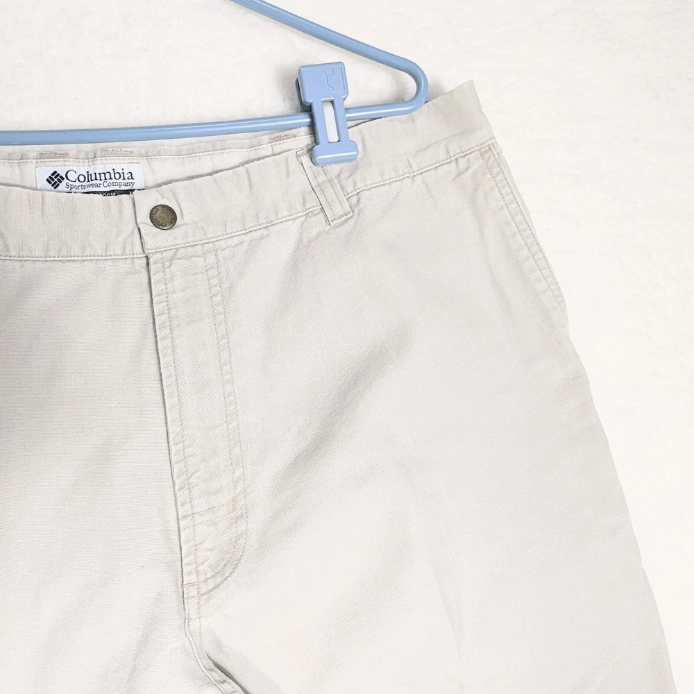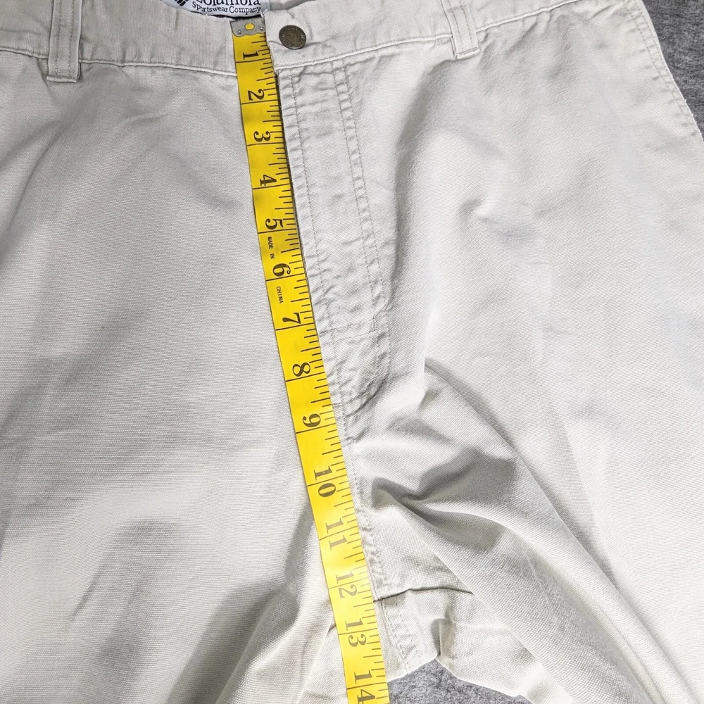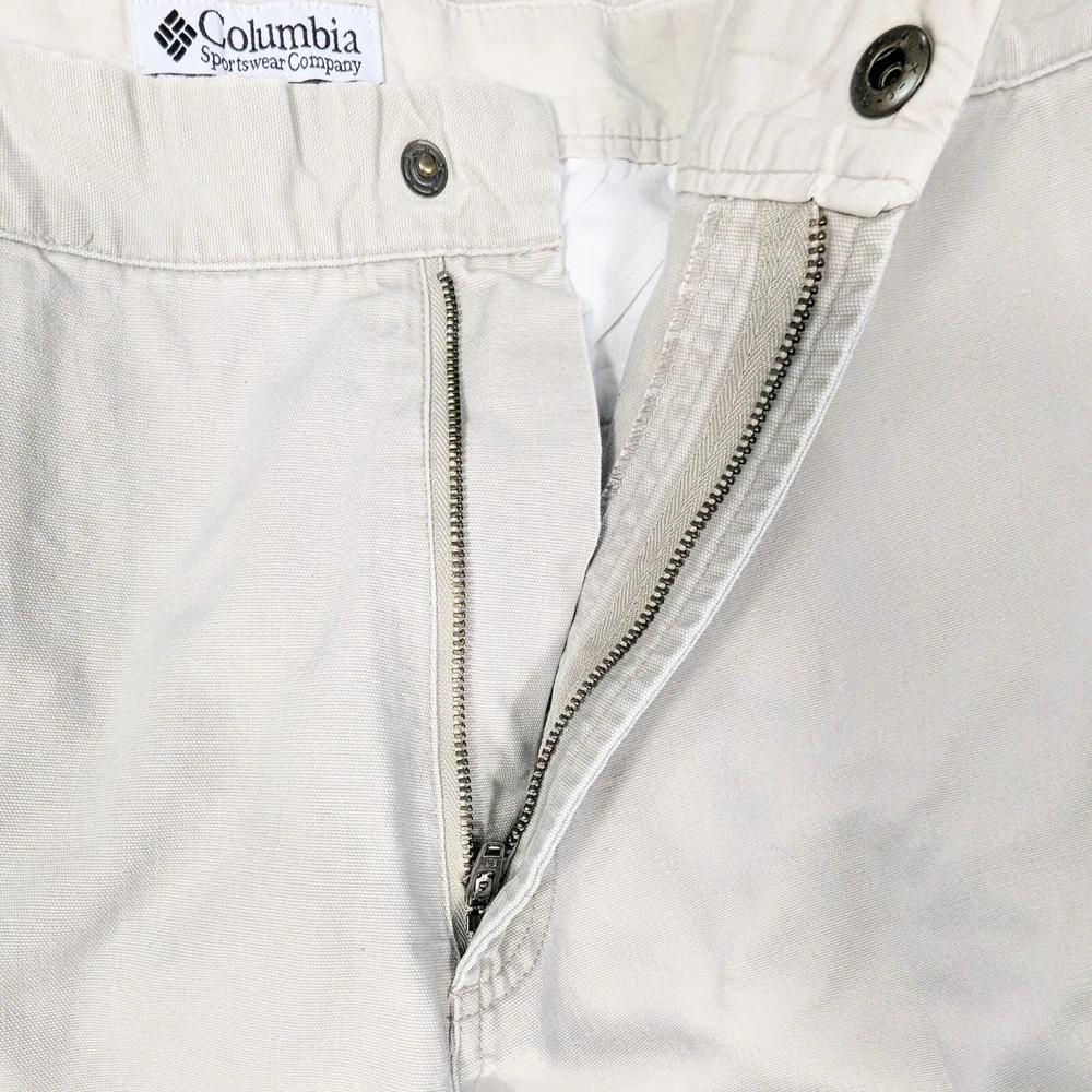 Columbia Sportswear Chino Pants Mens Size 38 Heavy Cotton Beige Khaki Utility Pocket Side Zip Pocket Pre-owned in excellent condition No rips stains or tears Waist measures 38" Rise measures 12.5" Inseam measures 29,5" Please view all images Message with any questions