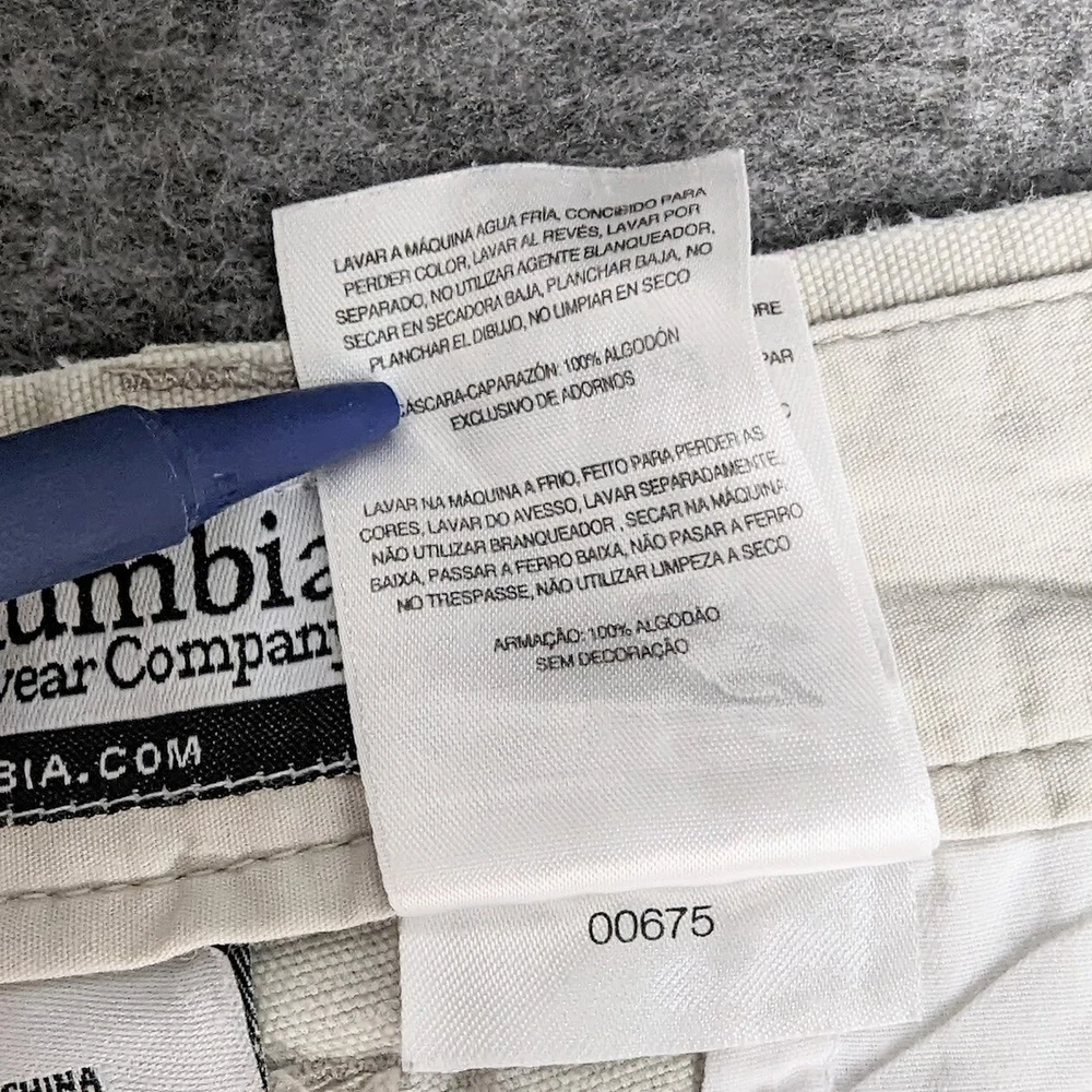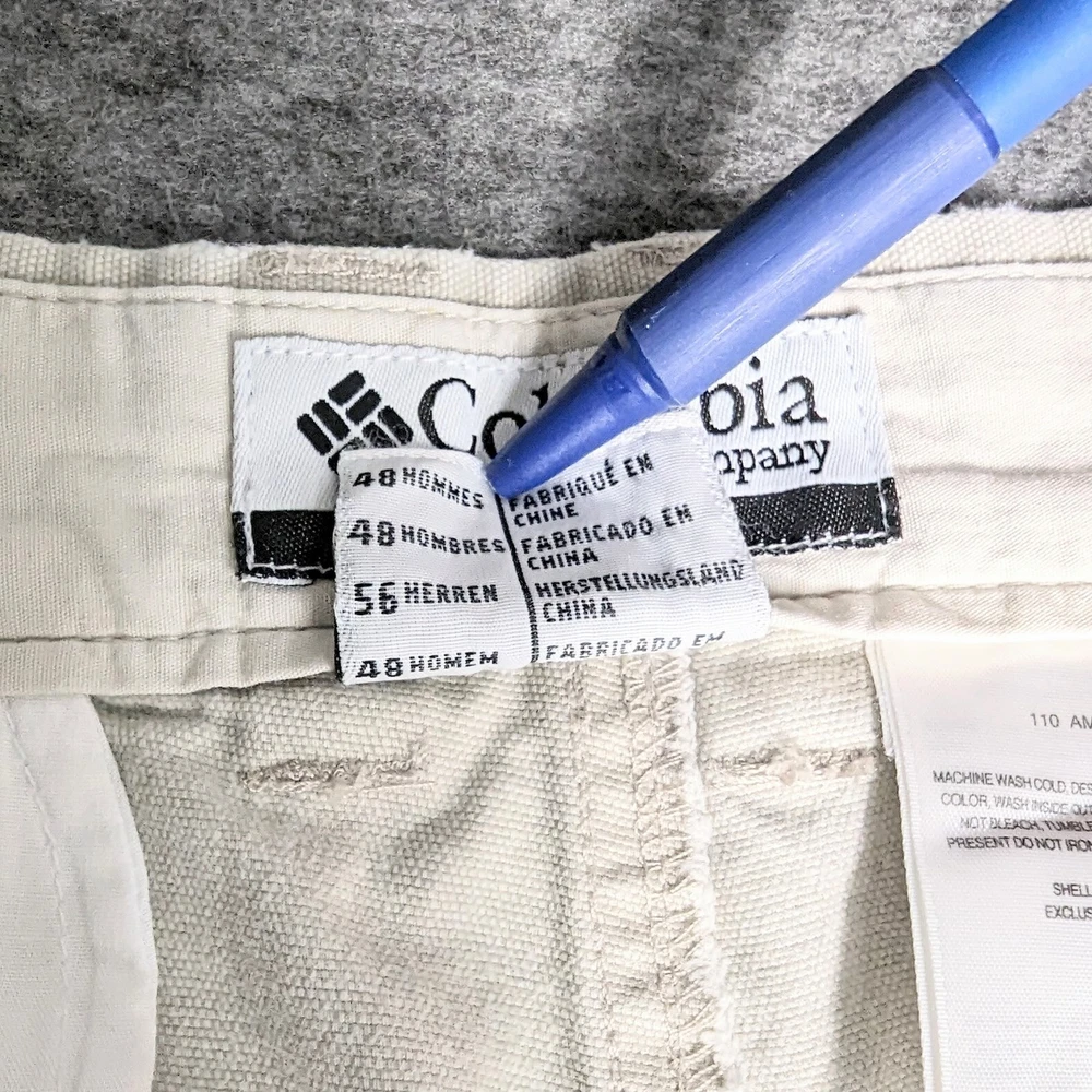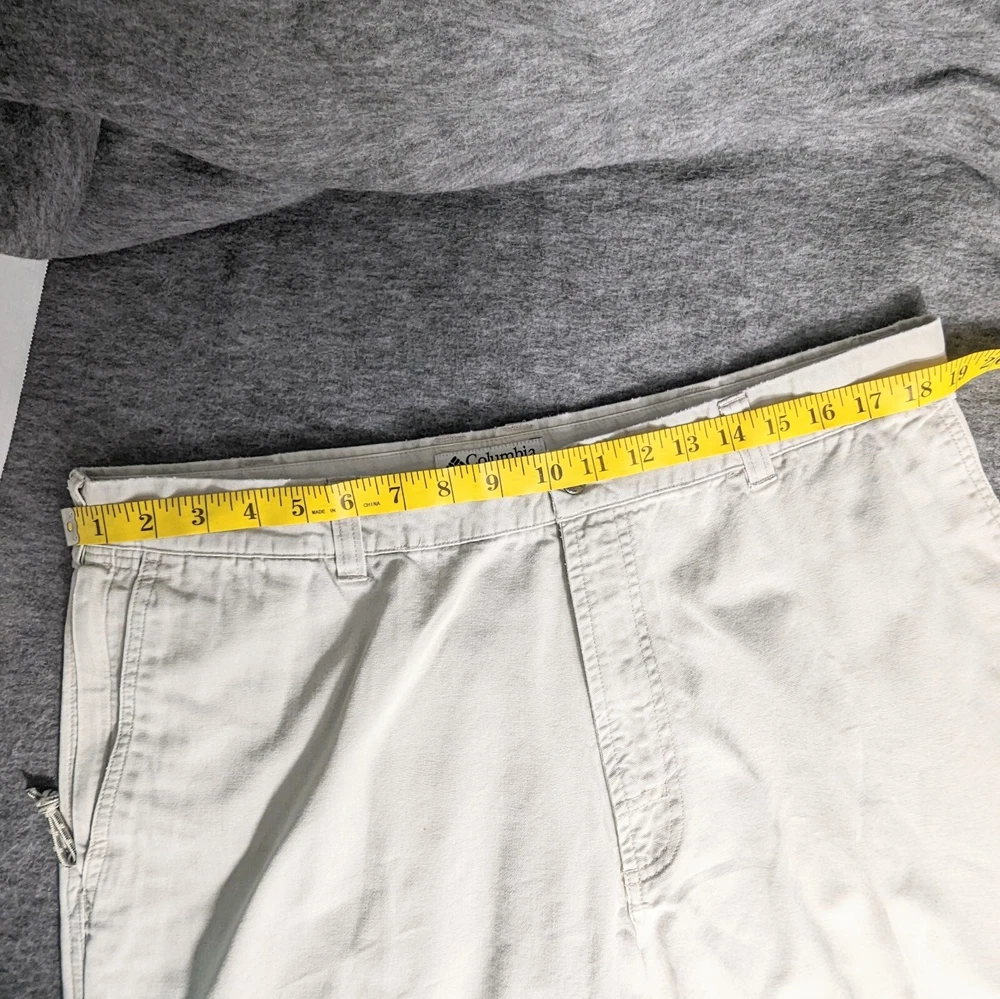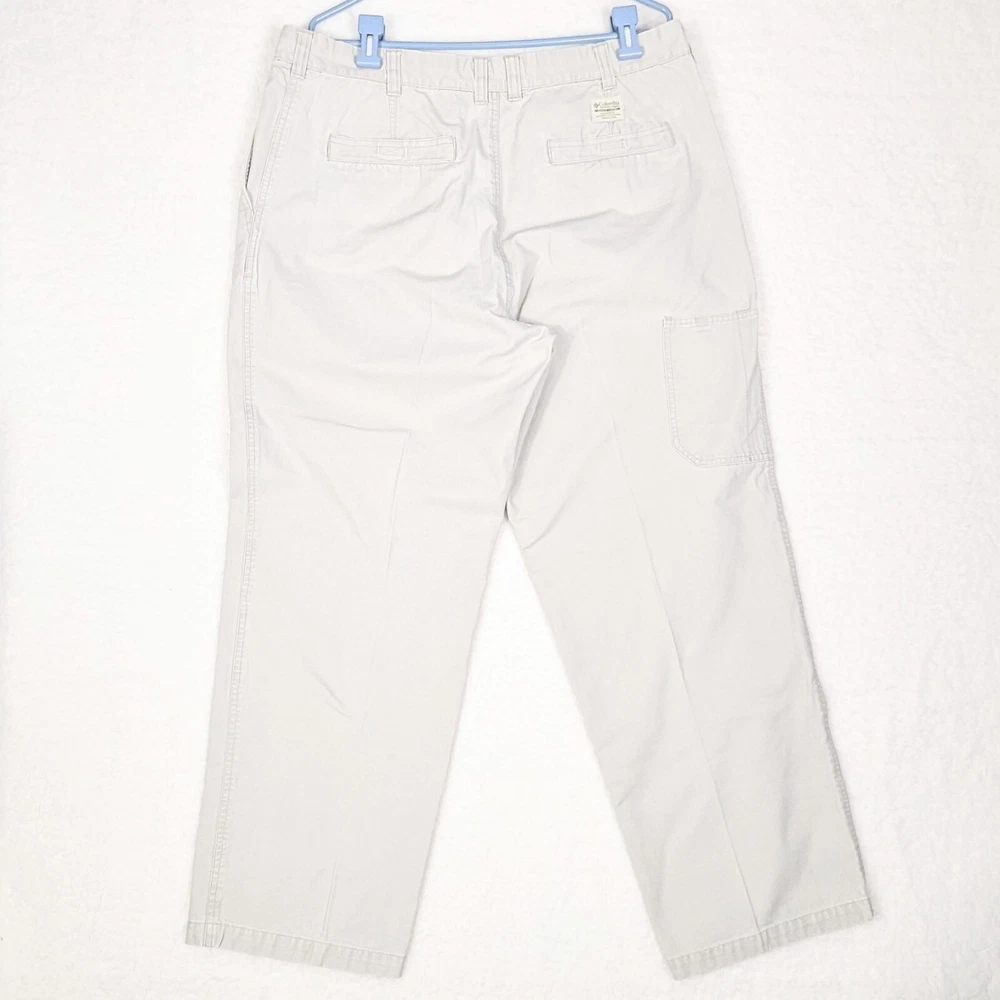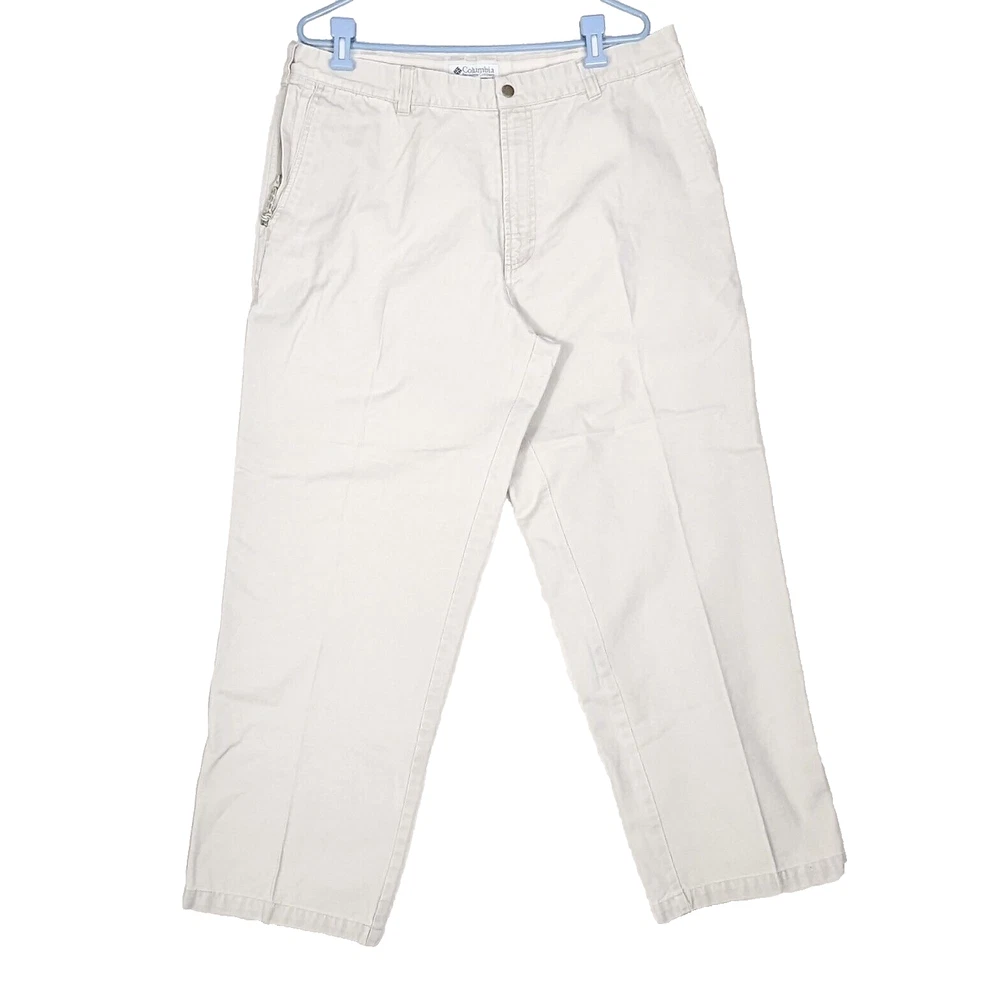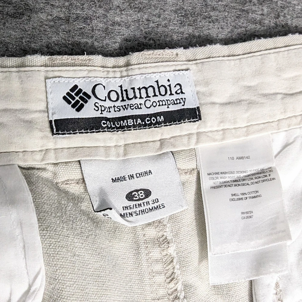 Columbia Sportswear Chino Pants Mens Size 38 Heavy Cotton Beige Khaki Utility Pocket Side Zip Pocket Pre-owned in excellent condition No rips stains or tears Waist measures 38" Rise measures 12.5" Inseam measures 29,5" Please view all images Message with any questions
