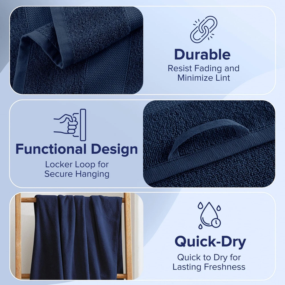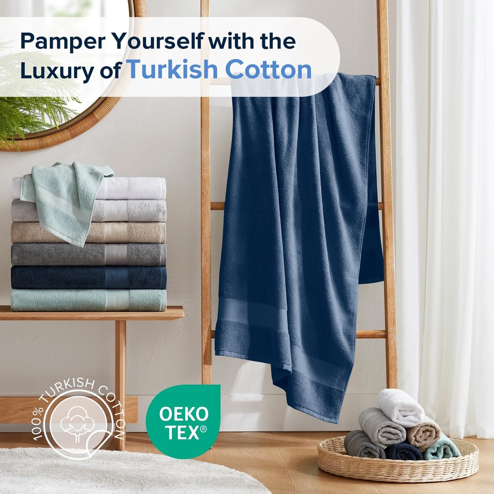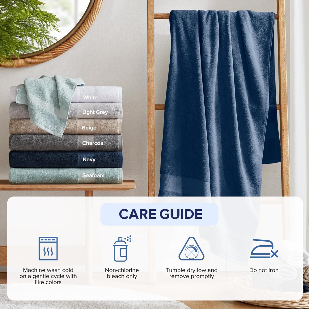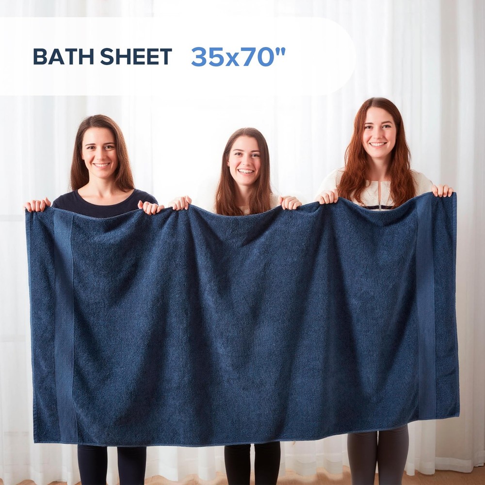 100% Turkish Cotton: Our Turkish Bath Towel Set, crafted from premium long-staple cotton for unmatched softness. Experience comfort with towels that are highly absorbent, quick-drying, and generously sized for ultimate coverage Quality Comfort: Crafted from premium long-staple 100% Turkish cotton with a 500gsm lightweight design, ensure quick drying, high absorbency, and a soft, plush feel. Perfect for daily showers, beach trips, poolside lounging, or gym use Perfect Gif Set Bundle: Ideal gift for any occasion, especially for housewarming gift. Oeko-Tex CERTIFIED - Ensuring the use of non-toxic chemicals and substances, made in an environmentally friendly and socially responsible workplace Seafoam Navy Blue Set (Large Size) includes: 2 Bath Sheets:35"W x 70"L. Items may arrive in compact packaging to reduce their carbon footprint. Washing before first use is recommended to restore fluff and softness Care: Our cotton towel set withstands daily wear, is fade-resistant, and durable. Machine wash cold on a gentle cycle with like colors. Use non-chlorine bleach only. Avoid benzoyl peroxide. Tumble dry low and remove promptly. Do not iron