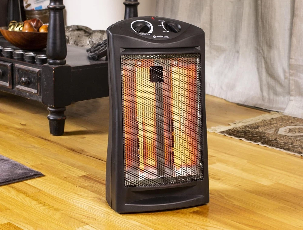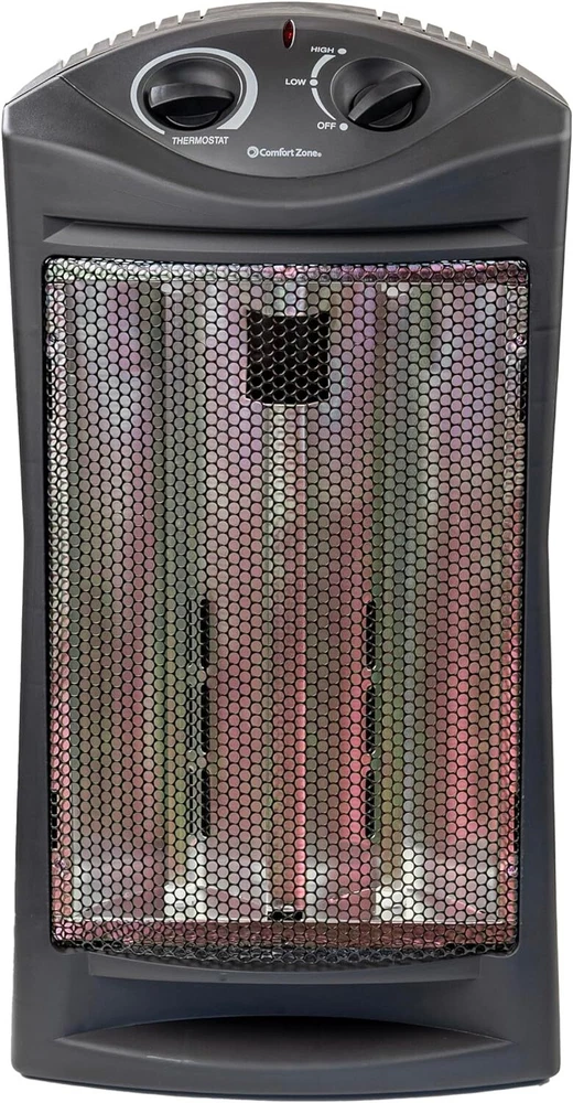 Comfort Zone Indoor Tower Space Heater, Adjustable Thermostat, Radiant Black Product Details Brand: Comfort Zone Special Feature: Cool Touch Exterior, Portable, Manual Thermostat, Overheat Protection Color: Black Form Factor: Tower Indoor/Outdoor Usage: Indoor Product Dimensions: 12.4"D x 9.06"W x 22.83"H Recommended Uses For Product: Office, Home Mounting Type: Stand alone Room Type: Office, Living Room, Bedroom Heating Coverage: 150 sq. ft. Burner type: Radiant EU Spare Part Availability Duration: 2 Years Fuel Type: Electric Number of Speeds: 3 Voltage: 120 Volts Amperage: 12.5 Amps Item Weight: 5.14 pounds Manufacturer: World and Main Country of Origin: USA Item model number: CZQTV007BK Is Discontinued By Manufacturer: No Assembly required: No Number of pieces: 1 Batteries required: No Included Components: Heater Power SourceHeating Method: Corded ElectricRadiant Item WeightHeat Output: 5.14 Pounds1500 Watts EFFICIENT RADIANT HEAT: Experience rapid and thorough heating with our practical radiant heater. Equipped with dual quartz tubes, this heater instantly emits a comforting warmth and creates a soothing glow when in use. Enjoy the focused and efficient heat output that quickly warms the people and objects in front of it, providing a cozy environment within a coverage area of 200-300 square feet. EVEN HEAT DISTRIBUTION: Experience enhanced heat dispersion with the fan-assisted feature of this heater. The fan helps to evenly and efficiently distribute the warmth throughout rooms, ensuring a comfortable and cozy environment. Whether it's your office or bedroom, this heater is a reliable choice for maintaining a pleasant temperature in any space. USER-FRIENDLY CONTROLS: The heater is equipped with two convenient top-mounted control knobs, providing you with effortless control over the thermostat and temperature settings. Adjusting the thermostat and switching between high and low temperature settings is quick and easy, ensuring optimal comfort with just a simple twist. ADVANCED SAFETY FEATURES: This heater is equipped with a range of smart safety features to ensure your peace of mind. The stay-cool molded handle allows for safe and convenient handling, while the durable metal housing adds an extra layer of protection. The tip-over switch instantly shuts off the heater if it is accidentally knocked over, and the overheat protection system prevents it from reaching unsafe temperature levels. Enjoy warmth without worry, thanks to these enhanced safety measures. SLEEK AND SPACE-SAVING: This quartz heater boasts a slim and stylish design, making it the perfect choice for smaller spaces. Its compact size allows it to fit seamlessly into any room, while the sleek black finish adds a touch of elegance that effortlessly blends with various decor styles. Enjoy both warmth and aesthetic appeal with this modern and space-saving heater. Powerful and Efficient Radiant HeaterCreate a warm and comfortable space for work or relaxation with this Comfort Zone Radiant Quartz Tower Heater. By lowering your home thermostat slightly and using this heater to warm just the room you are occupying, it can lead to significant savings on your heating bills. The heater employs dual quartz tubes, which heat up quickly and give off a warm glow when in use.Practical Settings and Convenient ControlsThe quartz heater offers two different heat settings. It is fan-assisted to help disperse the heat more evenly throughout your space. You can switch between the high and low heat settings by simply turning a knob at the top of the unit. A second knob allows you to easily adjust the thermostat to just the right temperature for your space. Advanced Safety FeaturesA tip-over switch automatically turns the heater off if it is knocked over to help prevent fires, while a built-in sensor helps to prevent the unit from overheating. A molded handle makes it easy to carry, and the stay-cool handle and housing allow you to safely transport it from room to room. Stylish and Compact Modern DesignThe Comfort Zone Quartz Heater has a space-saving design that fits into small rooms with ease. It comes in a sleek black finish that effortlessly complements a wide variety of different décor styles.