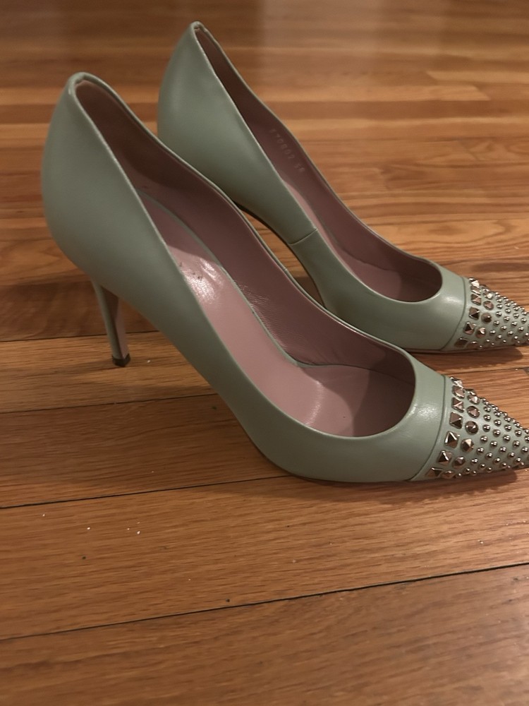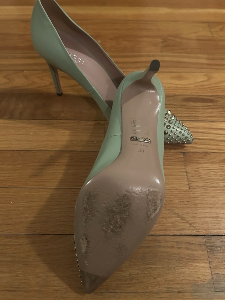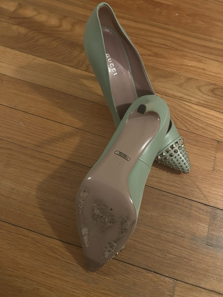 Elevate your ensemble with these elegant Gucci pumps, perfect for any cocktail party or sophisticated summer soiree. Boasting a vibrant green hue, these heels are crafted from premium leather and feature a durable rubber outsole for lasting comfort and stability. With a size of 7.5 US, they are tailored to fit the discerning woman's foot with impeccable style. The shoes' design is a harmonious blend of classic and contemporary, ensuring that they'll be a versatile addition to your wardrobe. Whether it's a wedding, a gala, or a dinner date, these pumps will complement your look with their timeless appeal and chic flair.