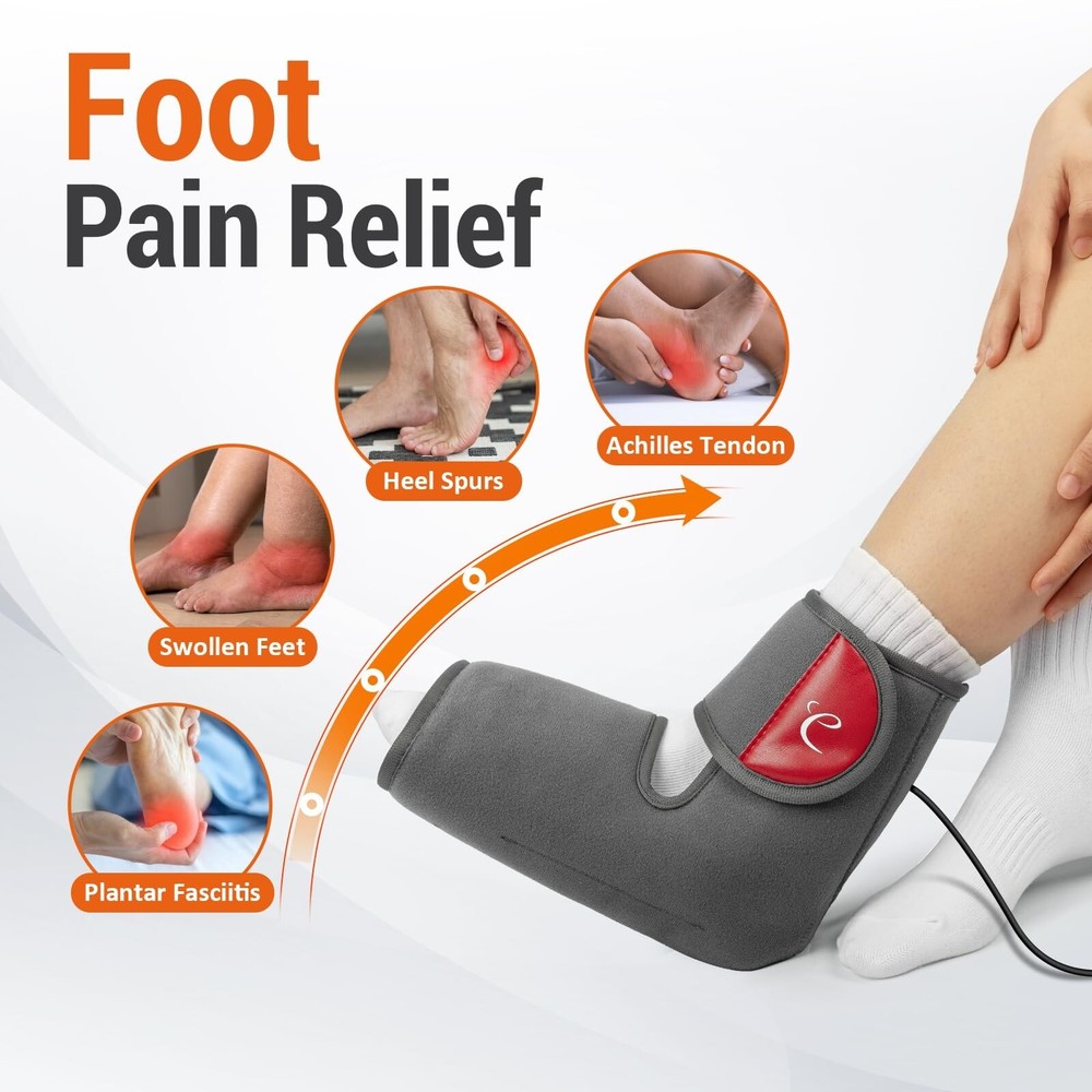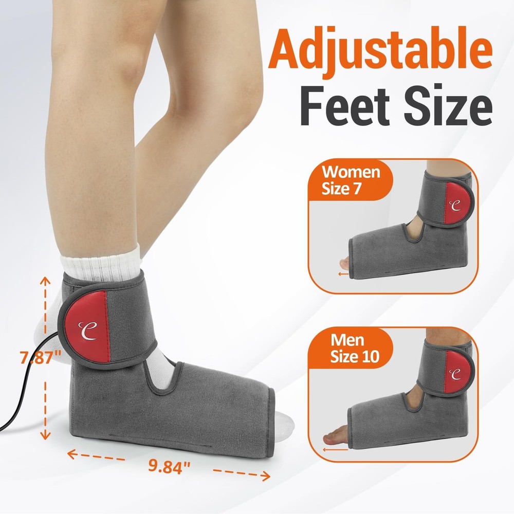 Comfytemp Foot Heating Pad for Plantar Fasciitis, FSA HSA Eligible Foot Pain Relief Products for Achilles Tendonitis Sprained Ankle Heel Spur, Heated Ankle Wrap Foot Warmer with 3 Heat and Time Sets Product Details Brand: Comfytemp Size: Medium Use for: Feet Color: Grey Unit Count: 1.0 Count Package Dimensions : 10 x 4.88 x 2.64 inches; 13.4 ounces Date First Available : August 21, 2024 Manufacturer : Shenzhen Yicai Health Technology Co. , Ltd. Country of Origin : China Foot Pain Relief: This heating pad for foot provides warmth to two ankle sides, the heel, and the foot sole. It is ideal for post-workout recovery and soothing sports-related injuries like ankle sprains, strains, heel pain, and swelling. Heat and Time Sets: This Heel spur relief products offers three heat levels (high, medium, and low) and three time options (15, 30, or 60 minutes), allowing you to tailor the temperature and duration for the best foot relief experience. Better Wearable Experience: Equipped with two adjustable straps, heated foot wrap ensures a secure and comfortable fit around your foot. The upper strap adjusts around the ankle, while the lower strap secures around the foot for maximum warmth. Soft and Lightweight: Made from soft, cozy flannel lining, this heated foot pads offers comfort and effective heat relief. It features a lightweight design with no additional controller, and the settings are located on the side for easy access. Gift of Comfort: Our FSA HSA approved foot heater is a good present for Mom and Dad on Mother's Day and Father's Day, or for birthdays and Christmas. Ideal for anyone you care about, offering warmth and relief when they need it most.