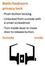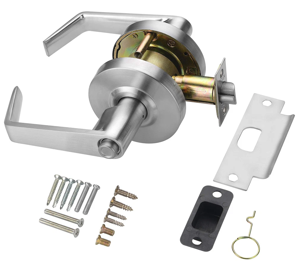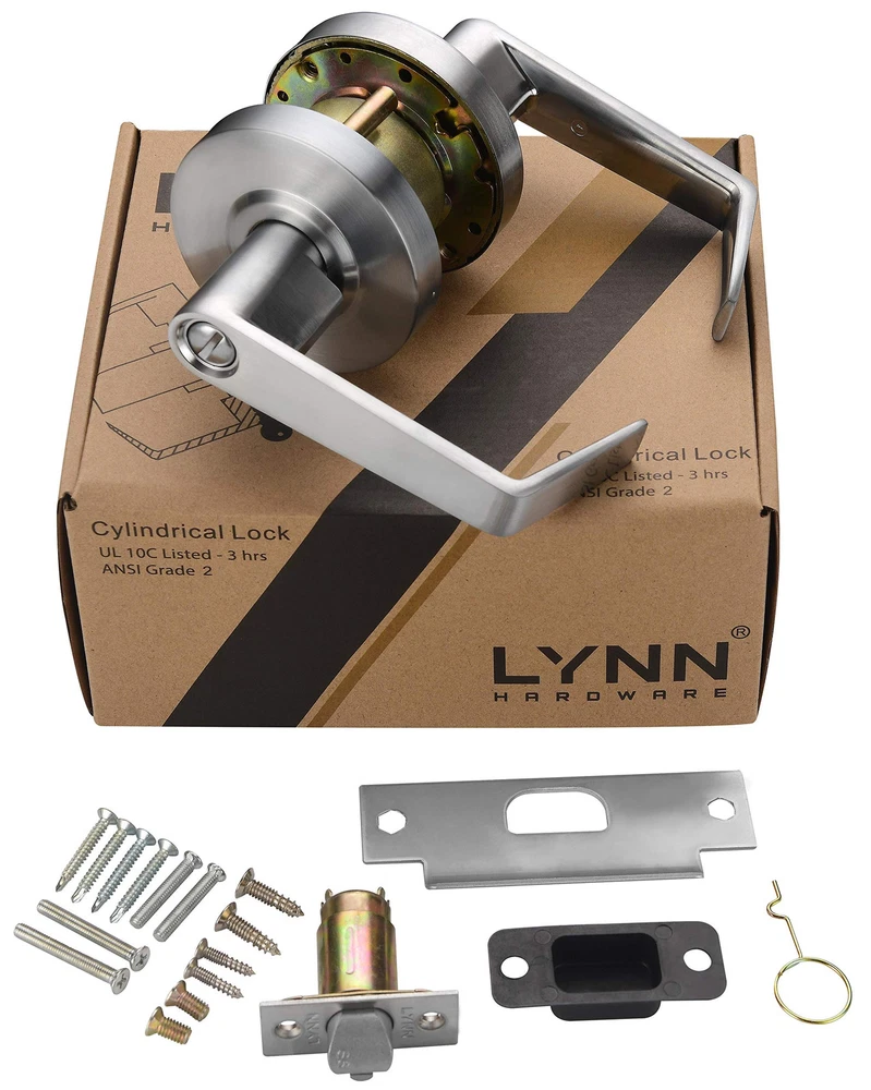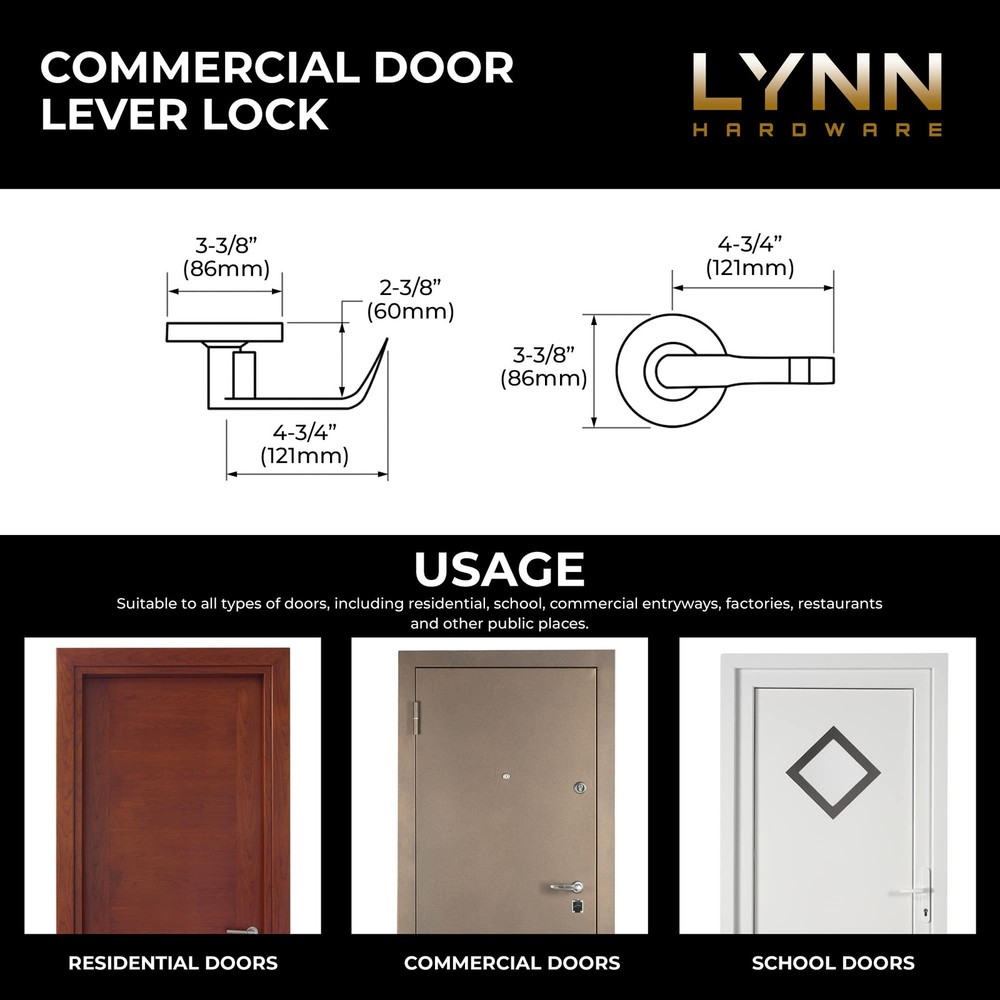 FUNCTION: Commercial lever door knobs with locks from are available for specific entrances. This "Privacy/Bathroom Function" variety involves locking the outside lever by pushing a button on the inside and unlocking it from the outside by using a flat object (coin or screwdriver) to turn the button for emergency entrance. Also, turning inside lever or closing the door will release the button. The inside lever is always free for immediate egress. COLOR & SIZING: Our commercial door locks are offered in Satin chrome and aluminum finish (26D finish). Designed for 1-3/8" to 1-3/4" (35mm to 44mm) doors, they fit 1-1/2" to 2" thick doors and come standard with a 2-3/4" backset. These are non-handed commercial door levers, so they are suitable for either right- or left-handed doors. SPECIFICATIONS: Our door hardware & locks come with standard ANSI 4-7/8" x 1-1/4" square corner strikes and 1-1/8" x 2-1/4" square corner faceplates. The backset is 2-3/4" (70mm), the stainless steel Roses are 3-3/8" (90mm) in diameter, and Latchbolt Stainless steel is 1/2" (12.5mm) throw standard. These specifications make our door lever handle lock fitting for 161 door prep & regular 2-1/8″ bore prep. CERTIFICATION: Designed to be a reliable commercial door hardware, our heavy-duty entry key locks are ANSI/BHMA A156.2 - Grade 2 (exceeds 400,000 cycles) certified and UL listed. Each lever door handle with lock is made to meet A117.10 accessible design standards. It is also fire rated for up to 3 hours. Our commercial door locks meet the needs of home/business owners, apartment managers, contractors, maintenance facility managers, handymen, locksmiths, and property managers. WHAT'S IN A BOX: Each box of lever door handle locks includes 1 cylindrical lockset, screws and bolts, user-friendly instructions, 1 ANSI strike, 1 reversible latch unit, and 2 pre-cut keys (Schlage C-Keyway (6 pin cylinder) that are re-keyable. The heavy-duty door closer features cold-rolled steel, machined and threaded hubs, and locking nuts to securely bolt the chassis to the door, thereby preventing loosening of the lockset even with hundreds of uses per day.