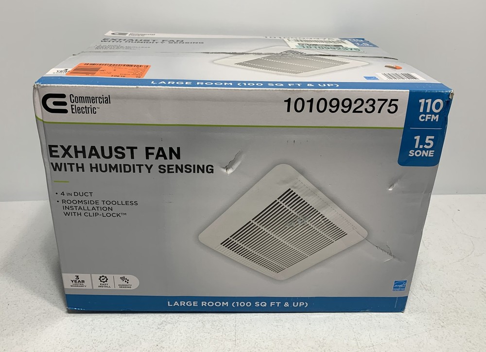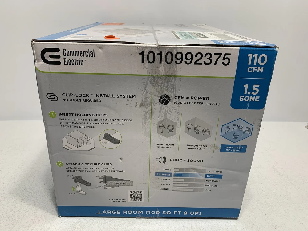 PRODUCT DESCRIPTION Product Details: Condition: New BrandName: Commercial Electric ManufacturerSKU: 1010992375 This is a New Commercial Electric BPT14-240D-H Exhaust Fan 110 CFM Humidity Sensing. It is designed for use in related applications as specified by the manufacturer. Details: Brand: Commercial Electric Manufacturer Part #: 1010992375 Condition: Brand new, unused, and in original packaging. 110 CFM suitable for large rooms (100+ sq ft) 1.5 Sone operation Humidity sensing feature Clip-lock tool-free installation Shipping: Will ship FedEx Ground — Free Shipping. Expedited shipping options available at checkout. Find one of our products cheaper elsewhere? We will beat the price. Feel free to make an offer. © Copyright Chase Surplus, Inc. All rights reserved.