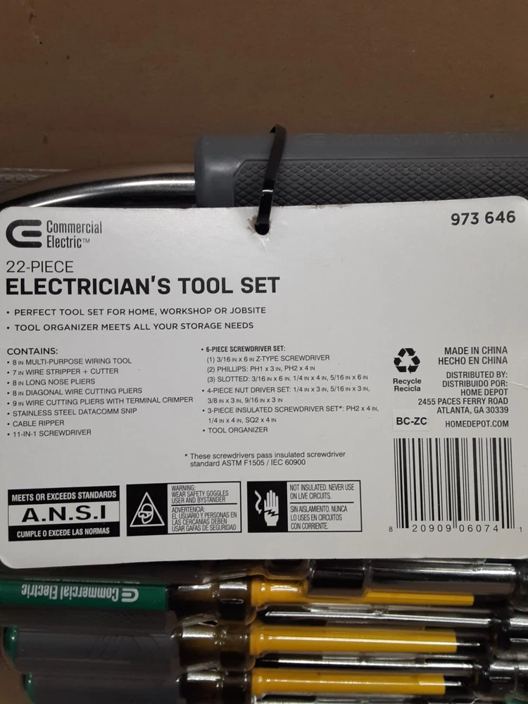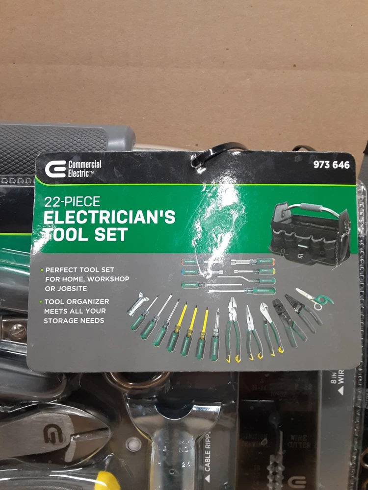The Commercial Electric 22-Pc Electrician Tool Set 973 646 is a comprehensive kit designed for electricians. Made by Commercial Electric, the set includes 26 units of various tools essential for electrical work. Tools such as cable cutters, cable pliers, and a hand cable stripper are included, ensuring that electricians have the necessary equipment to efficiently perform their tasks. Manufactured in China, this tool set provides a range of tools for electrical projects, making it a valuable addition to any electrician's tool collection.