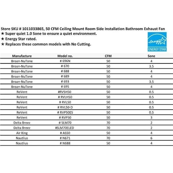 About This Product This Commercial Electric ultra quiet bathroom exhaust fan features a square grill design. This ventilation fan is quiet at 1.0 Sone, ENERGY STAR qualified 50 CFM fan, making it perfect for your small room areas. Ease of installation with the room side design for spaces with no attic access and quick template for drywall applications. Features a patented unique clip lock installation system attaching the bath fan securely to your ceiling dry wall. Highlights 50 CFM, powerful ventilation to remove moisture in small spaces (up to 50 sq. ft.) 1.0 sones for quiet operating performance 10 in. square bath fan with 3 in. duct size and 7.5 in. housing Designed with simple construction featuring a modern style Ideal for managing odors and moisture removal in small rooms Built-in energy-efficient DC motor engineered to save more energy 3-year limited manufacturer warranty Input-voltage 120-Volt Damp location rated suitable for high humidity environments Click here for more information on Electronic Recycling Programs Return Policy Product Information Internet # 329101543 Model # BF1101 Store SKU # 1011033865