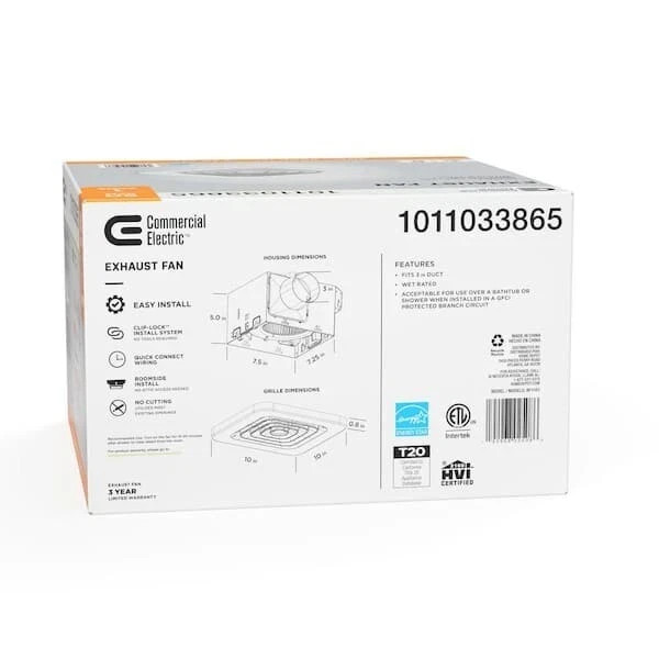 About This Product This Commercial Electric ultra quiet bathroom exhaust fan features a square grill design. This ventilation fan is quiet at 1.0 Sone, ENERGY STAR qualified 50 CFM fan, making it perfect for your small room areas. Ease of installation with the room side design for spaces with no attic access and quick template for drywall applications. Features a patented unique clip lock installation system attaching the bath fan securely to your ceiling dry wall. Highlights 50 CFM, powerful ventilation to remove moisture in small spaces (up to 50 sq. ft.) 1.0 sones for quiet operating performance 10 in. square bath fan with 3 in. duct size and 7.5 in. housing Designed with simple construction featuring a modern style Ideal for managing odors and moisture removal in small rooms Built-in energy-efficient DC motor engineered to save more energy 3-year limited manufacturer warranty Input-voltage 120-Volt Damp location rated suitable for high humidity environments Click here for more information on Electronic Recycling Programs Return Policy Product Information Internet # 329101543 Model # BF1101 Store SKU # 1011033865