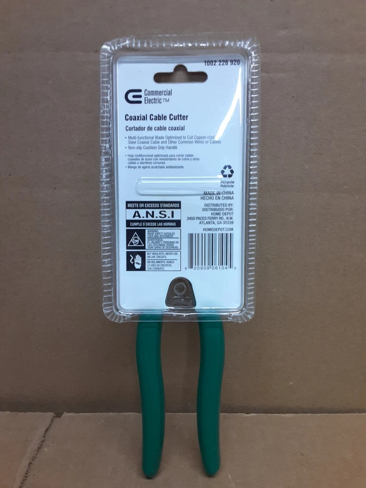 The Commercial Electric Coaxial Cable Cutters 1002 226 920 are a hand tool designed for cutting coaxial cables with precision. Manufactured by Commercial Electric, these cable cutters are specifically designed for electrical applications. The product is ideal for professionals working in the electrical industry or any DIY enthusiast looking for a reliable tool to strip and cut coaxial cables efficiently.