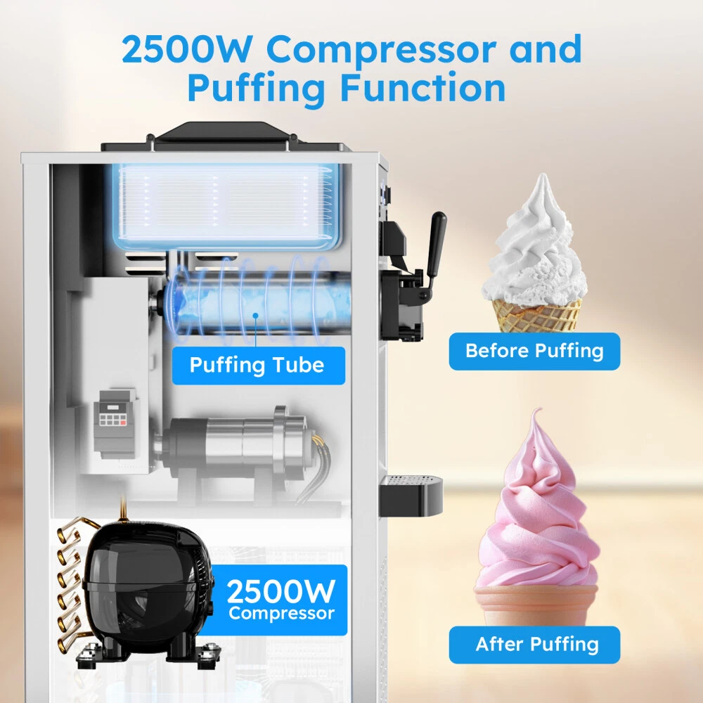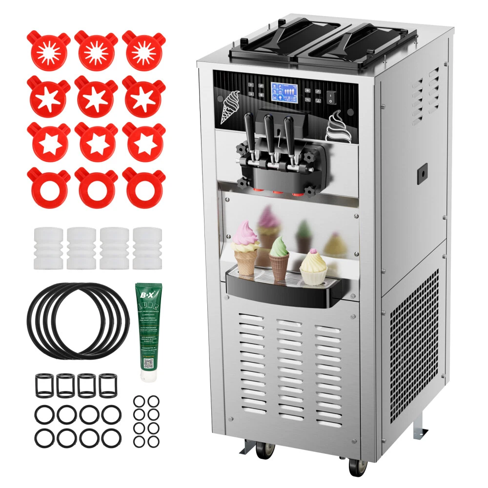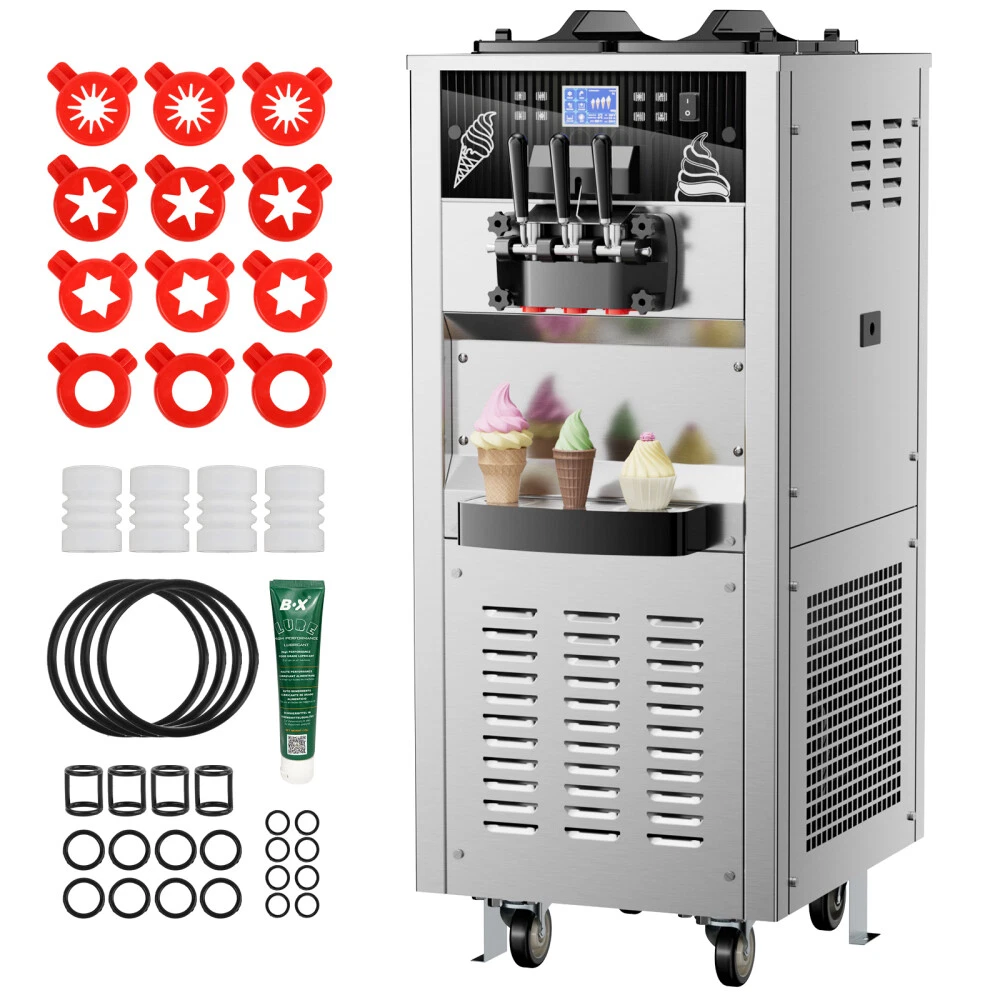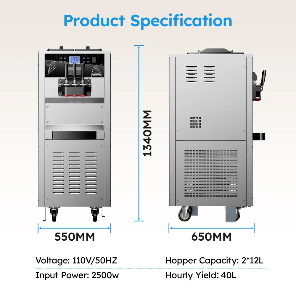 Description Commercial Ice Cream Maker Machine - 3 Flavors Soft Serve Ice Cream Machine, 5.3 to 7.4 Gallons Per Hour, Auto Clean LED Panel, for Bars, Restaurants and Other Establishments Powerful Performance - The 2500W power (total) provides continuous and lasting power for our soft ice cream machine. Driven by brand compressor, this commercial ice cream maker has faster cooling, run quieter, down to 68 decibels, and lower power consumption. The pre-cooling compressor and the integral foaming layer keep your ingredients fresh for longer. The ice cream machine can adapt to a variety of different climates(41℉ ~ 91.4℉). Intelligent LCD Panel Control - This soft serve ice cream machine With LED display design, you can directly observe and control the quantity, hardness, and temperature of the ice cream without bending over. You can put the raw materials in the hopper overnight and enjoy tastier ice creams thanks to the pre-cooling and deep puffing function. 2 + 1 Flavors - This commercial ice cream machine is designed with double 3.2 Gal (12L) hoppers,both made of food-grade 304 stainless steel, including 2 single flavors and 1 mixed flavor. During the mixing process, you can add your favorite foods. Is widely applicable for snack bars, cafés, bakeries, fast food chains, restaurants, buffets, etc. One-Touch Cleaning - The machine has a one-touch cleaning function. When cleaning the ice cream machine before making ice cream, just pour water into the hopper and press the cleaning button to automatically clean it. Wait for a while to drain the sewage from the discharge port. Besides, the shortage alarm will remind you to add more ingredients to the mixing hopper. There is a condensate drain under the body to prevent condensate from falling into the machine and causing damage to the machine. Intimate design - Our soft serve machine combines user-friendly designs to improve your user experience. The dust-proof lid effectively keeps your mixtures clean and sanitary. handles are ergonomically designed and make pressing ice cream out effortless. The extensive cooling vents on both sides facilitate rapid heat dissipation and avoid over-heating damage. The drip tray is detachable for regular cleaning, and 4 caster wheels (2 with brake) make it easy to move on the floor. Type: Commercial SoftIce Cream Maker Materail: 304 Stainless Steel Special Feature: Manual Included Components: Mixers Model Name: T240 Hourly Output: 10.6 gal / 40L Power: 2500W Voltage: 110V /50HZ Refrigerant: R410 Hopper capacity: 2*12L First Molding Time: 8-12 Mins Product Dimensions: 21.65 x 25.59 x 52.8 in Product Weight:374.78 lb Product Care Instructions: Hand Wash Shipping Payment Returns Contact Us Item will be shipped from our USA warehouse which located in California / New Jersey / Illinois / Georgia by UPS / Fedex / USPS within 1-3 business days. Domestic orders usually takes 1-5 days to arrive. Please make sure your address is the right address in eBay before payment. All Friday orders will be shipped on next Monday morning. We accept credit cards, debit cards, Apple Pay, Google Pay, PayPal and other payment methods. All major credit cards are accepted through PayPal, a secure payment processor.Payment is due within 4 days after the auction ends. Otherwise a dispute of non-payment will be filed and the auction will be closed. 60 days Money-Back Guarantee. You can return the UNUSED item back to us for a full refund. Please contact us for return process before you return the item. If we sent wrong item, we will pay for return shipping fee. If buyer ordered wrong item, buyer pays return shipping fee. Email Customer Support: 9:00am-2:00am PST Sunday-Friday All emails will be responded to within 12-24hours If you have any problem, please feel free to contact us, we will try our best to solve the problems for you.