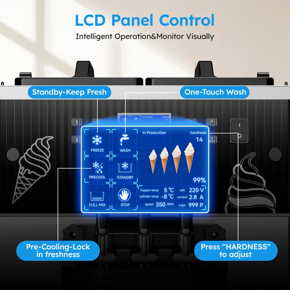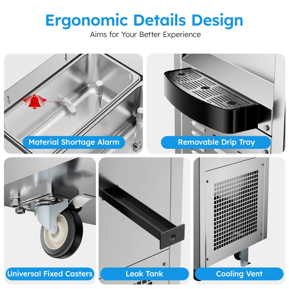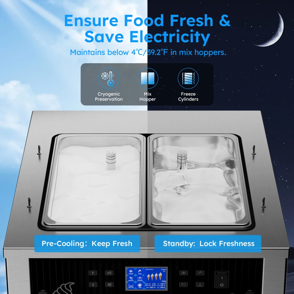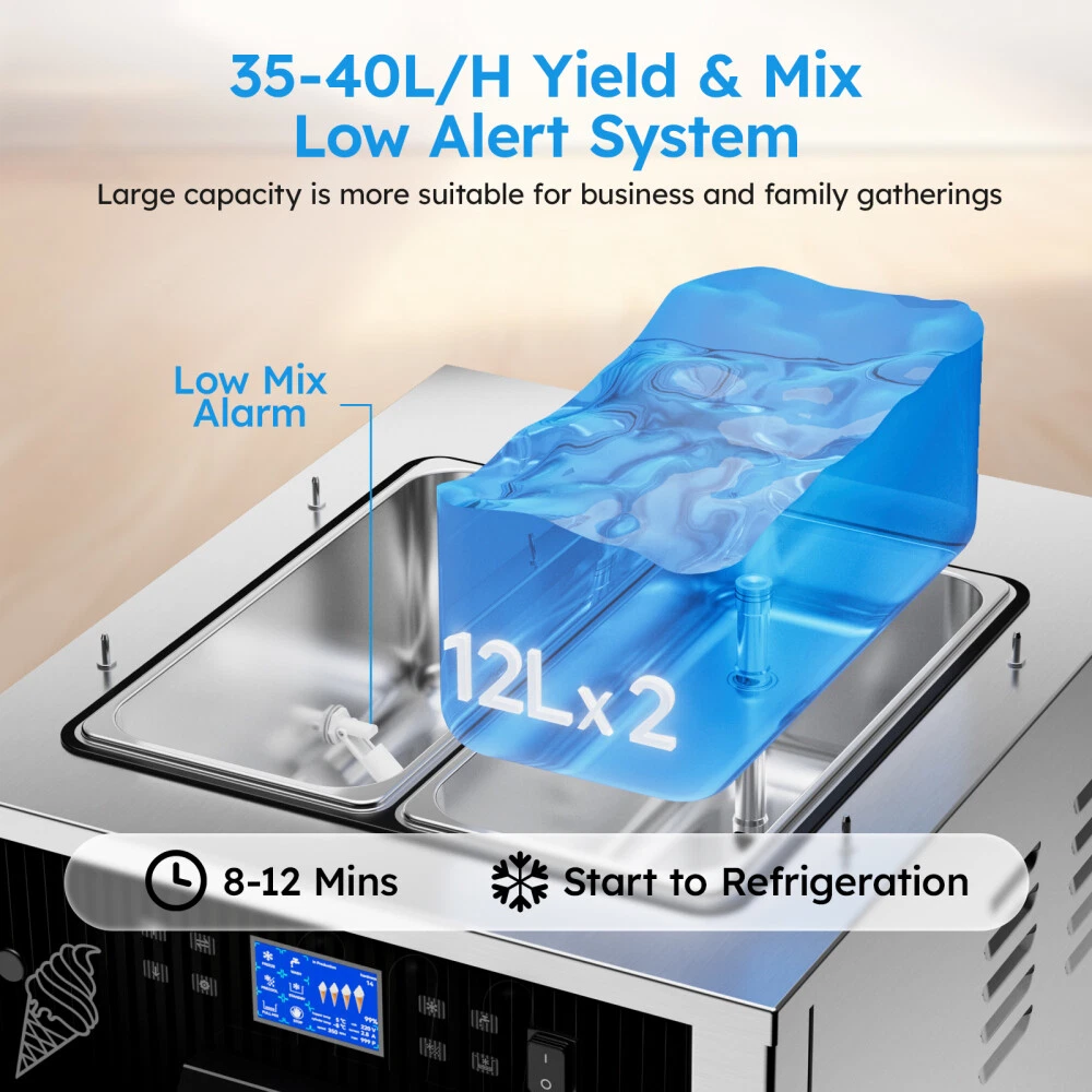 Description Commercial Ice Cream Maker Machine - 3 Flavors Soft Serve Ice Cream Machine, 5.3 to 7.4 Gallons Per Hour, Auto Clean LED Panel, for Bars, Restaurants and Other Establishments Powerful Performance - The 2500W power (total) provides continuous and lasting power for our soft ice cream machine. Driven by brand compressor, this commercial ice cream maker has faster cooling, run quieter, down to 68 decibels, and lower power consumption. The pre-cooling compressor and the integral foaming layer keep your ingredients fresh for longer. The ice cream machine can adapt to a variety of different climates(41℉ ~ 91.4℉). Intelligent LCD Panel Control - This soft serve ice cream machine With LED display design, you can directly observe and control the quantity, hardness, and temperature of the ice cream without bending over. You can put the raw materials in the hopper overnight and enjoy tastier ice creams thanks to the pre-cooling and deep puffing function. 2 + 1 Flavors - This commercial ice cream machine is designed with double 3.2 Gal (12L) hoppers,both made of food-grade 304 stainless steel, including 2 single flavors and 1 mixed flavor. During the mixing process, you can add your favorite foods. Is widely applicable for snack bars, cafés, bakeries, fast food chains, restaurants, buffets, etc. One-Touch Cleaning - The machine has a one-touch cleaning function. When cleaning the ice cream machine before making ice cream, just pour water into the hopper and press the cleaning button to automatically clean it. Wait for a while to drain the sewage from the discharge port. Besides, the shortage alarm will remind you to add more ingredients to the mixing hopper. There is a condensate drain under the body to prevent condensate from falling into the machine and causing damage to the machine. Intimate design - Our soft serve machine combines user-friendly designs to improve your user experience. The dust-proof lid effectively keeps your mixtures clean and sanitary. handles are ergonomically designed and make pressing ice cream out effortless. The extensive cooling vents on both sides facilitate rapid heat dissipation and avoid over-heating damage. The drip tray is detachable for regular cleaning, and 4 caster wheels (2 with brake) make it easy to move on the floor. Type: Commercial SoftIce Cream Maker Materail: 304 Stainless Steel Special Feature: Manual Included Components: Mixers Model Name: T240 Hourly Output: 10.6 gal / 40L Power: 2500W Voltage: 110V /50HZ Refrigerant: R410 Hopper capacity: 2*12L First Molding Time: 8-12 Mins Product Dimensions: 21.65 x 25.59 x 52.8 in Product Weight:374.78 lb Product Care Instructions: Hand Wash Shipping Payment Returns Contact Us Item will be shipped from our USA warehouse which located in California / New Jersey / Illinois / Georgia by UPS / Fedex / USPS within 1-3 business days. Domestic orders usually takes 1-5 days to arrive. Please make sure your address is the right address in eBay before payment. All Friday orders will be shipped on next Monday morning. We accept credit cards, debit cards, Apple Pay, Google Pay, PayPal and other payment methods. All major credit cards are accepted through PayPal, a secure payment processor.Payment is due within 4 days after the auction ends. Otherwise a dispute of non-payment will be filed and the auction will be closed. 60 days Money-Back Guarantee. You can return the UNUSED item back to us for a full refund. Please contact us for return process before you return the item. If we sent wrong item, we will pay for return shipping fee. If buyer ordered wrong item, buyer pays return shipping fee. Email Customer Support: 9:00am-2:00am PST Sunday-Friday All emails will be responded to within 12-24hours If you have any problem, please feel free to contact us, we will try our best to solve the problems for you.