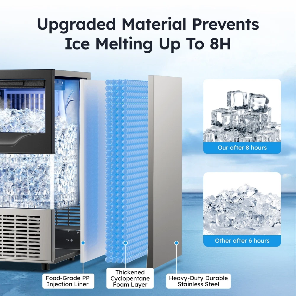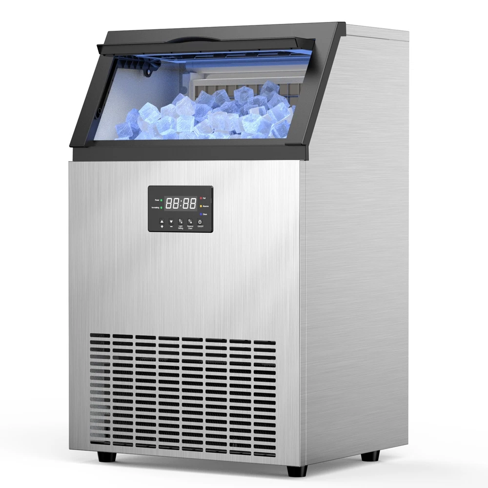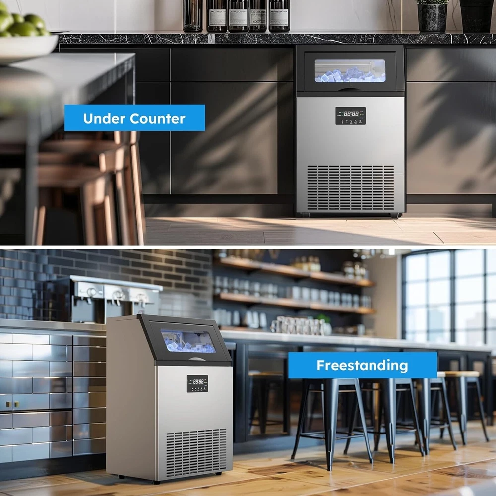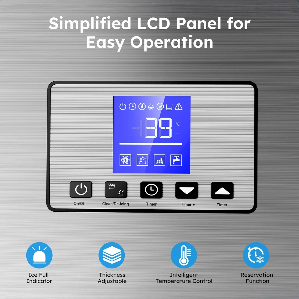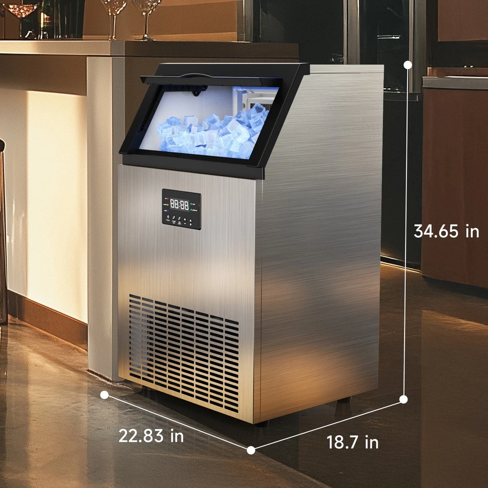 Description Commercial Ice Maker Machine 450lbs/24h; 200lbs/24h with LargeStorage Bin, Tap Water Freestanding Ice Machine with Stainless Steel Ice Scoop Ice Bucket, Ice Maker Machine for Home Bar Restaurants Bar Ice Making Capacity: 450lbs/24h; 200lbs/24h(For choice options) Voltage:115V, 60Hz Longest preset time: 24H Storage Capacity: 50lbs ; 12 0lbs Ice Number/Cycle: 55pcs clear ice cubes; 55pcs clear ice cubes Material: Stainless Steels Application: Home Bar Coffee Food Shop Ice cube size: 0.87”x0.87”x0.87”/2.2x2.2x2cm Intelligent LCD Panel: Ice Maker Commercial is equipped with an LCD panel Uniqueness: Compact Size Large Capacity Large Industrial Ice Machine Quick Ice Maker: Commercial ice machine adopts advanced freezing technology to produce 150~200lbs ice every 24 hours; Each cycle takes only 8-15 mins to generate 96 pieces of ice; Comes with 50lbs storage bin and an extra 2-liter ice storage bucket for additional storage Quiet & Energy-Saving: This commercial ice maker features an upgraded compressor that helps save 35% on electricity with quiet operation; 20% thicker insulation layer effectively insulates for up to 8 hours; Enjoy high efficiency and low noise operation Advanced User Experience: The freestanding commercial ice maker boasts a convenient control panel with intuitive buttons; Enjoy one-touch automatic cleaning, 24h reservation, and effortless adjustment of ice cube thickness by "Ice Thickness" buttons for precise cycle regulation; The stainless steel ice machine automatically stops making ice at the set temperature and time to prevent over-freezing or melting; Additionally, the self-cleaning function efficiently eliminates interior dirt buildup, ensuring that you always receive clean and fresh ice cubes Promotes Clean Lifestyle: Troubled with dirt accumulation on the inside of the under counter ice machine? Ice maker commercial solves this problem with one-touch self-cleaning function, water filter in the inlet pipe, and a food-grade PP injection liner interior that creates a safe and clean ice-making environment Excellent Service: Do not hesitate with any inquiries about the ice maker machine; Our outstanding support team, knowledgeable about commercial ice machines, is here to provide reliable assistance On Feb 18, 2025 at 03:29:54 PST, seller added the following information: