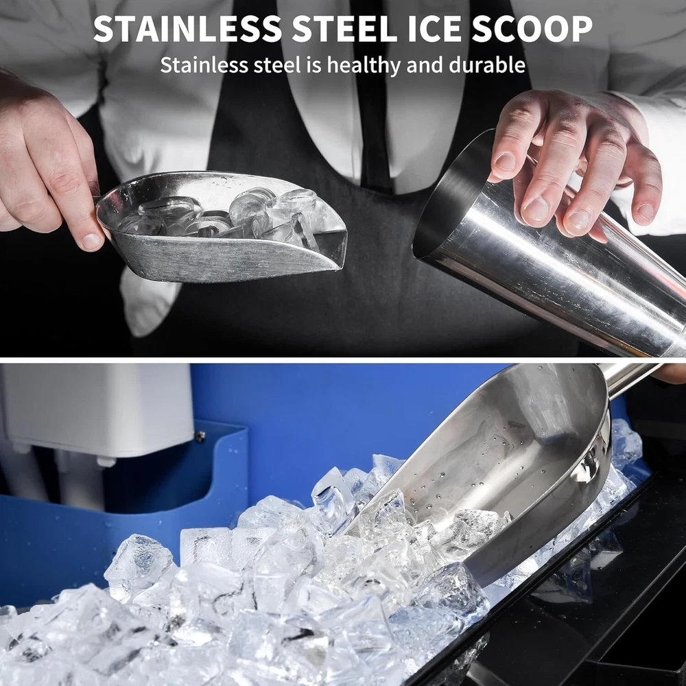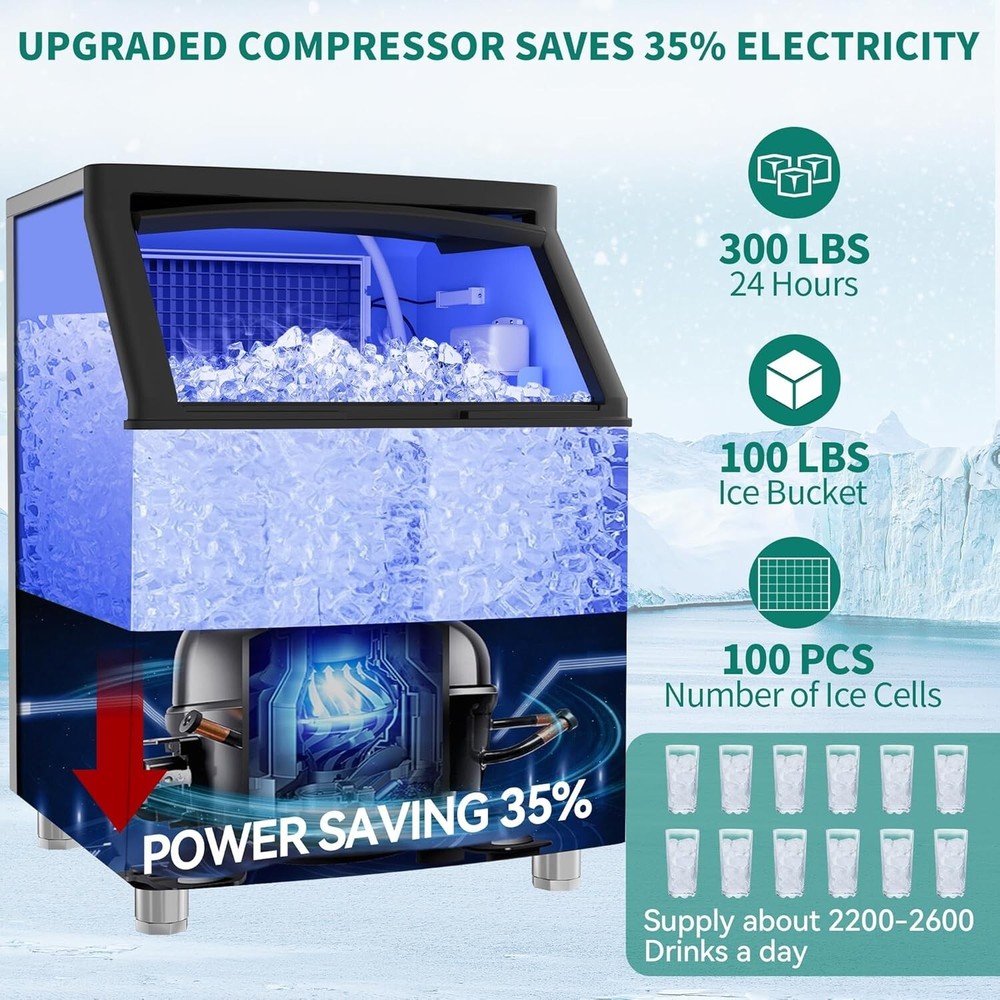 Description Upgraded Commercial Ice Maker Machine 300LBS/24H 350LBS/24H 450LBS/24H with 120lbs Storage Bin, Stainless Steel Ice Scoop, Blue Light, Freestanding Ice Machine for Home, Restaurants, Bars Ice Making Capacity: 300lbs/24h; 350lbs/24h; 450lbs/24h (For choice options) Voltage:115V, 60Hz Longest preset time: 24H Storage Capacity: 100lbs ; Ice Number/Cycle: 126pcs clear ice cubes Material: Stainless Steels Application: Home Bar Coffee Food Shop Size: 28"D x 26"W x 37"H Ice cube size: 0.87”x0.87”x0.87”/2.2x2.2x2cm Intelligent LCD Panel: Ice Maker Commercial is equipped with an LCD panel Uniqueness: Compact Size Large Capacity Large Industrial Ice Machine 300~450lbs/24h High Efficiency : Never run out of ice again with the commercial freestanding ice maker; It can produce up to 300lbs/350lbs/450lbs of ice in 24 hours, store up to 100lbs of ice and make 126 clear and hard ice cubes every 8-15 minute cycle; Say goodbye to trips to the store and always have fresh ice on hand. Ice cubes maded by this light ice maker is 0.87”x0.87”x0.79”/2.2x2.2x2cm, which is larger. And the thickness of the ice cube can be adjusted by changing ice making time Quality Certifications: Our ice makers under counter passed the ETL certification with its heavy duty stainless steel shell surface, cyclopentane foaming layer, food-grade pp liner, high quality compressor, copper tube, water filter and powerful fans, ensuring a continuous supply of healthy ice for you and your customers. The premium water filter can turn tap water into pure water, making ice clear. Food-grade PP injection liner interior grants a safe and hygienic ice-making environment Electricity Saving and Quiet: The highly efficient CFC-free upgraded compressor allows the the commercial ice machine to save up to 35% on electricity, quickly driving up the freezing system and providing you with a constant supply of freshest ice at amazingly high efficiencies. In addition, it operates quietly, providing you with a comfortable environment. The ice maker is perfect for keeping drinks at the ideal temperature for offices, homes, restaurants, bars, hotels, parties and hosting EXTENDED COOLING TIME: The ice maker machine commercial is equipped with a 20% thicker cyclopentane insulation layer, delivering excellent insulation performance by blocking external heat. The insulation time is extended from 6 hours to 8 hours, effectively preventing ice cubes from melting. Built in Blue Light, this ice making machine improves the maintenance time of ice, slowing down the speed of ice melting. Designed with flip cover, it is easy to facilitate ice fetching with given ice scoop ADVANCED INTELLIGENT EXPERIENCE: Compared with ordinary ice maker machines, operations can be solved in this smart LCD control panel, adjusting the ice thickness, one key cleaning, 24-hour reservation, defrosting, reminders and other functions can be realized with one poke, simple operation while bringing the upgrade of appearance and advanced intelligent feeling of use. With reminders functions, you can easily know about ice full or water shortage EXPERIENCED SUPPORT TEAM: Before first using, please keep it upright for 24h and read the instruction manual. With Malfunction reminders and comprehensive instruction manual, small problems can be easily solved. And our dedicated support team consists of experienced professionals who are well-equipped to handle any post-purchase issues or questions. They have the knowledge and expertise about commercial ice machines and can provide reliable assistance and solutions