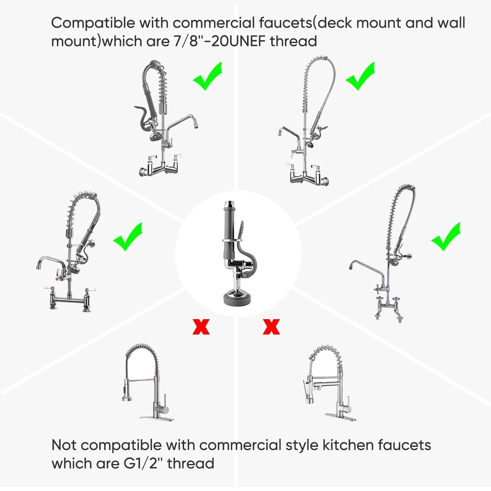 Commercial sink sprayer restaurant sprayer dishwasher sprayer pre rinse spray valve,1.42GPM high pressure commercial faucet sprayer head,dish sprayer nozzle with ergonomic handle fits for most commercial kitchen sink faucet 【Pre Rinse Sprayer】 Our pre rinse sprayer is designed for all kinds of commercial faucet on the market.It is widely used for hotel,restaurant,coffee shop and heavy-duty commercial kitchen 【Dish Sprayer Nozzle】 The sprayer features rubber nozzles that avoid hard water and limescale buildup,and it’s easy to clean and maintenance.Just need to unscrew the bottom screw 【Commercial Sink Sprayer】 The water flow of this sprayer is 1.42 GPM.The high pressure makes your cleaning task easily.Easier to clean grease and sauces from dishes 【Hold-down O-ring】 The function of o-ring is to keep the handle in place,make the sprayer keep working.It can free your hands if you need to use this pre rinse sprayer for a long time 【Pre Rinse Spray Valve Size】 The handle end thread is 7/8"-20UNEF male thread,spray valve thread is 3/4"-14UNEF.male thread