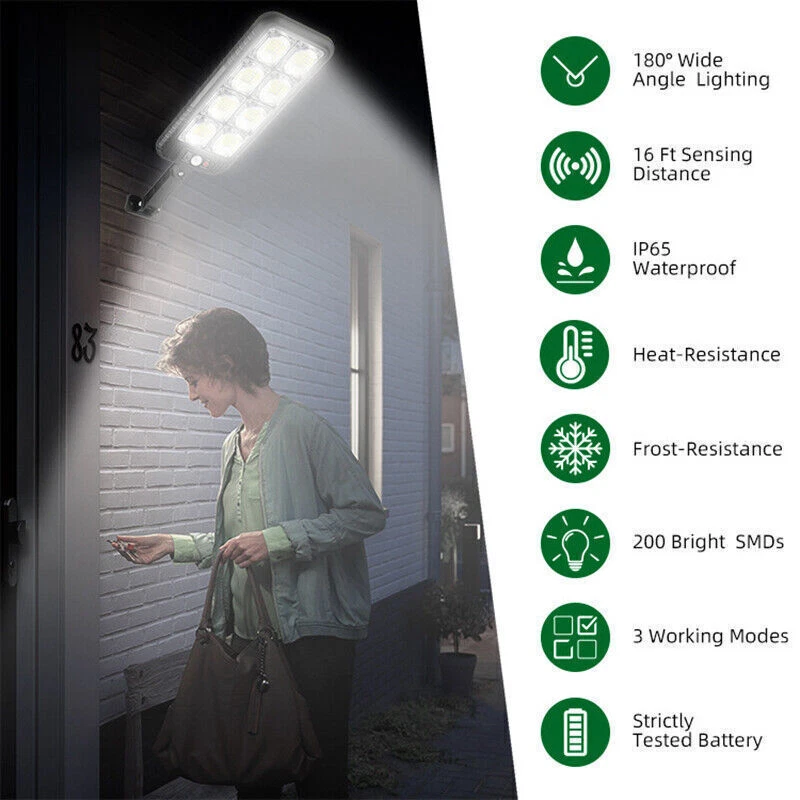 Product Description Product Description Commercial Solar Street Flood Light LED Lamp Outdoor Area Dusk-To-Dawn Wall Lamp Description: LED Solar Light Outdoor: The LED solar street lights outdoor produce ultra-high brightness illumination for a wide area, providing lighting and security to front door, pathway, gutter, porch, front/back yards, gardens, driveways, fence, wall, stairways, landscape, patio or any outdoor places that needs lighting, bring you a super bright lighting experience. 3 Optional Modes & Remote Control: 1. Sensing Mode - Strong light for 20s once movement detected, then turn off. 2. Constant Light + Sensing Mode - Dim light all night, and strong light for 20s when sensor detects movement. 3. Constant Light Mode - Medium light mode all night. 120° Wide-Angle Solar Lighting: The outdoor wall lights features high sensitivity and adjustable bracket design, can sensitively sense moving objects in 10 ~ 15ft with 120° range, providing security and convenience for your home when night falls. High Efficient Solar LED Outdoor Lights: These solar light are made of more energy saving laminated solar panel and premium LED lights, which will be more long-lasting and suitable for longer usage time. Build-in 2400mAh rechargeable lithium-ion battery to allows the LED solar lights to be continuously illuminated for 6 ~ 10 hours in bright mode to meet your lighting needs. IP65 Waterproof & Easy Installation: The solar street lights is made of long-lasting and high-impact ABS Material which makes it to withstand a variety of outdoor environments and other extreme weather conditions. Easy to install and set, no wire and tools need. Specification: Product Name: Solar Street Light Light Body Material: ABS + PC Light Color: Cold White 6500K LED QTY: 200SMD Waterproof: IP65 Battery Capacity: 3.7V 2400mAh Charging Time: 6 ~ 8hrs Direct in the Sun Working Time: 6~ 10hrs Installation Height: 2 ~ 3m / 6.56 ~ 9.84ft Lamp Body Size: 31.5 x 13.1cm / 12.4 x 5.16in Light Arm: 12.4cm / 4.88in 3 Lighting Modes: OFF: Light OFF Mode; Mode 1: Lights on when people pass by, lights off when people leave; Mode 2: Lights on when people pass by, 20% brightness when people are away; Mode 3: Automatically light up when dark, Keep on till the sky gets bright. Package Included: 1 x Solar Street Light 1 x Remote Control 1 x Set of Installation Accessories Anti-Aging Laser Plasma Pen Skin Wart Tag Tattoo Mole Removal Dark Spot Remover 17.89 USD Free shipping 279838 Dryer Heating Element & 279816 & Thermostat 3392519 Dryer Fuse Combo Pack 21.45 USD Free shipping 54 Inch Gray 6 Pack Shotgun / Rifle Socks Hunting Gun Sleeve Silicone Treatment 19.49 USD Free shipping 1 Pair Leg Massager Cordless Calf Air Compression Massager Heated Pain Relief US 39.99 USD Free shipping Decompression Belt Back Brace Lumbar Spinal Support & Extender Belt Air Traction 24.49 USD Free shipping HDMI Splitter 1 In 2 Out 4K UHD HD 1080P 2-Port Repeater Splitter Amplifier 1x2 12.09 USD Free shipping