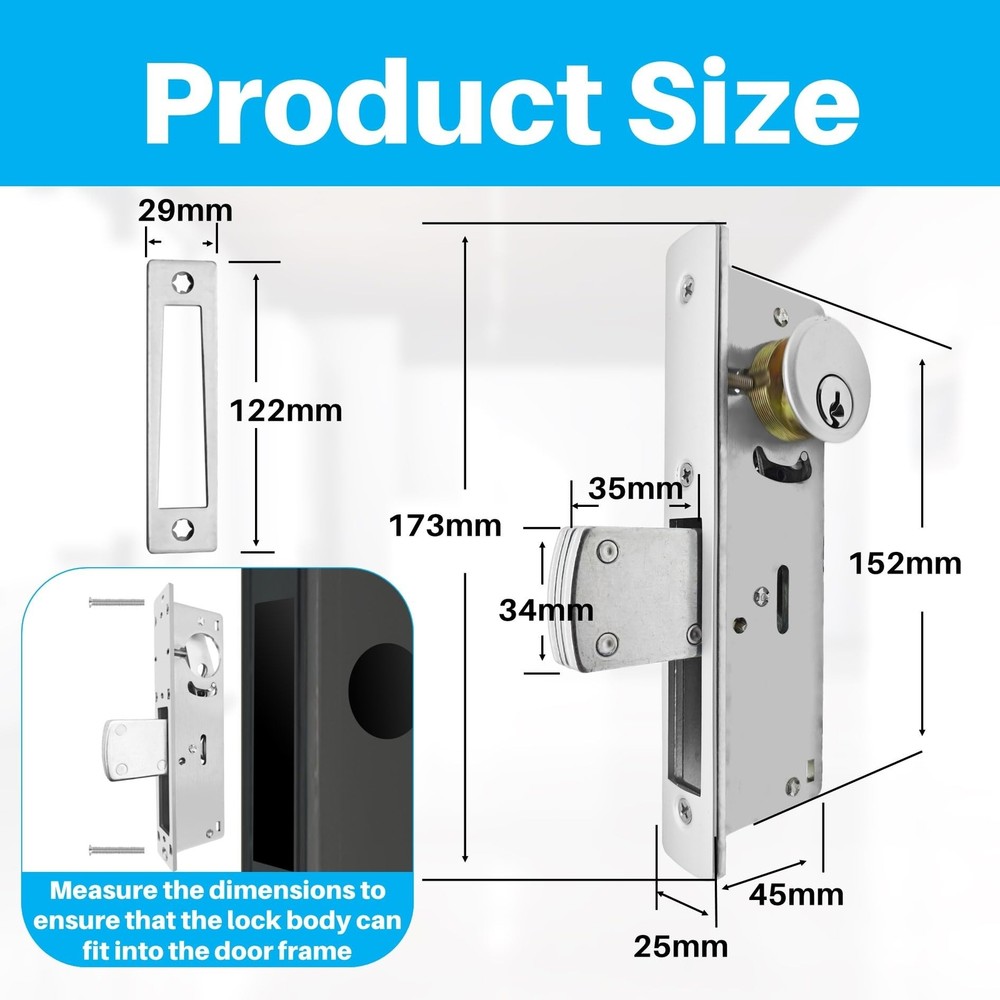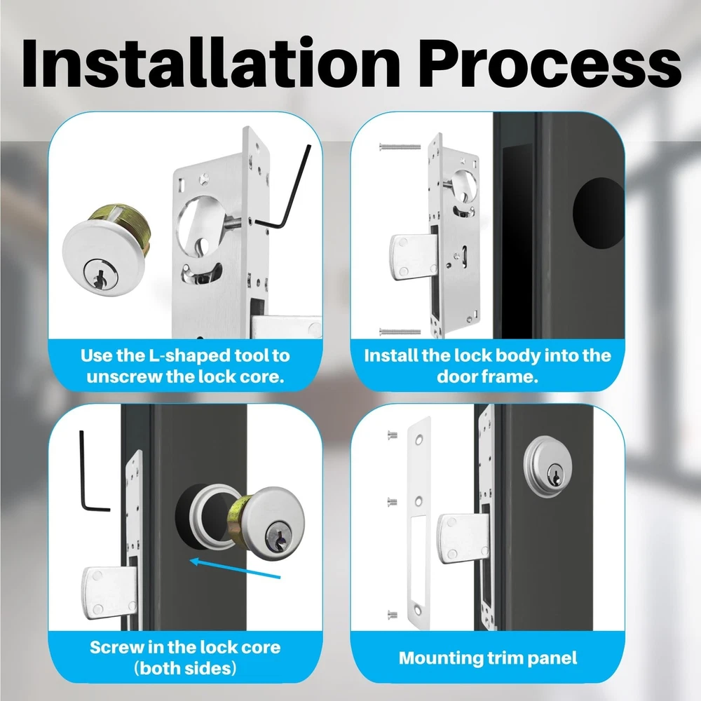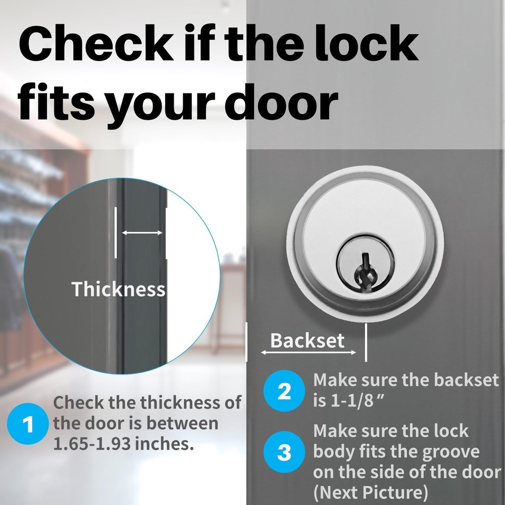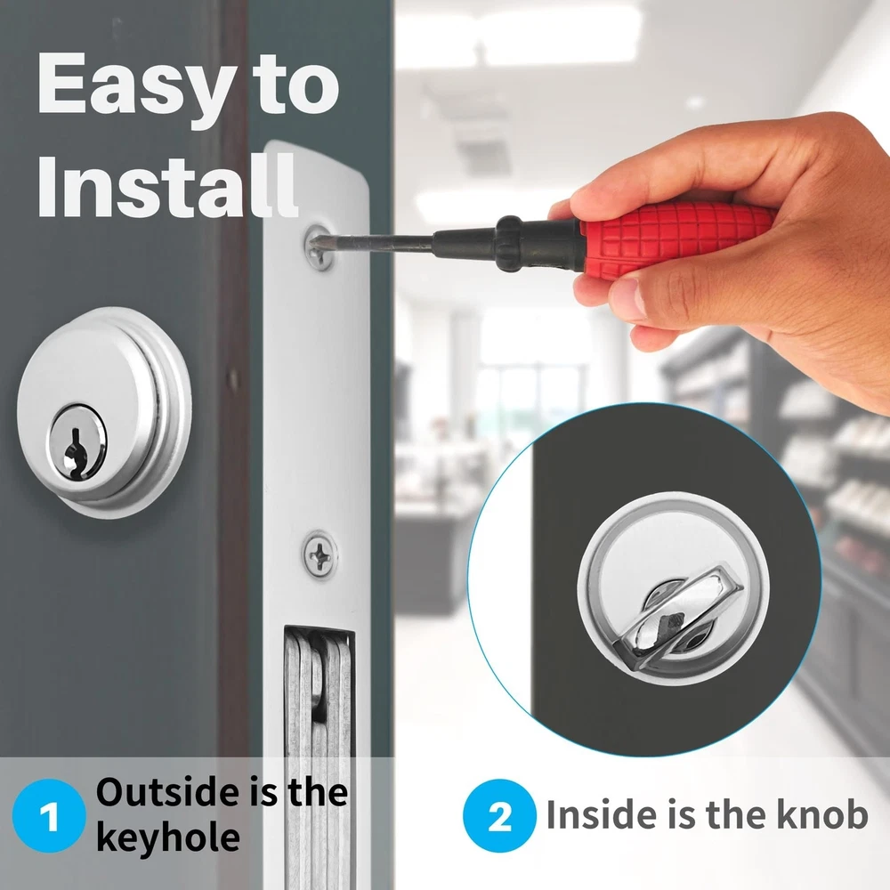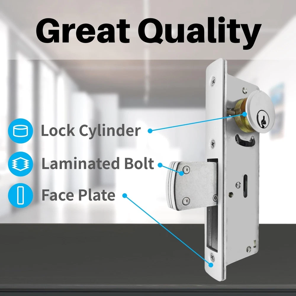 Storefront Door Mortise Lock Swing Deadbolt, Commercial Door Locks with Double Cylinder Deadbolt, Door Lack Replacement Parts for Storefront Entry Doors (1-1/8inches Backset),1-Year After-Sale Product Details Brand: Idelen Special Feature: corrosion resistance Lock Type: storefront mortise door lock Item dimensions L x W x H: 7.2 x 2.59 x 1.96 inches Material: Brass, Zinc Brand: Idelen Special Feature: corrosion resistance Lock Type: storefront mortise door lock Item dimensions L x W x H: 7.2 x 2.59 x 1.96 inches Material: Brass, Zinc Recommended Uses For Product: Securing commercial and exterior doors in various retail environments Style: Contemporary Color: sliver Number of Pieces: 2 Finish Type: Unfinished Included Components: Aluminum door latch lock body (with decorative panel), American lock core (with decorative gasket), lock dox box (with lock buckle), screw pack, keys(one pack) Controller Type: Hand Control, Mechanical knob Shape: Rectangular prism Control Method: App Connectivity Protocol: No Model Name: storefront door lock mortise lock, commercial lock, mortise lock set exterior door, commercial door lock Manufacturer: BingZeno Item Weight: 1.94 pounds Product Dimensions: 7.2 x 2.59 x 1.96 inches Country of Origin: China Item model number: storefront door lock mortise lock Finish: Unfinished Special Features: corrosion resistance Batteries Included?: No Batteries Required?: No Date First Available: July 2, 2024 Versatile Application for Various Door TypesThis storefront door lock is ideal for doors ranging from 1.65 inches to 1.93 inches (42-49mm) thick, including aluminum storefront doors, sliding storefront doors, and glass doors, making it suitable for a wide range of applications. The standard thickness of commercial and exterior doors is generally 1.75 inches (44mm). Therefore, this commercial door lock can be adapted to most storefront doors. Robust and Secure Lock Core DesignFeaturing a five-layer laminated steel bolt and concealed hardened steel pins, the storefront door lock mortise lock enhances core strength and stability. Operate this commercial locks for doors effortlessly with either a key or knob. As you turn the key or knob, internal metal bolts of the mortise lock retract or extend, providing effective security for your shop with strong anti-theft capabilities. Excellent Quality and DurabilityThe majority of this storefront door mortise lock is crafted from corrosion-resistant aluminum, offering high strength. The commercial locks core, composed of zinc alloy, provides corrosion resistance, wear resistance, and deformation resistance. The keys are made of copper, ensuring rust resistance, aesthetic appeal, and reducing wear on the lock core. Packaging and Easy InstallationThis commercial door lock set includes: Aluminum door latch lock body (with decorative panel), American lock core (with decorative gasket), lock dox box (with lock buckle), screw pack, keys(one pack). Note: When installing parts with keyholes and knobs, ensure the keyhole and knob positions face the metal bolts; otherwise, they may not function properly; use the smallest screws for the lock body decorative faceplate, first screw on all screws, then secure to prevent warping. For more details, refer to the "Product Description" section. Quality After-SalesThe mortise lock set exterior door with deadbolt comes with a one-year after-sale. If you're not satisfied with this commercial door lock, we offer easy returns and exchanges. Should you encounter any installation issues, please tell us, and we'll respond within 24 hours. Buy with confidence.