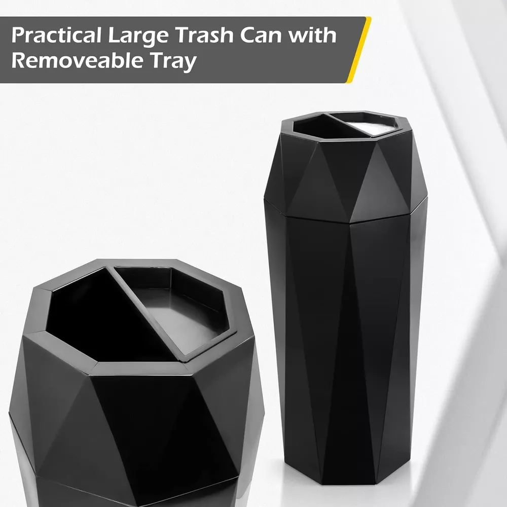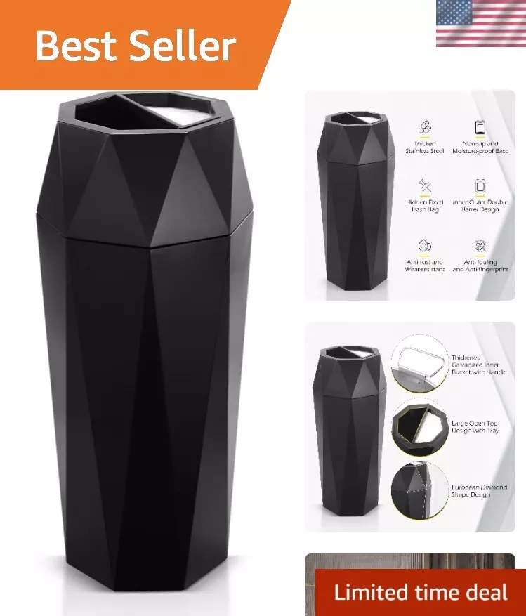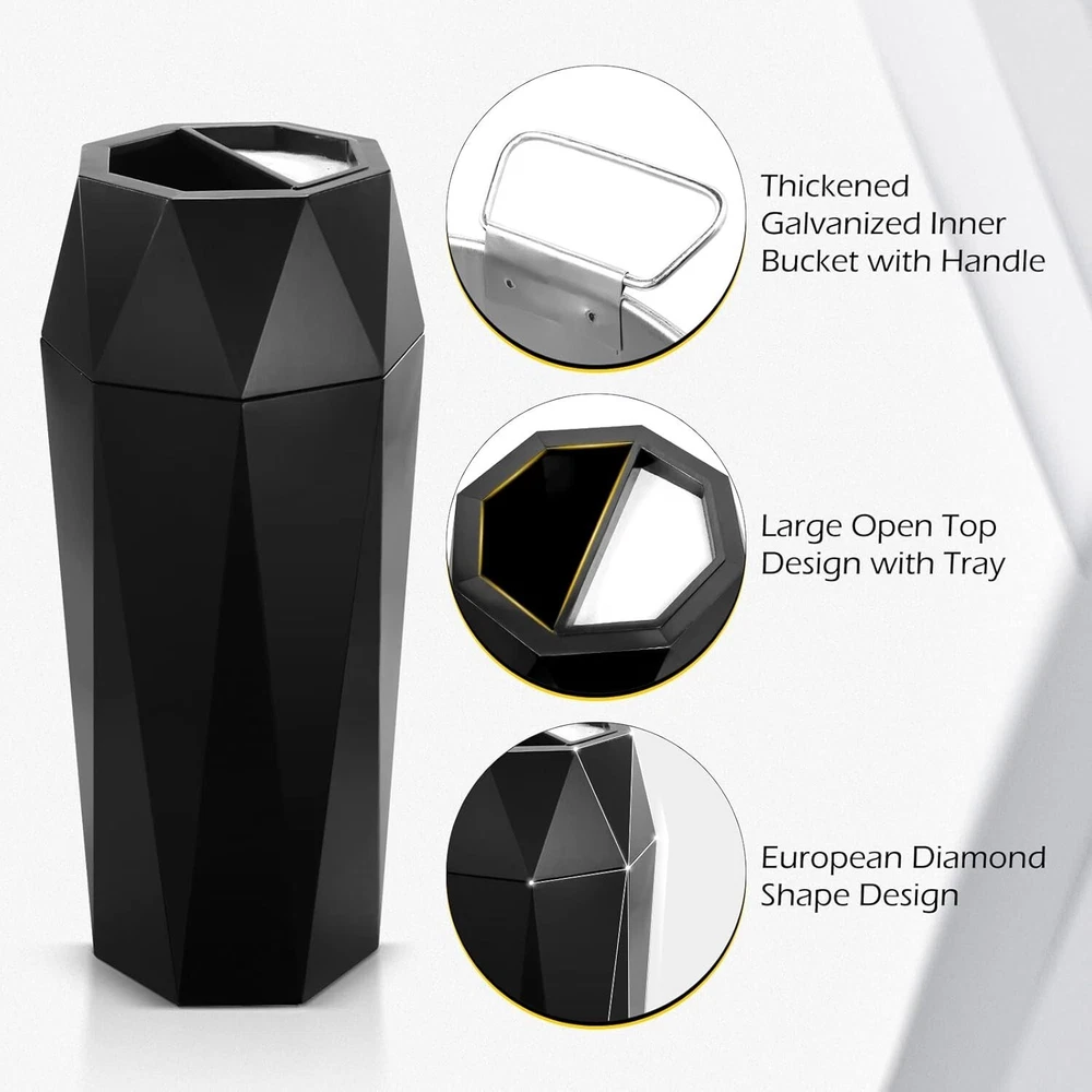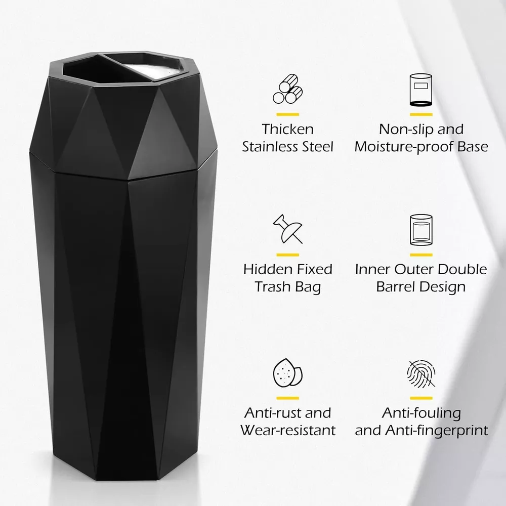 Commercial Trash Can Outdoor Garbage Can with Lid Indoor Large Trash Bin Stainless Steel Industrial Waste Container Black Stylish Trash Can Commercial- European diamond shape design commercial trash can, the angular open top design and the bottom surface of the garbage can with lid is glazed non-slip and moisture-proof treatment. Widely used in high-end shopping malls, hotels or office buildings. 13 Gallons Stainless Steel Trash Can- The outdoor trash can with lid is 13 gallons, high inches and diameter is inches. The 13-gallon trash bags in the supermarket can be perfectly used for our big trash bin. The large-capacity commercial waste container can definitely satisfy your daily needs. Garbage Bag Hidden and Fixed- The garbage bag can be fixed on the top of the inner stainless steel garbage can. It is easy and quick to replace the trash bag without lifting the inner trash can. The top cover makes the garbage bag better hidden, keeping the stainless steel trash bin with a clean and beautiful appearance. Durable and Sturdy- The industrial large garbage can is made of high-quality stainless steel, strong and durable; The thick galvanized inner barrel garbage cans have strong anti-corrosion and anti-rust capabilities. Metal trash can with lid, easy to clean. Suitable for Various Places- Covered trash can outdoor is suitable for residential or various commercial purposes. Stainless steel trash can be placed in office buildings, apartments, shops, supermarkets or hotels, which make the surrounding environment fresher and cleaner. Trash Can with Lid Commercial Trash Can with Lid; Open Top Stainless Steel Garbage Bin; Industrial Trash Bin with Ashtray.