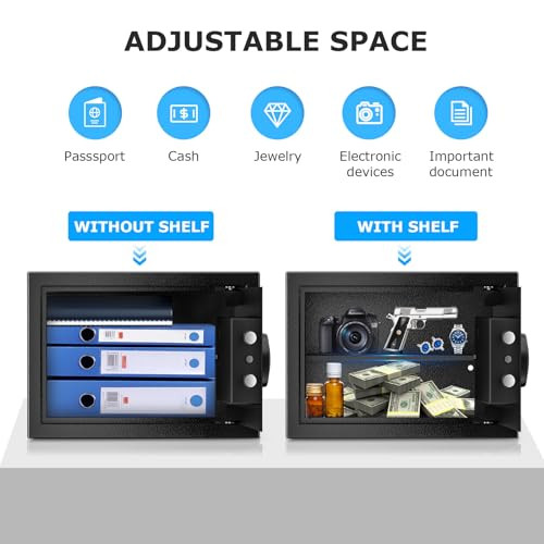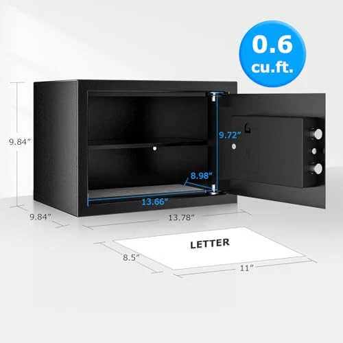 Return Policy Fast Delivery Trusted seller Safe, 0.6 Cubic Safe Box with Electronic Keypad, Removable Shelf, for Valuables Jewelry and Documents in Home, Hotel, or Business, 9.84"D x 13.78"W x 9.84"H Product Description SIZE: 13.78* 9.84* 9.84 inches. (The power bank and charging cable are not included) 0.6 CUBIC FEET CAPACITY: The lockable storage box comes equipped with a removable shelf, offering flexible storage options for consumers' valuables; It can securely store important documents and jewelry with ease SECURE AND DURABLE: Constructed with SPCC steel, this safe is strong and reliable. It features two 18mm diameter active locking bolts, providing maximum security and protection for your valuables; The safe has undergone rigorous testing, proving its outstanding durability and material quality CONCEALED AND FLEXIBLE: The safe box has a felt-lined bottom to avoid scratches on the stored items; It also features pre-drilled installation holes and comes with two expansion screws for fixing securely inside a wall cabinet; This makes it compatible for use in various settings including, but not limited to homes, offices, and hotels THREE WAYS TO OPEN: 's safe box offers three flexible and easy-to-use ways to open it; You can access it by using your personal code or open with the emergency override keys (the safe box is equipped with two keys), or charging the battery box with a type-C cable to avoid dead batteries or forgotten passcodes FCC CERTIFIED AND PROFESSIONAL SUPPORT: Trust in the FCC-certified quality of our product, which is built to last and deliver reliable performance over time; The professional safe box provides trustworthy customer service Shipping Returns Payment Shipping Shipping is FREE to all addresses other than APO/PO boxes in the lower 48 states. All our stock ships from US-based warehouses. Shipped via USPS or UPS (depending on location and package weight) Unless stated otherwise, all orders will ship within 24-72 hours of your payment being processed. Check our feedback to see the great reviews of FAST shipping we offer. Returns Seller does not accept returns Payment We currently accept payment via eBay managed payments only. Once payment is cleared, we will dispatch your shipment within 1-3 business days. Please refer to the "Shipping" tab for more information regarding shipping speed to your destination.