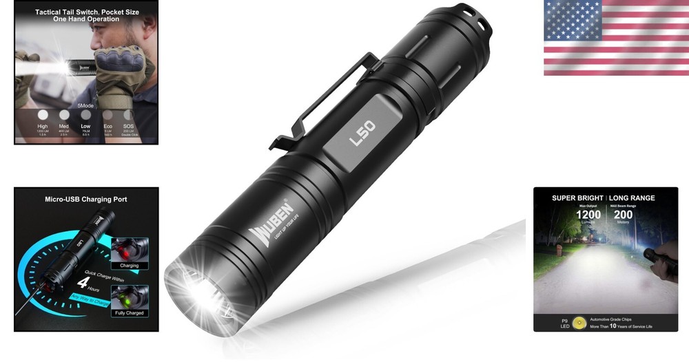 This flashlight is a game-changer! The 1200-lumen brightness cuts through darkness effortlessly, and the 656-foot throw is impressive. Love the five versatile modes—perfect for emergencies or everyday use. Rechargeable via USB makes it super convenient, and the lightweight design fits easily in a pocket or bag. Durable aluminum body feels premium, and the beam stays strong even in tough conditions. Ideal for camping, hiking, or just keeping in the car. Highly recommended for anyone who needs reliable light!