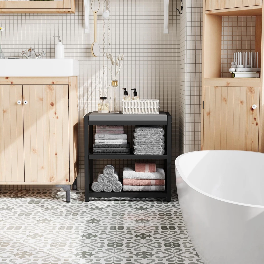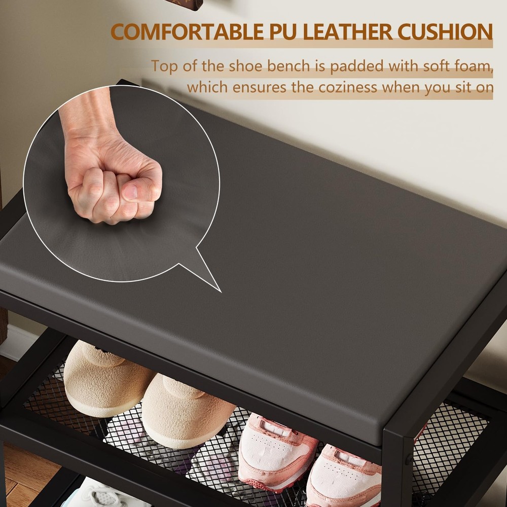 Shoe Bench Shoe Rack Storage Bench Entryway Bench Shoe Shelf with Seat Cushion, Stable Shoe Organizer for Entryway Comfortable Seats: Our Shoe Bench is designed with a detachable cushion to provide you with a comfortable shoe changing experience. The cushion is padded with thickened sponge and 1" thick, high-resilient, high-density foam, ensuring that you can sit on it comfortably without deformation. Strong Support: This shoe rack bench is built with a robust powder-coated steel frame, offering firm and reliable support. Say goodbye to hard, stone-like stools and try our comfortable Small Shoe Bench! It not only provides durability but also has a maximum static load of 300 lb, making it a strong seating option for your needs. Enough Storage Space: Organize your home in style with our Shoe Bench! Whether you need stylish storage for your foyer, entryway, or end-of-bed living room or bedroom, this practical shoe rack bench is the perfect solution. Its ample storage space allows you to neatly organize shoes, bags, books, and more, keeping your space clutter-free. Effortless Clean, Easy Assembly: Our upholstered Shoe Bench features an easy-to-clean synthetic leather surface, ensuring simple maintenance. Additionally, it comes with clear and straightforward instructions, along with an assembly tool, making setup a breeze. Spend less time on maintenance and assembly, and more time enjoying the convenience of our shoe rack bench. Satisfaction Customer Service: Your satisfaction is our top priority. In the rare event of rusted items due to wet weather, we have enhanced our quality control measures. If you open the box and find any rusted parts, please contact us immediately. We are committed to resolving the issue by sending you a new one or providing a 100% refund, ensuring your complete satisfaction.