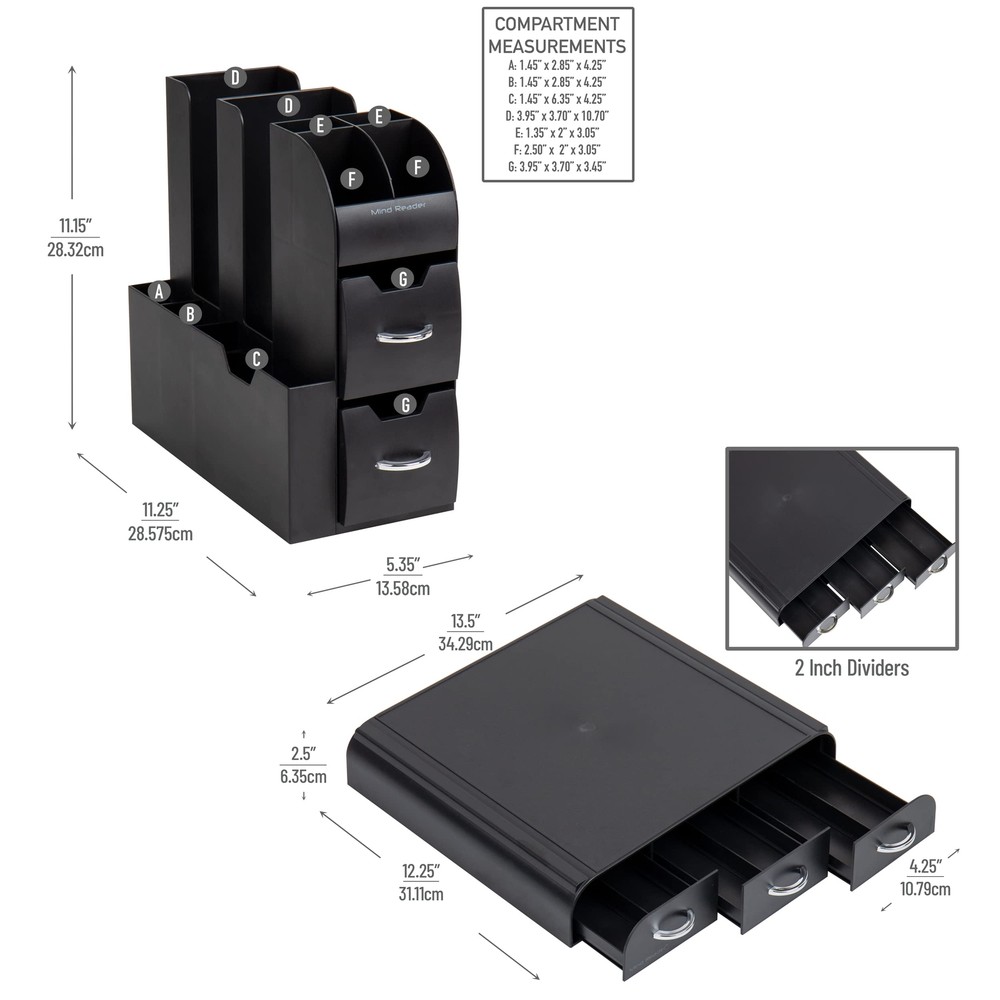 Versatile Storage Solution: With a total of ten compartments and three drawers spread across two matching pieces, this set offers ample storage space to organize your coffee and condiments effectively Optimized Space Usage: The stackable design of the flat pod storage drawer provides a sturdy base for your coffee maker, while the slim tower organizer fits snugly on top, maximizing your counter space and creating an efficient setup Secure and Stable: Designed with a non-slip feature, both the drawer and condiment caddy stay securely in place during usage, preventing any accidental slips or spills Lightweight and Durable: Made from food-safe materials, this sleek set is lightweight, weighing only 1 pound (453 grams), making it easy to move and reposition as needed. Despite its lightweight design, it is built to withstand daily use Compact Dimensions: The pod drawer measures 13.5 inches long x 12.25 inches wide x 2.5 inches tall (34.29 x 31.11 x 6.35 centimeters), the condiment caddy is 5.35 inches long x 11.25 inches wide x 11.15 inches tall (13.59 x 28.57 x 28.32 centimeters)